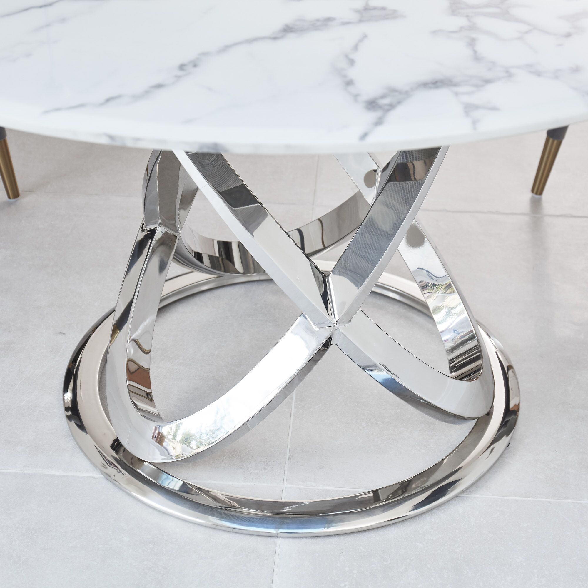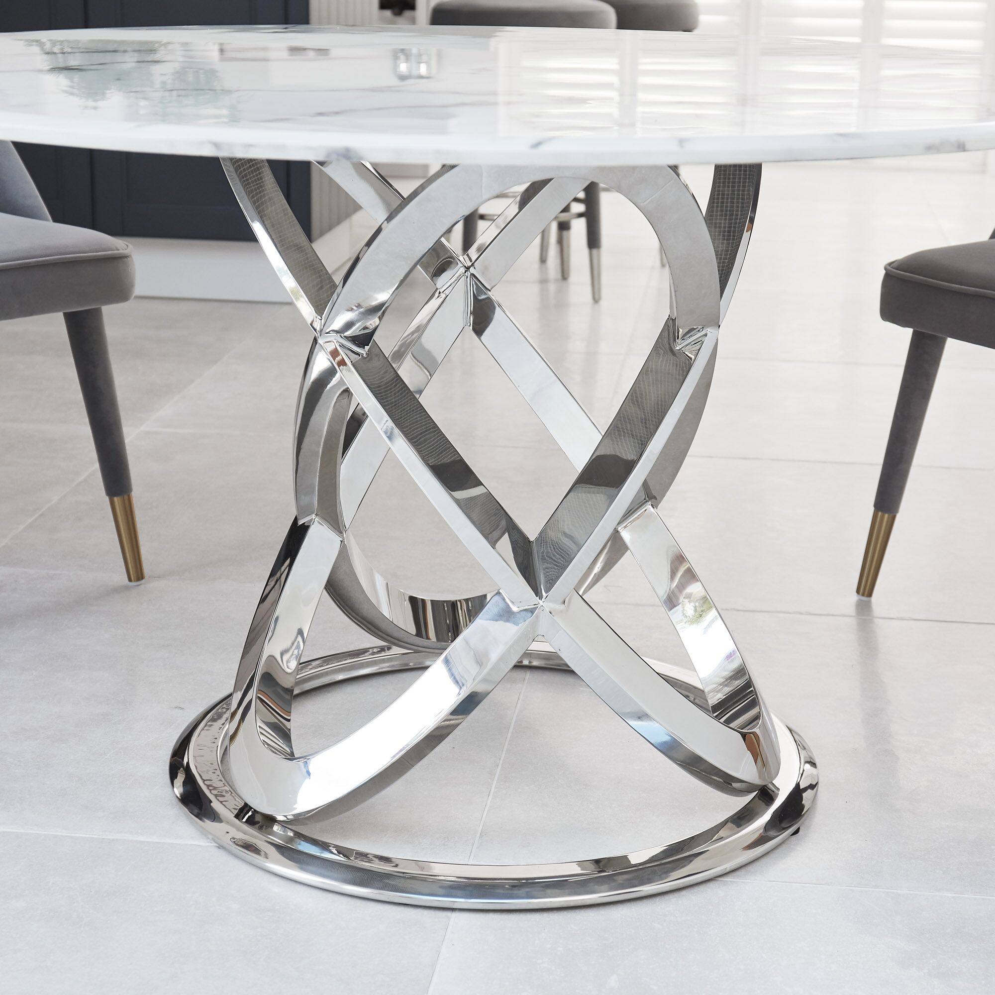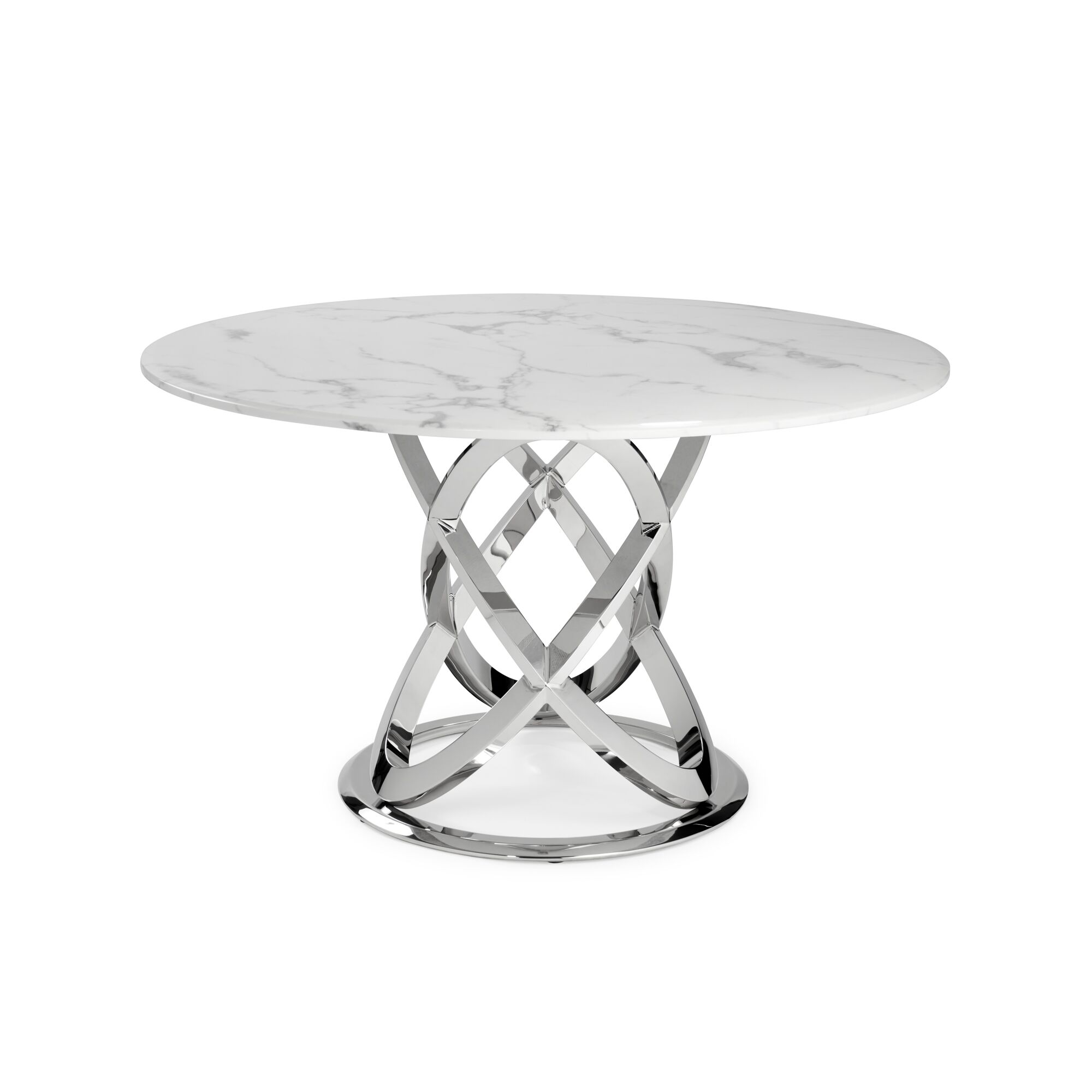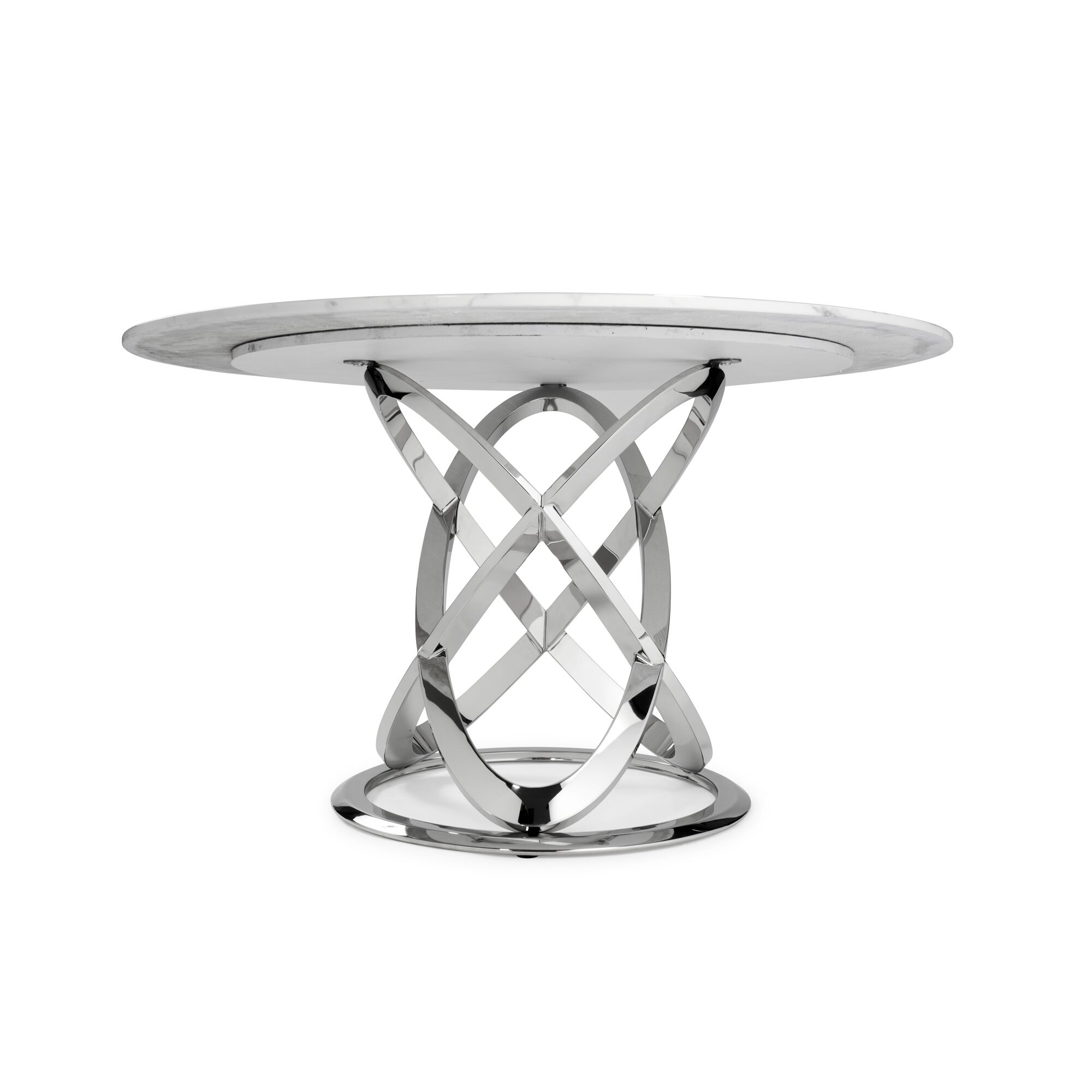 This circular Marble dining table is sure to make a statement in any room that it is placed in, this table features a white and grey reconstituted marble 18mm marble beveled top with a sealed finish and features an intertwining polished stainless steel circular base.