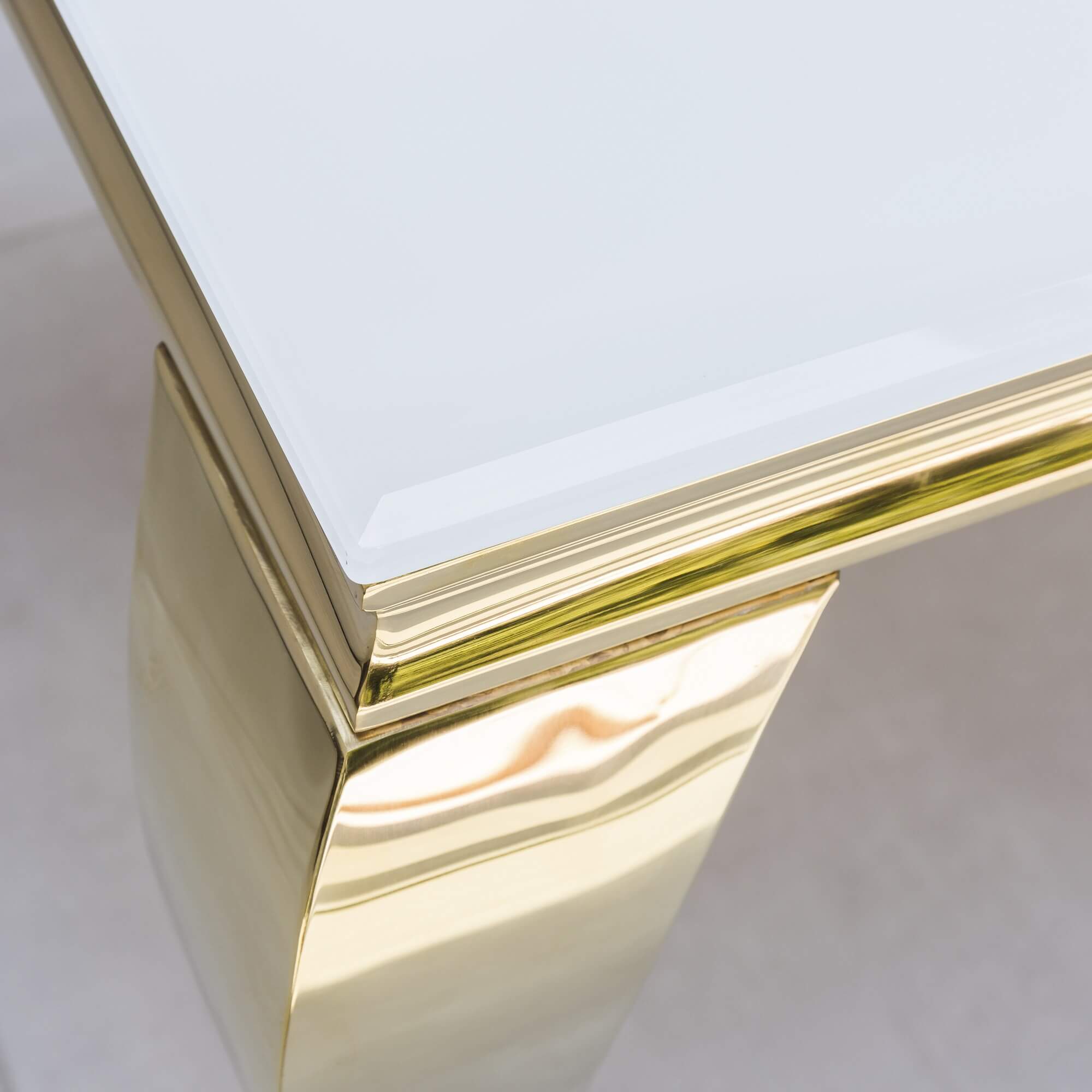 Embrace the style trend for glamour with this beautiful Louis Dining Table which features a beautiful white glass top along with a gold polished steel frame.