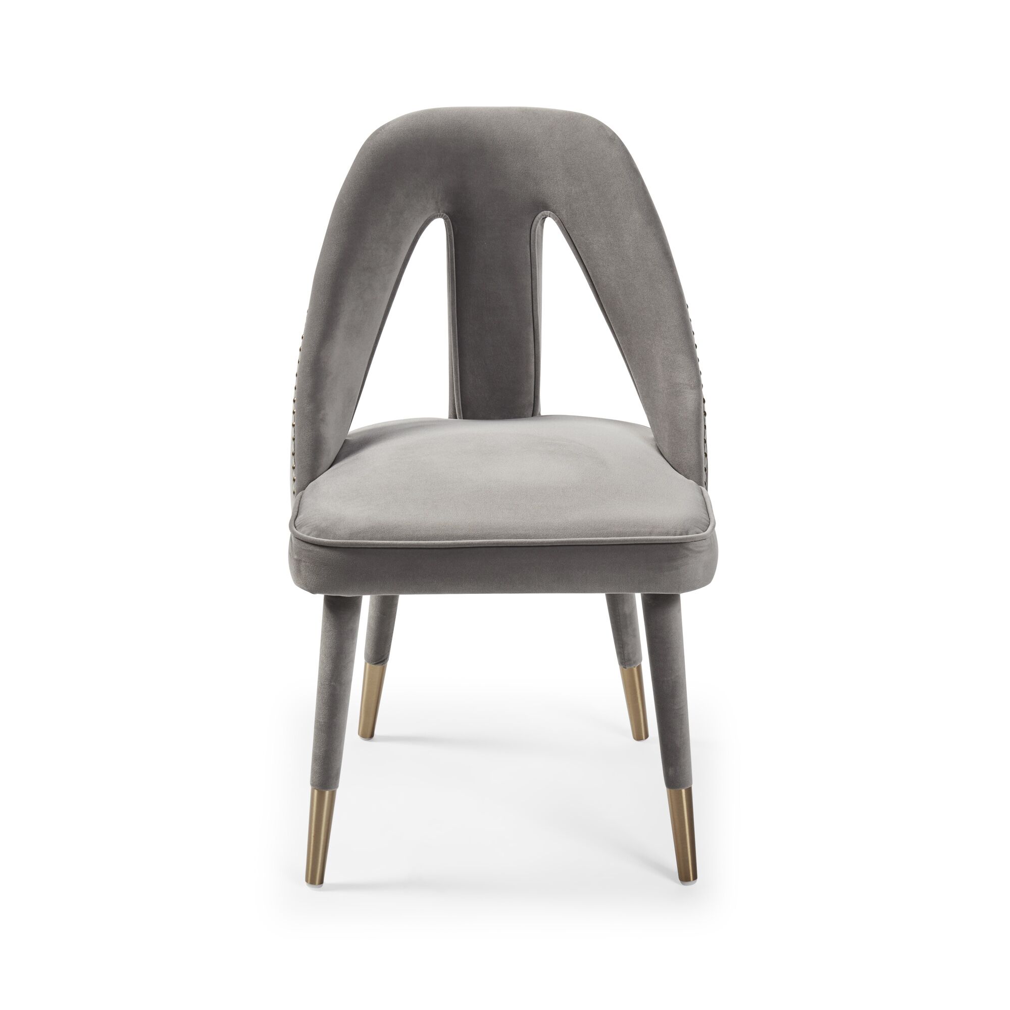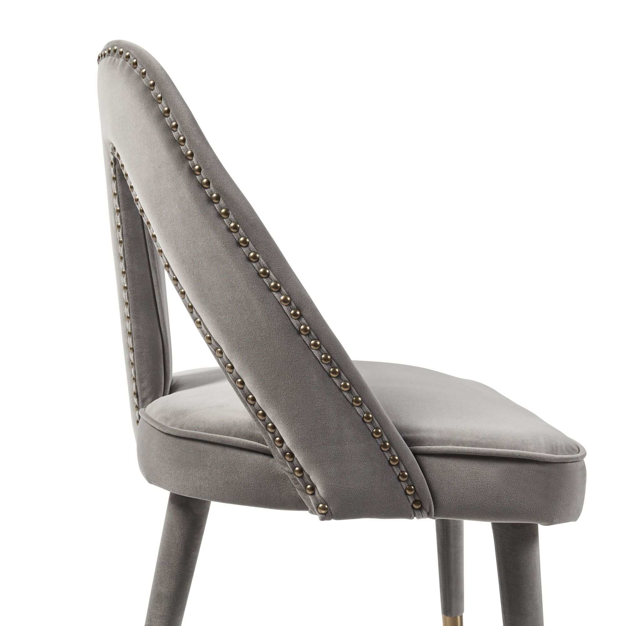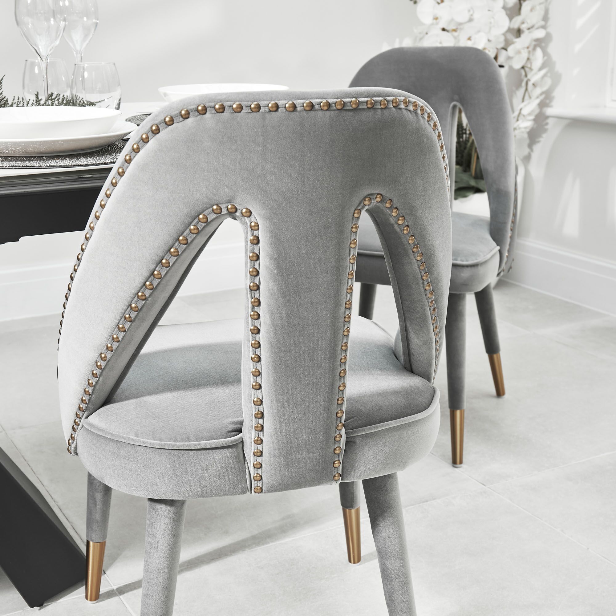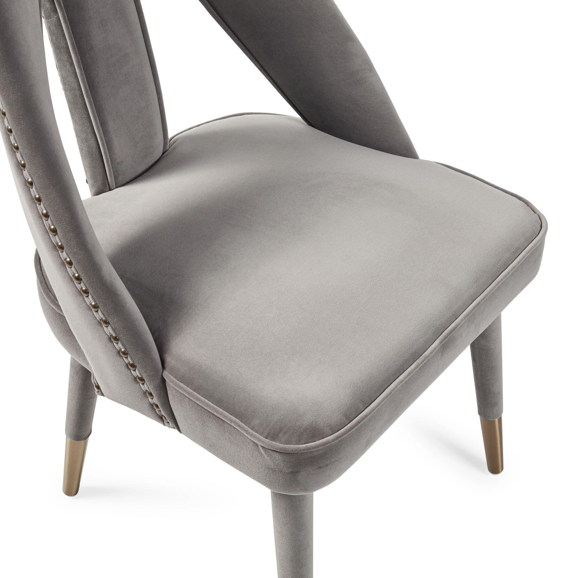 Elevate your dining experience to a brand new level with the stunning Alexandra chairs. Its fully upholstered frame, (no assembly required) showcasing a detailed nailhead trim and gold-tipped legs complement each other beautifully and its high density foam padding offers outstanding comfort and support. Upholstered in a luxurious grey velvet.