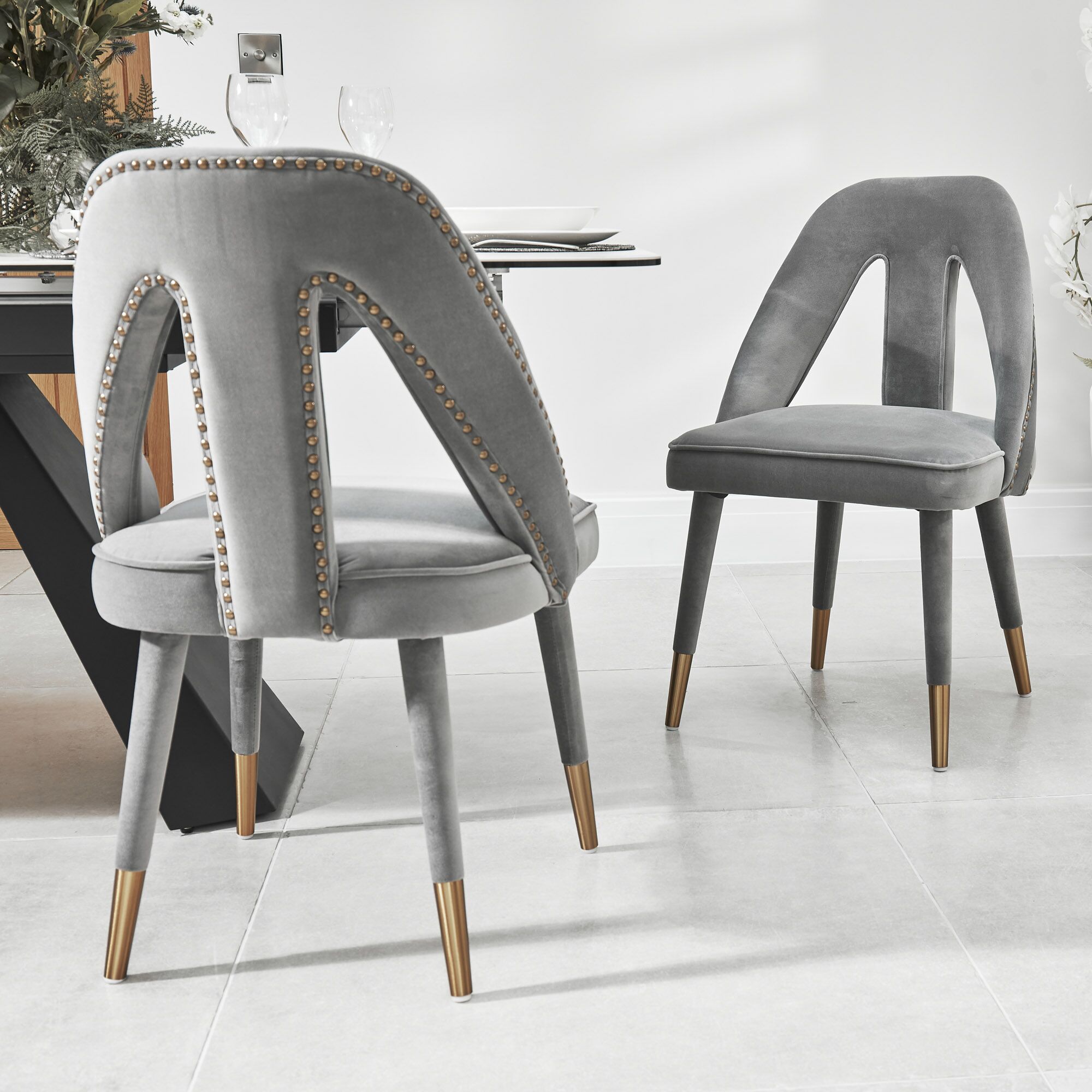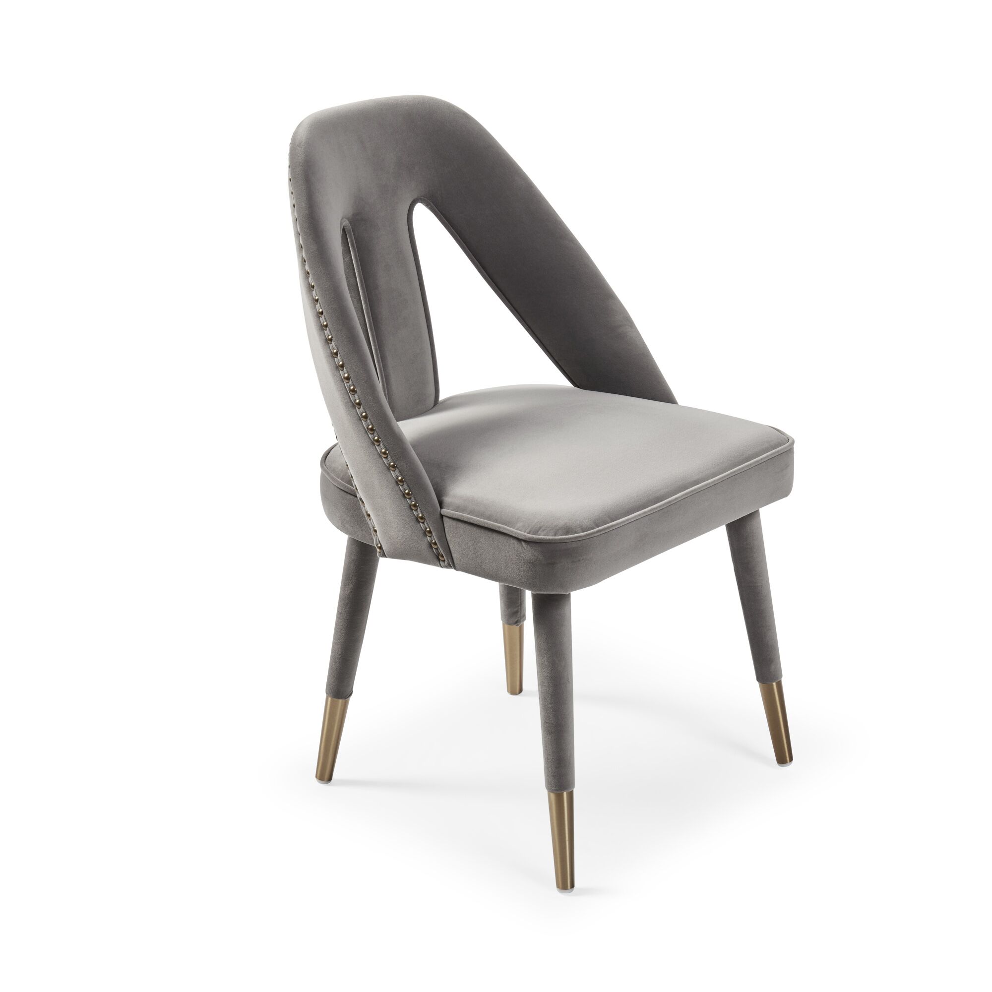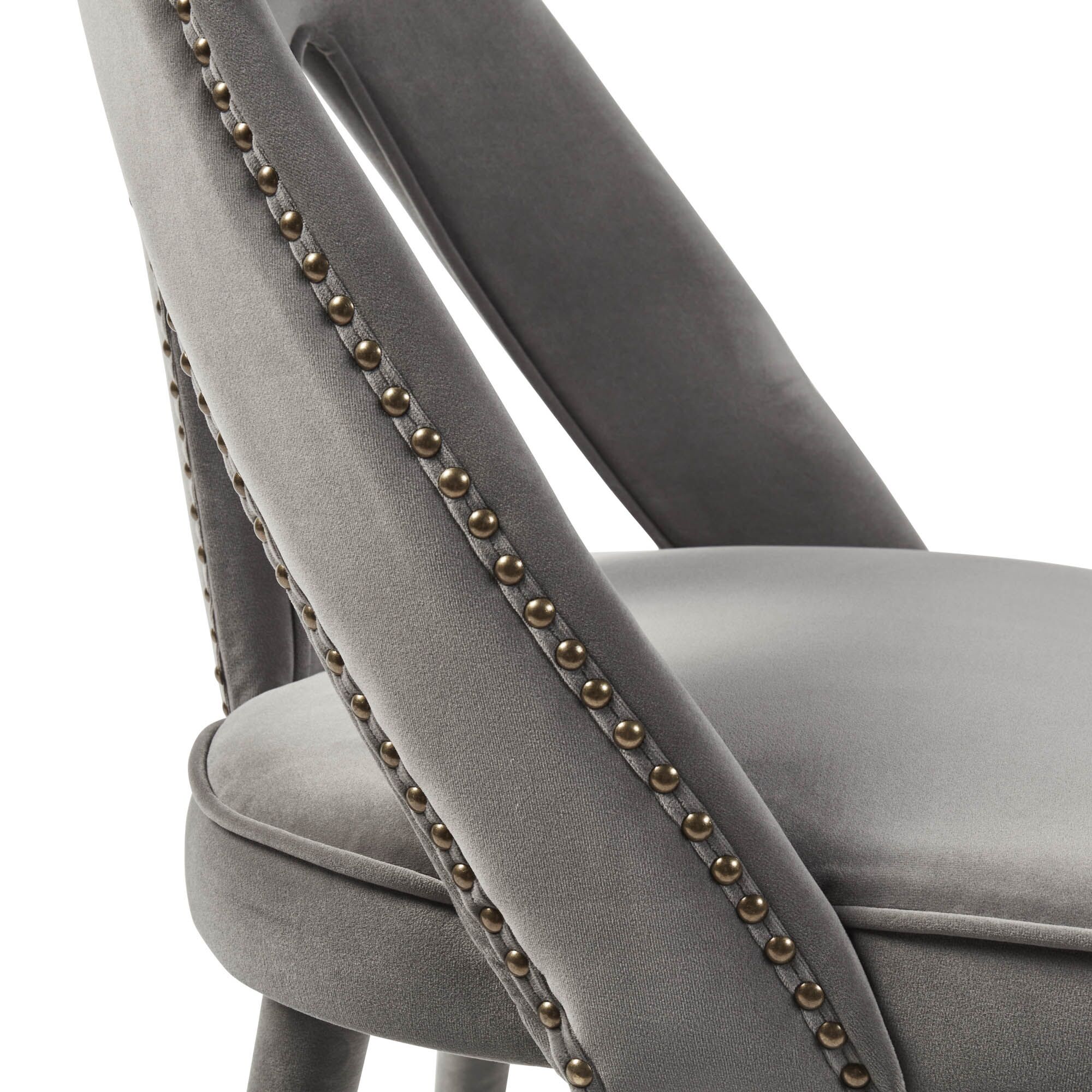 Elevate your dining experience to a brand new level with the stunning Alexandra chairs. Its fully upholstered frame, (no assembly required) showcasing a detailed nailhead trim and gold-tipped legs complement each other beautifully and its high density foam padding offers outstanding comfort and support. Upholstered in a luxurious grey velvet.
