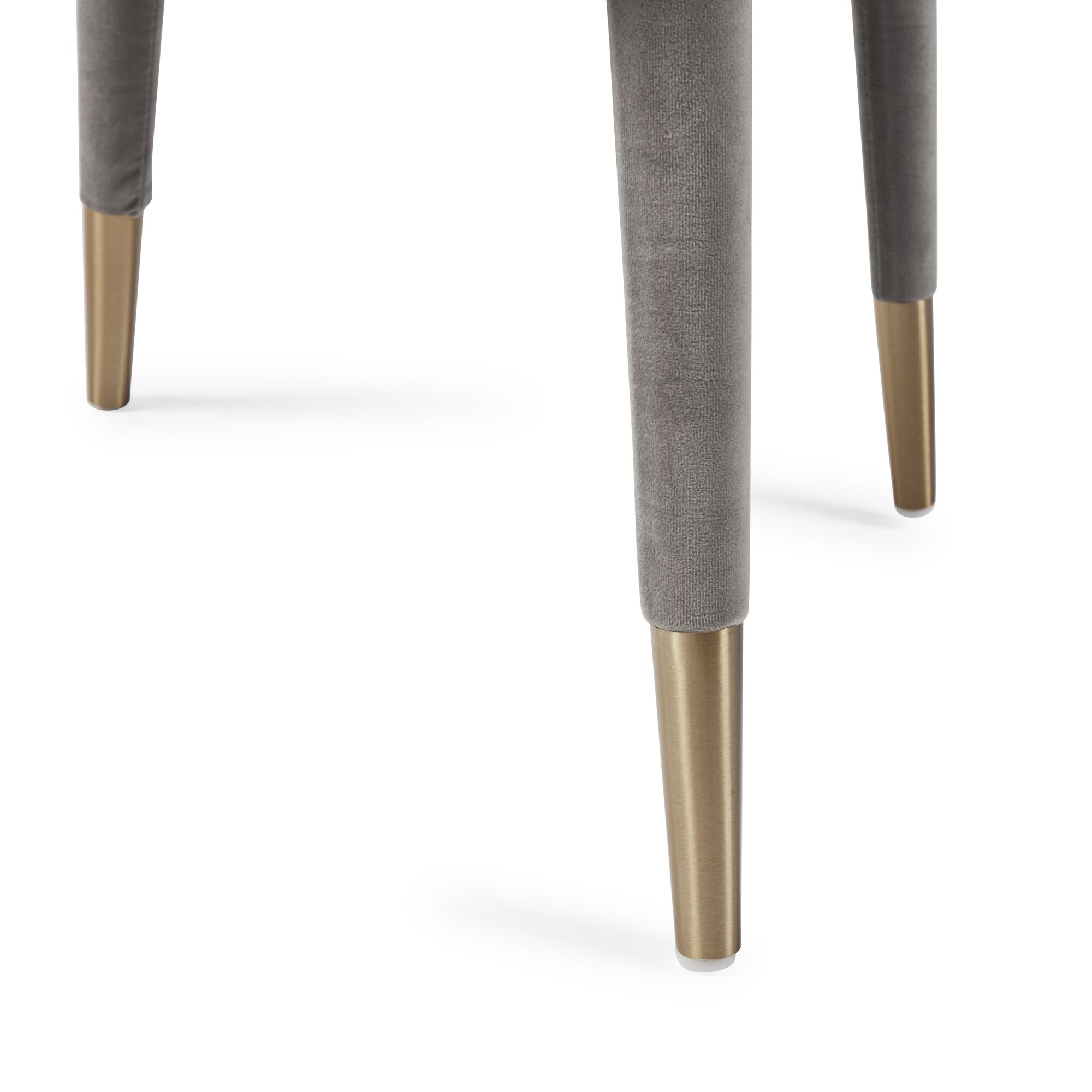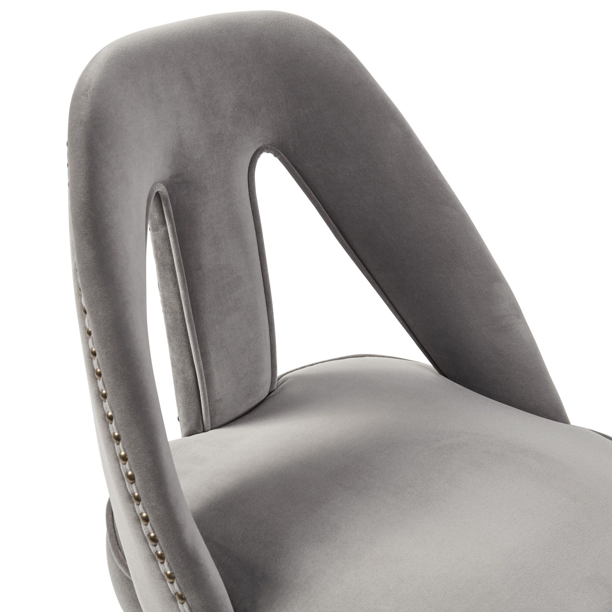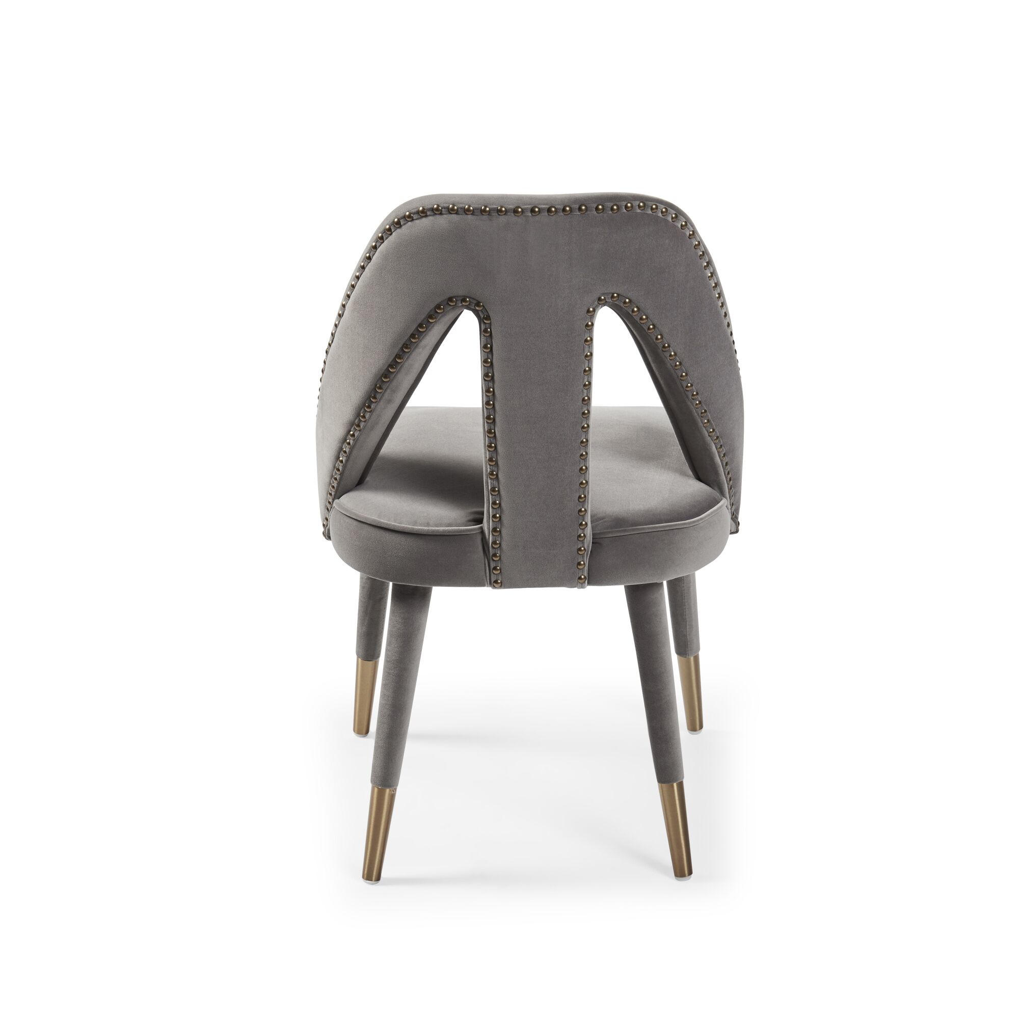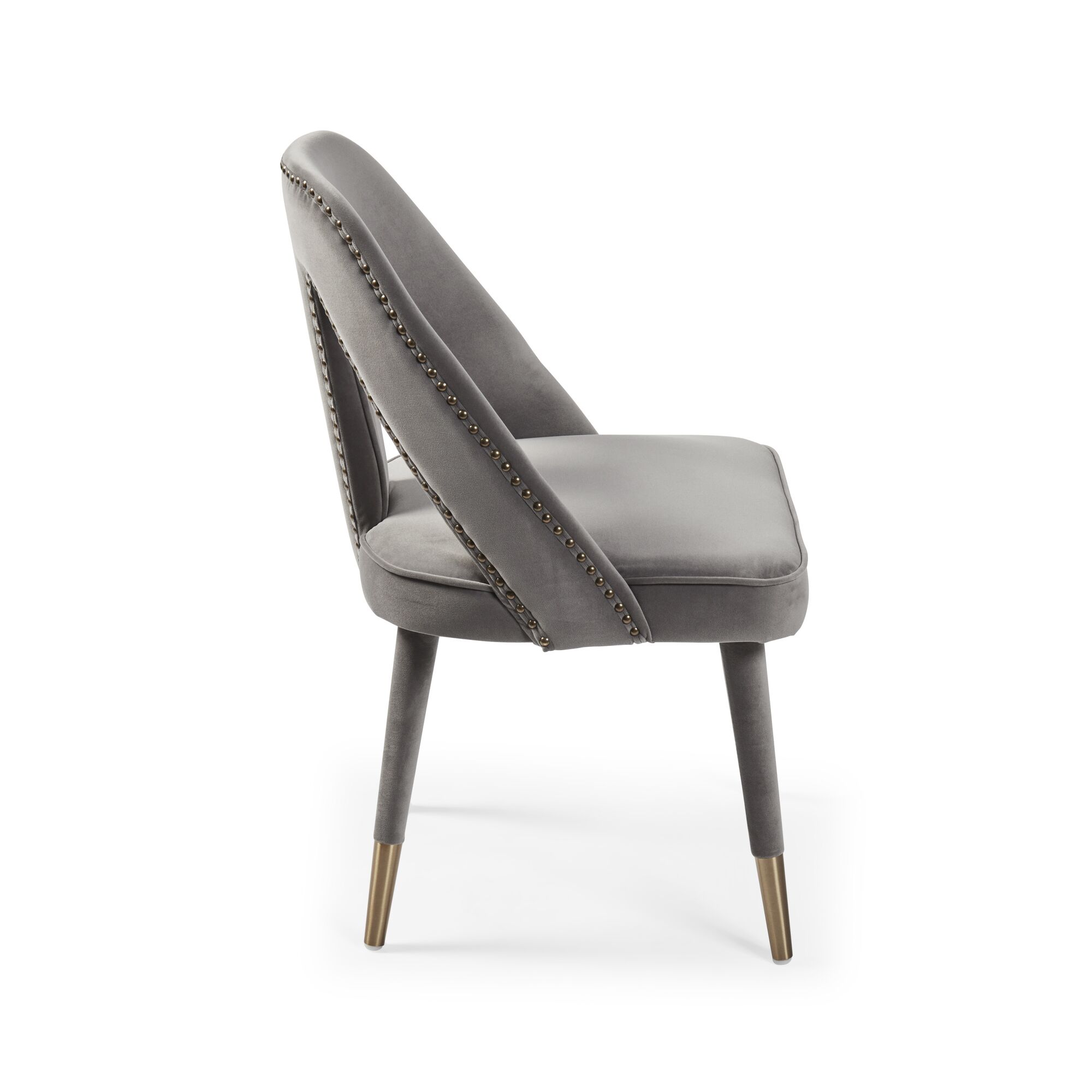 Elevate your dining experience to a brand new level with the stunning Alexandra chairs. Its fully upholstered frame, (no assembly required) showcasing a detailed nailhead trim and gold-tipped legs complement each other beautifully and its high density foam padding offers outstanding comfort and support. Upholstered in a luxurious grey velvet.