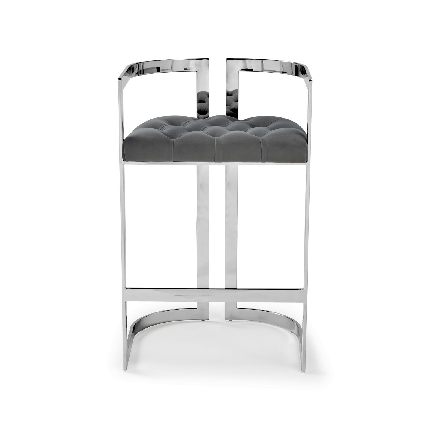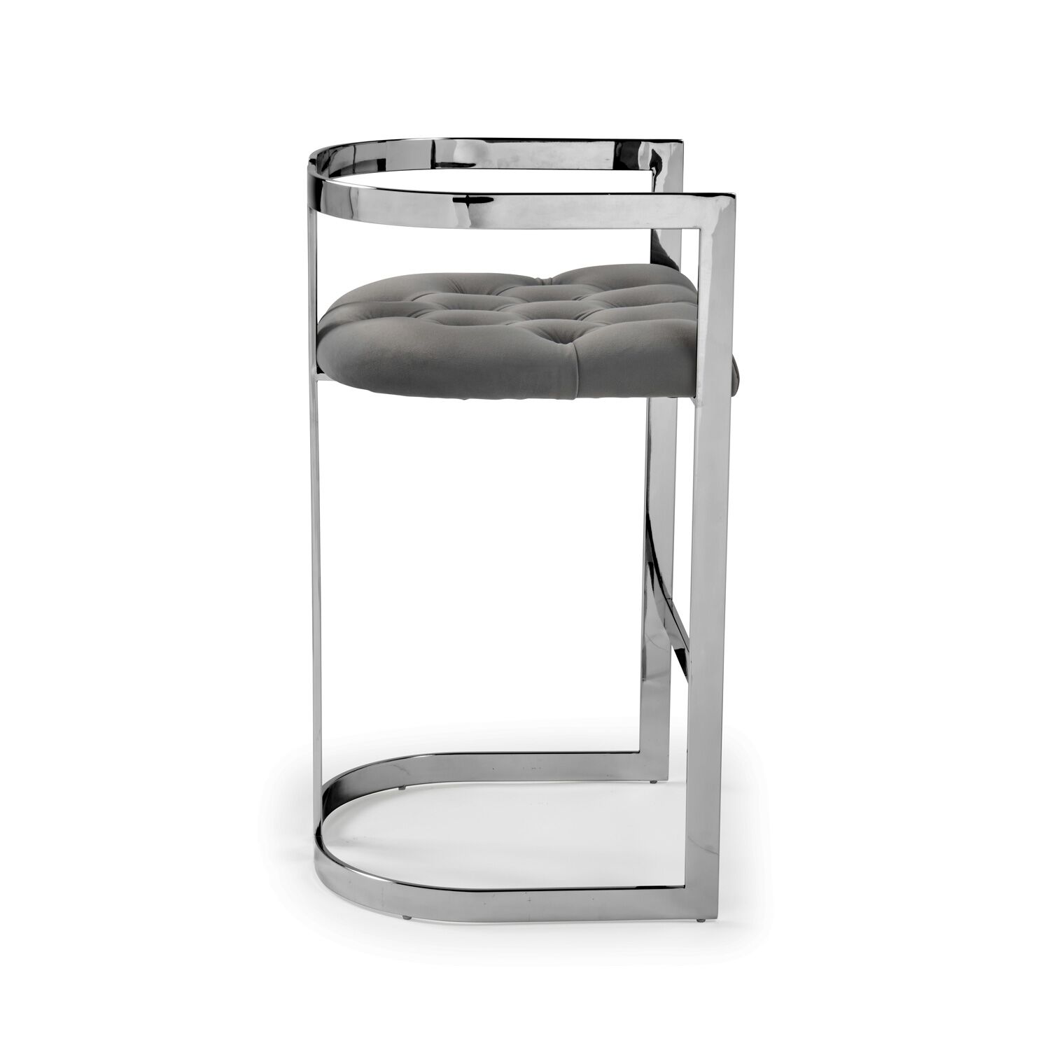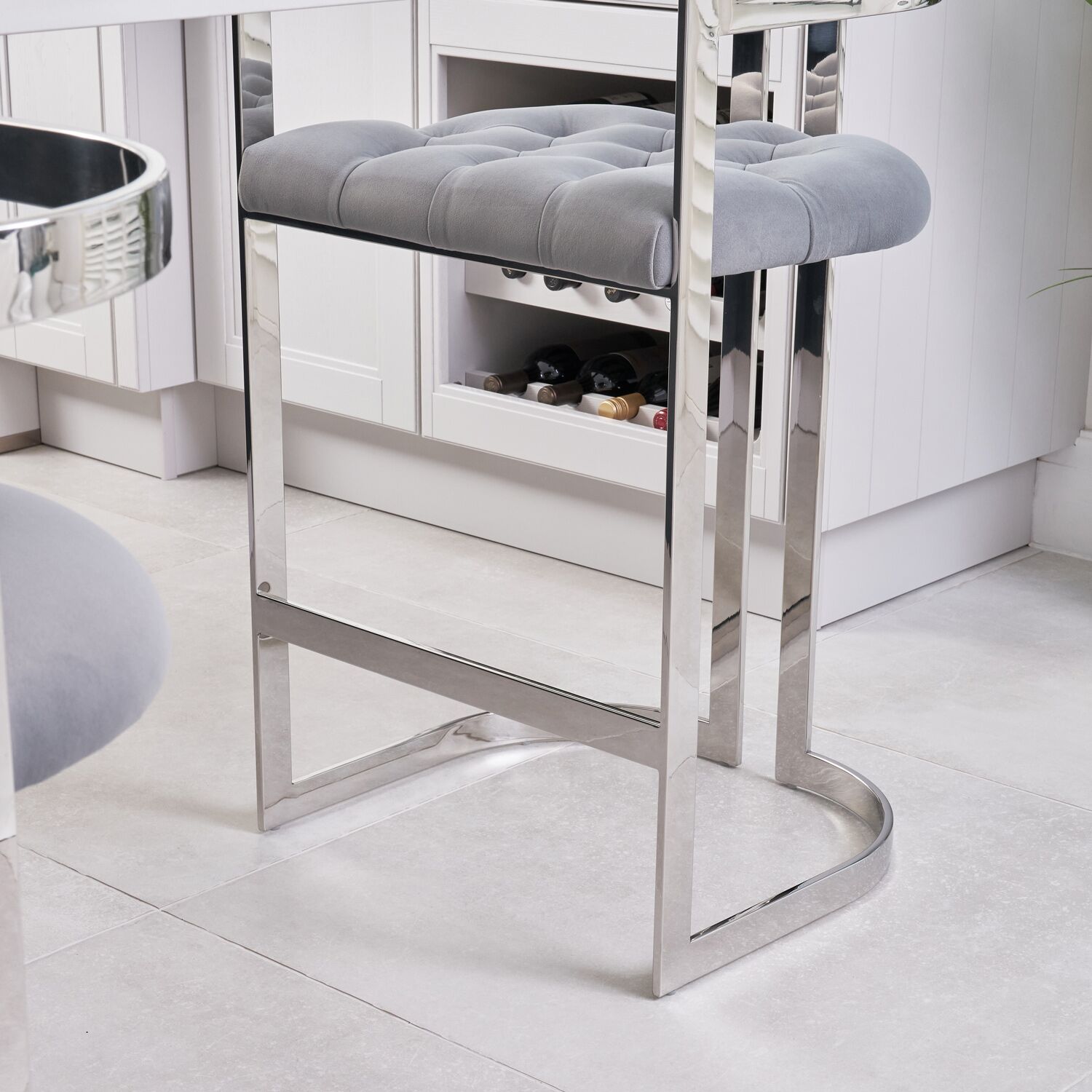 With its elegant curved polished steel backrest and deep button padding, this is a bar stool which offers supreme levels of comfort in addition to adding to the décor of the room. You can be sure that it will stand the test of time thanks to the beautifully crafted grey velvet upholstery which has been manufactured using a traditional weaving technique. This may take longer to craft, but is the only way of ensuring that levels of quality that Grosvenor Furniture demand as standard as it helps to ensure a surface which is both easy to clean and resistant to abrasion.