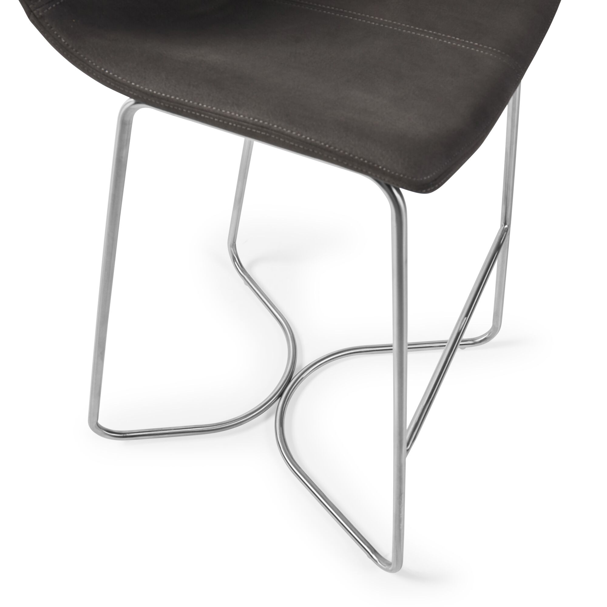 The brushed steel frame legs contrast perfectly against the charcoal fabric of the seat, and the steel guarantees its sturdiness.