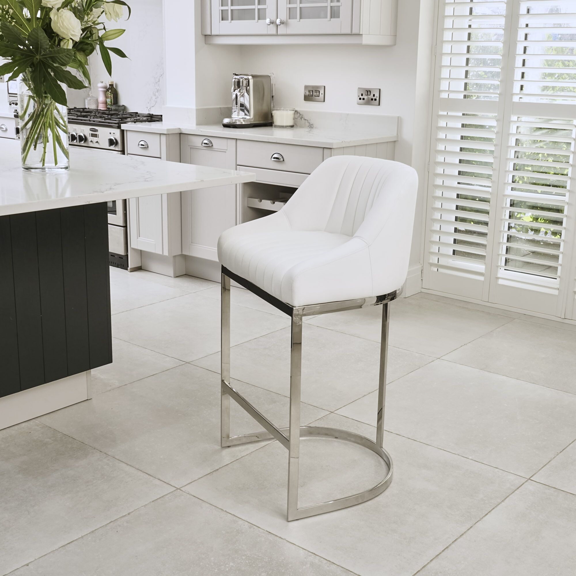 Enjoy a taste of the Mediterranean in your dining room with these clean cut Barcelona white velvet bar stools.