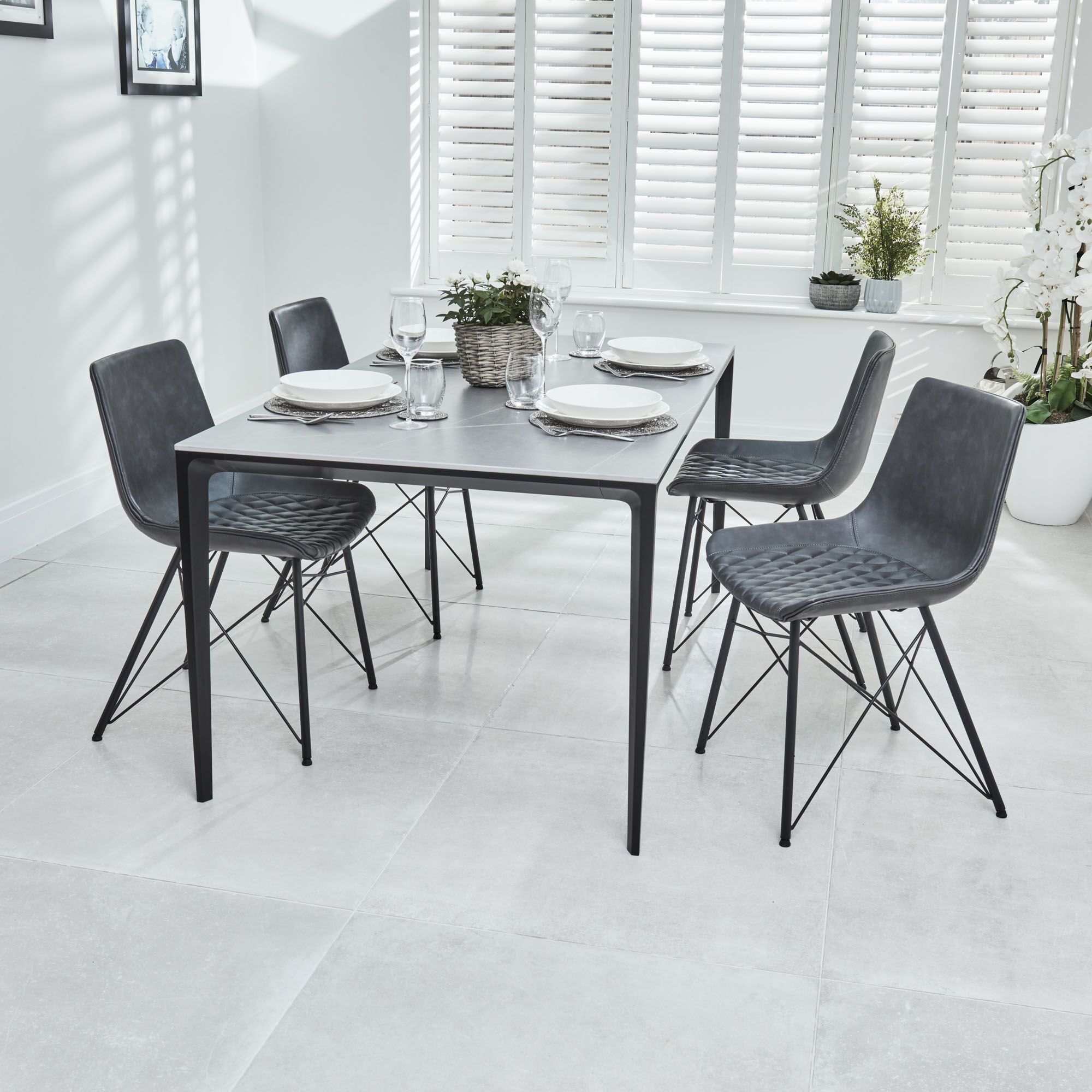 The dining table is complete with 4 Leon Grey Faux Leather Quilted Dining Chairs with its luxurious quilted faux leather charcoal padded seat, and neat stitching detail, the Leon dining chair is so much more than just somewhere to sit. This modern chair will make your space look great and you feel the comfort when sat in. The four powder coated legs have a stylish look to the base structure.