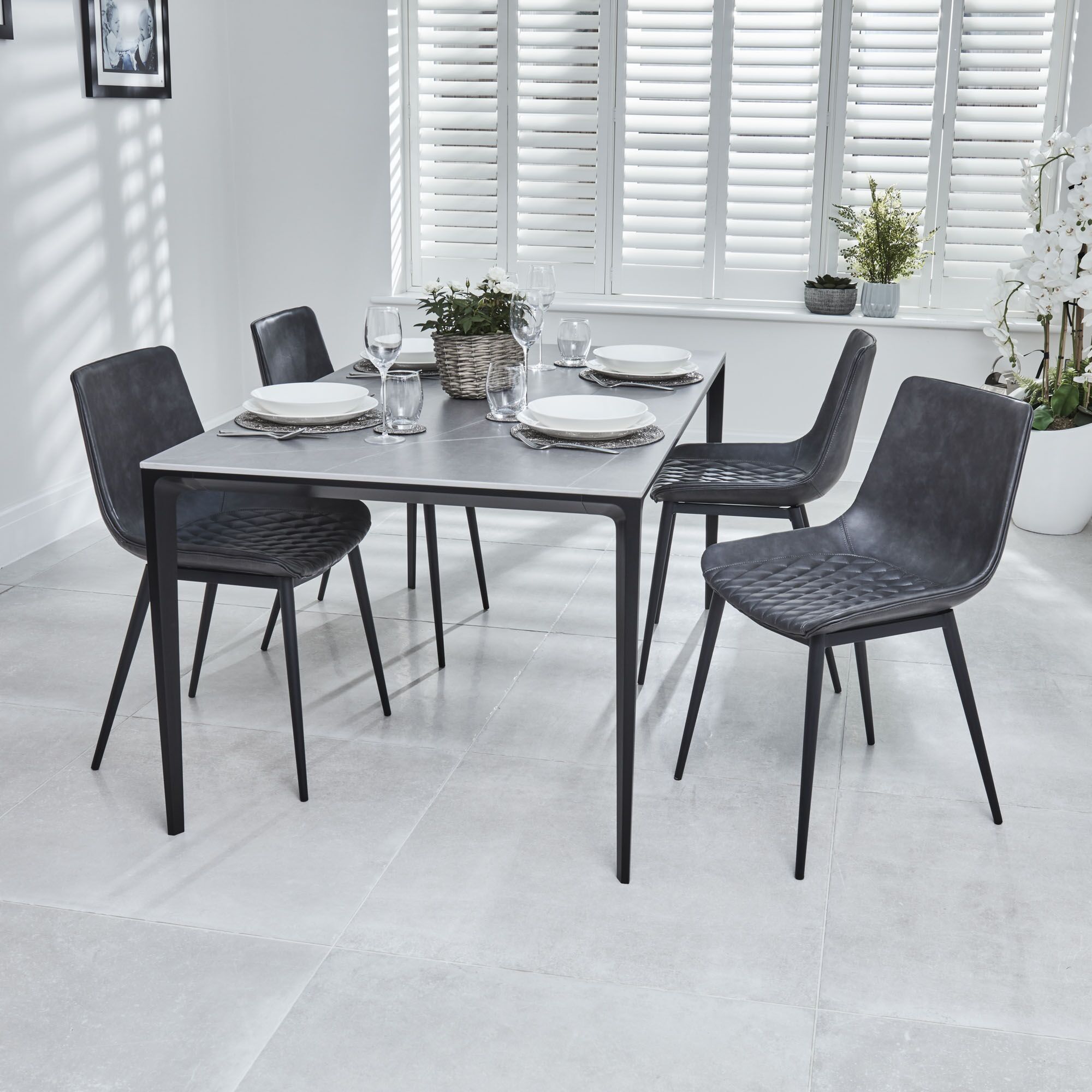 Bellagio 1.6M Grey Sintered Stone Dining Table with 4x Leo Grey Dining Chairs