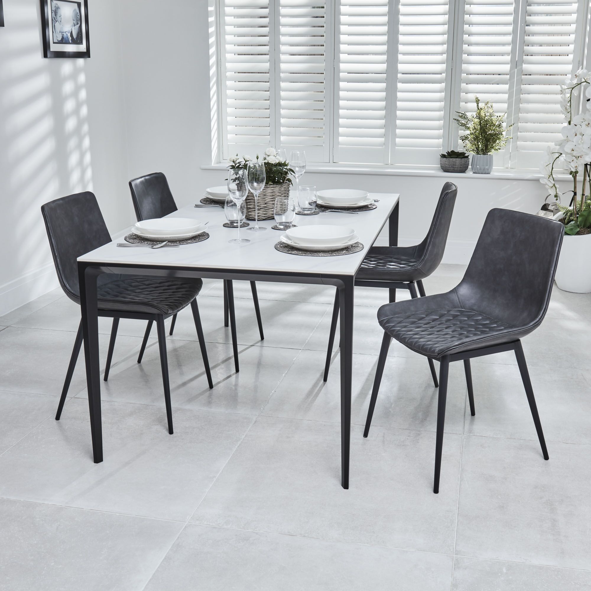 The set is finished with 4 of our Leo Grey Faux Leather Quilted Dining Chairs with its luxurious quilted faux leather charcoal padded seat, and neat stitching detail, the Leo dining chair is so much more than just somewhere to sit. This modern chair will make your space look great and you feel the comfort when sat in. The four powder coated legs have a stylish look to the base structure.