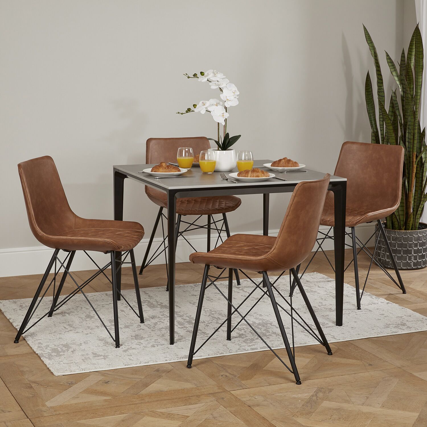 The set is finished with 4 of our Leon Tan Faux Leather Quilted Dining Chairs with its luxurious quilted faux leather charcoal padded seat, and neat stitching detail, the Leo dining chair is so much more than just somewhere to sit. This modern chair will make your space look great and you feel the comfort when sat in. The four powder coated legs have a stylish look to the base structure.