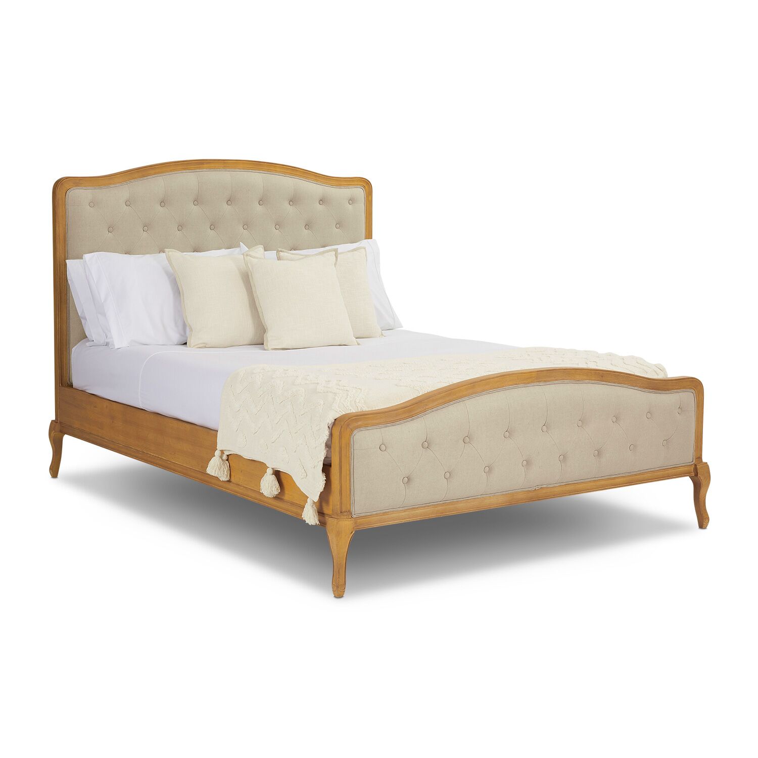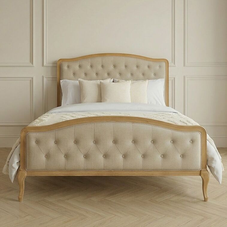 Introducing the Oak Celeste King Size Bed, a timeless piece that perfectly embodies the elegance of French neoclassical design. Crafted from solid Oak wood with a natural light finish, this bed features a beautifully upholstered headboard in oatmeal Belgian linen with a deep tufted buttoned design, offering understated luxury to any bedroom.