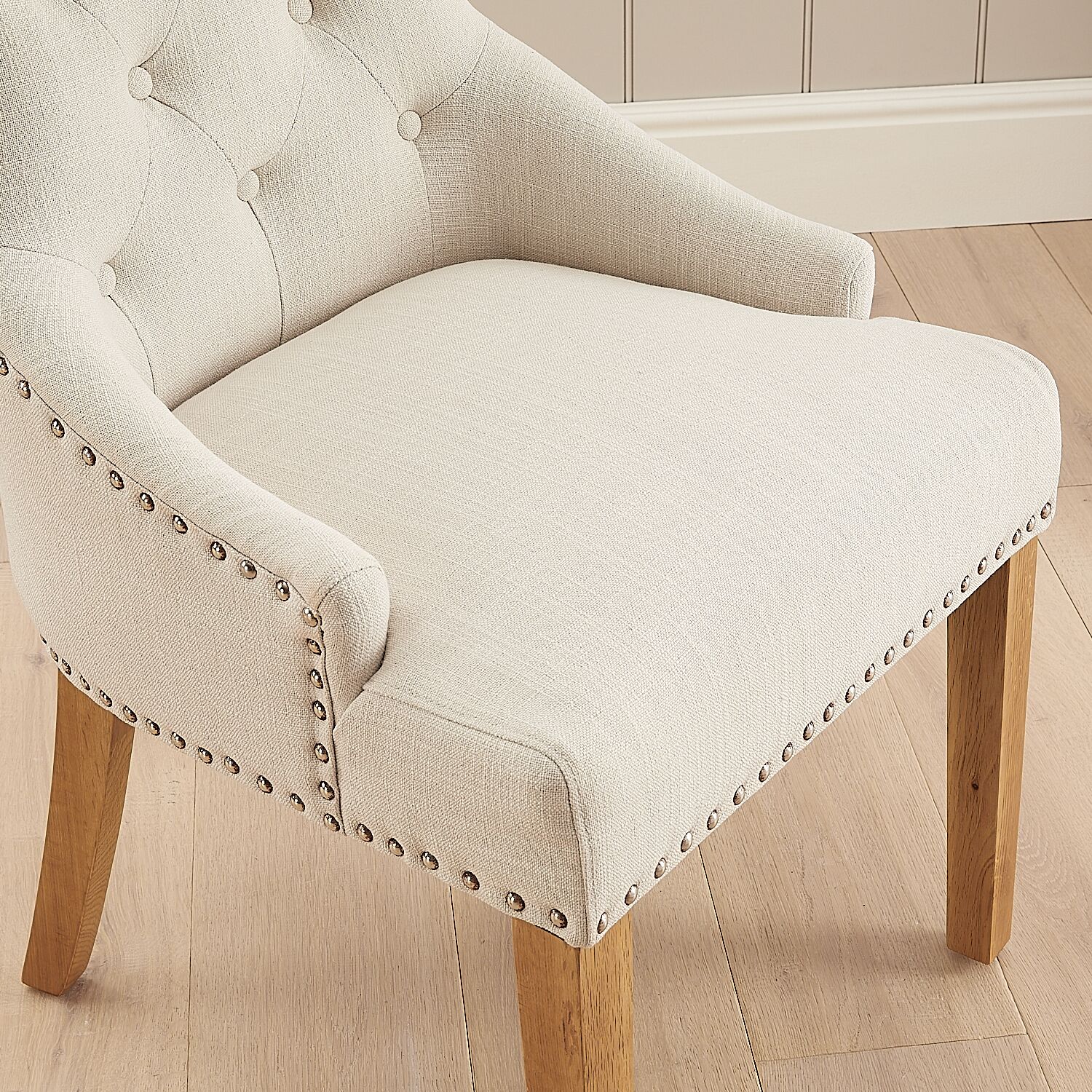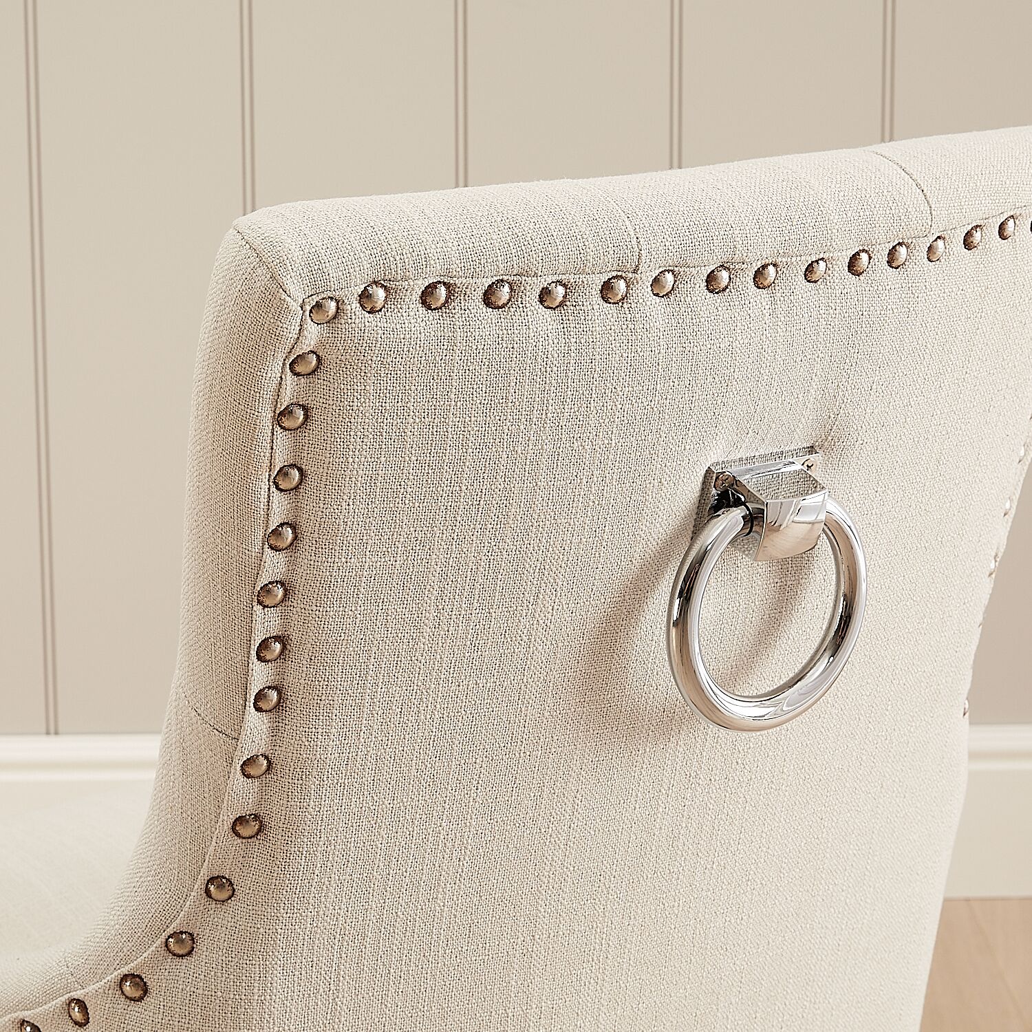 “Elegant Chelsea dining chair in natural linen. Sold as a second due to rusted studs, heavily discounted to just £59.”