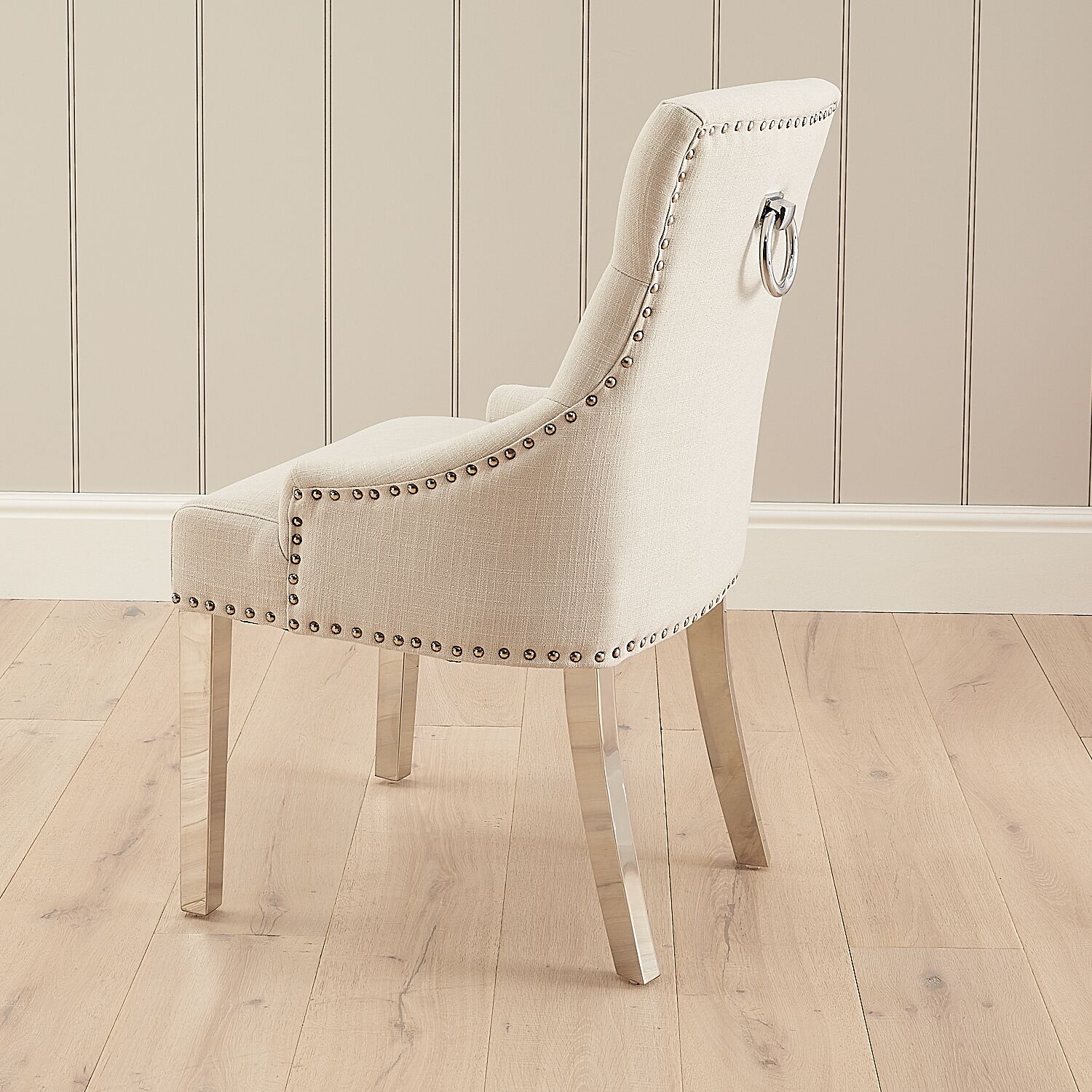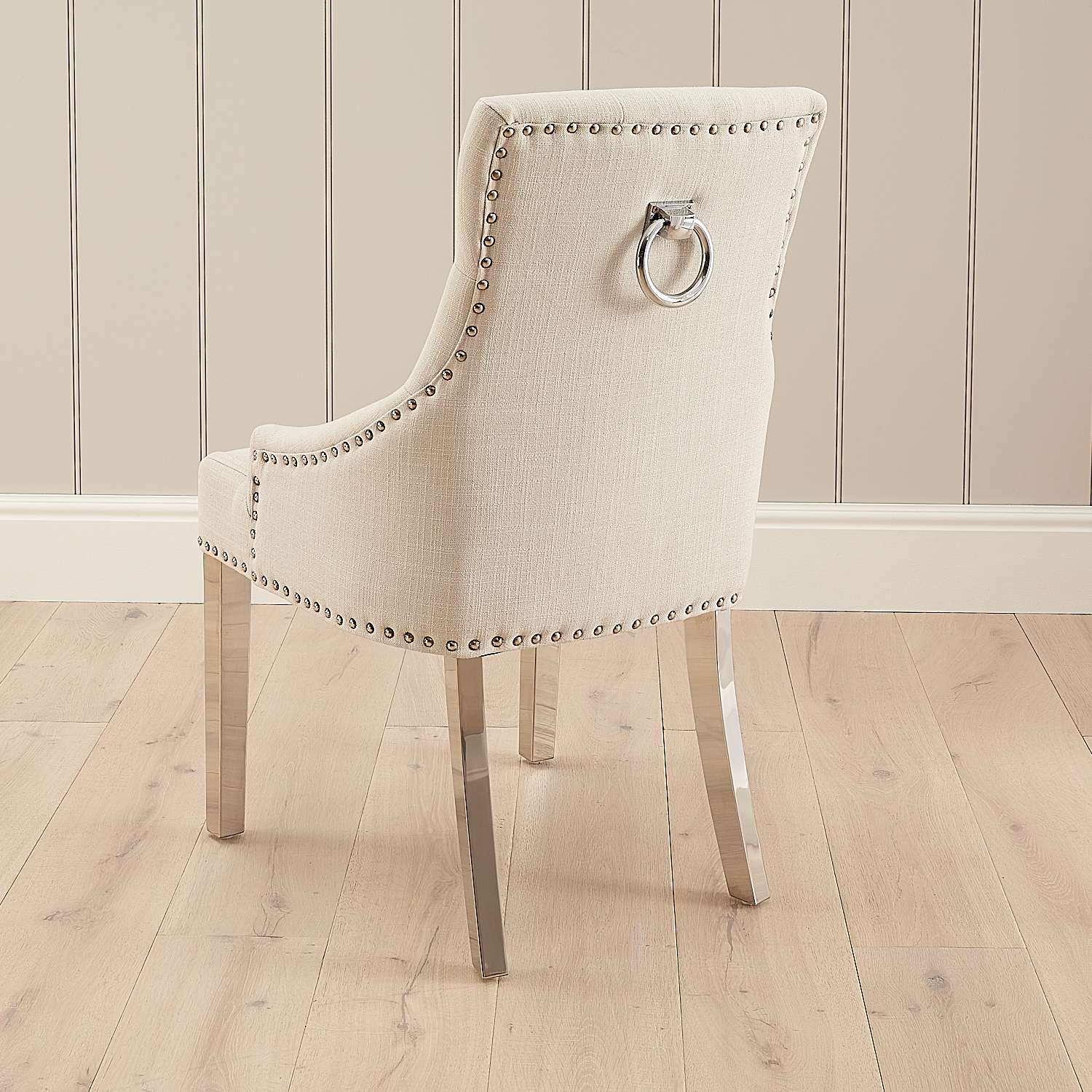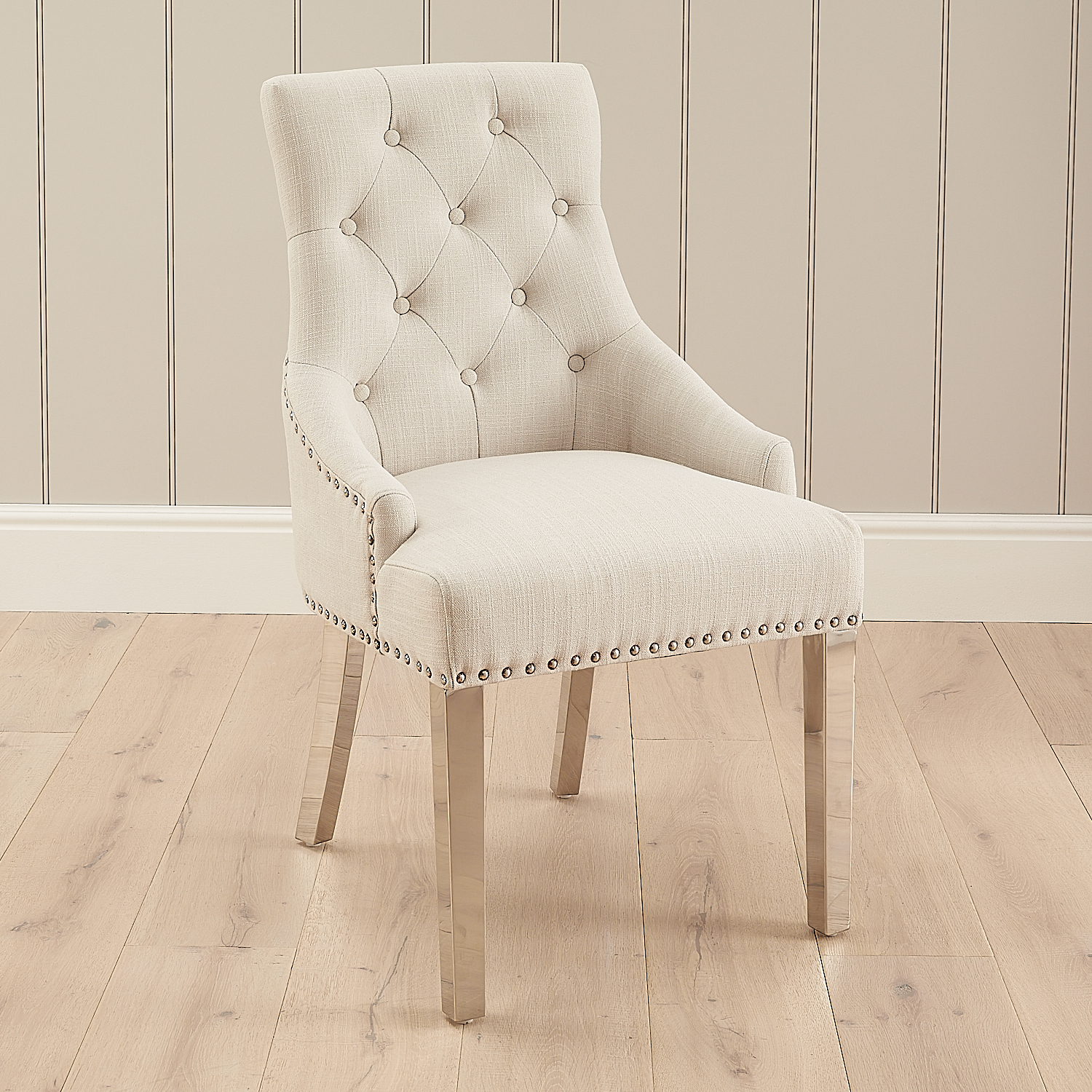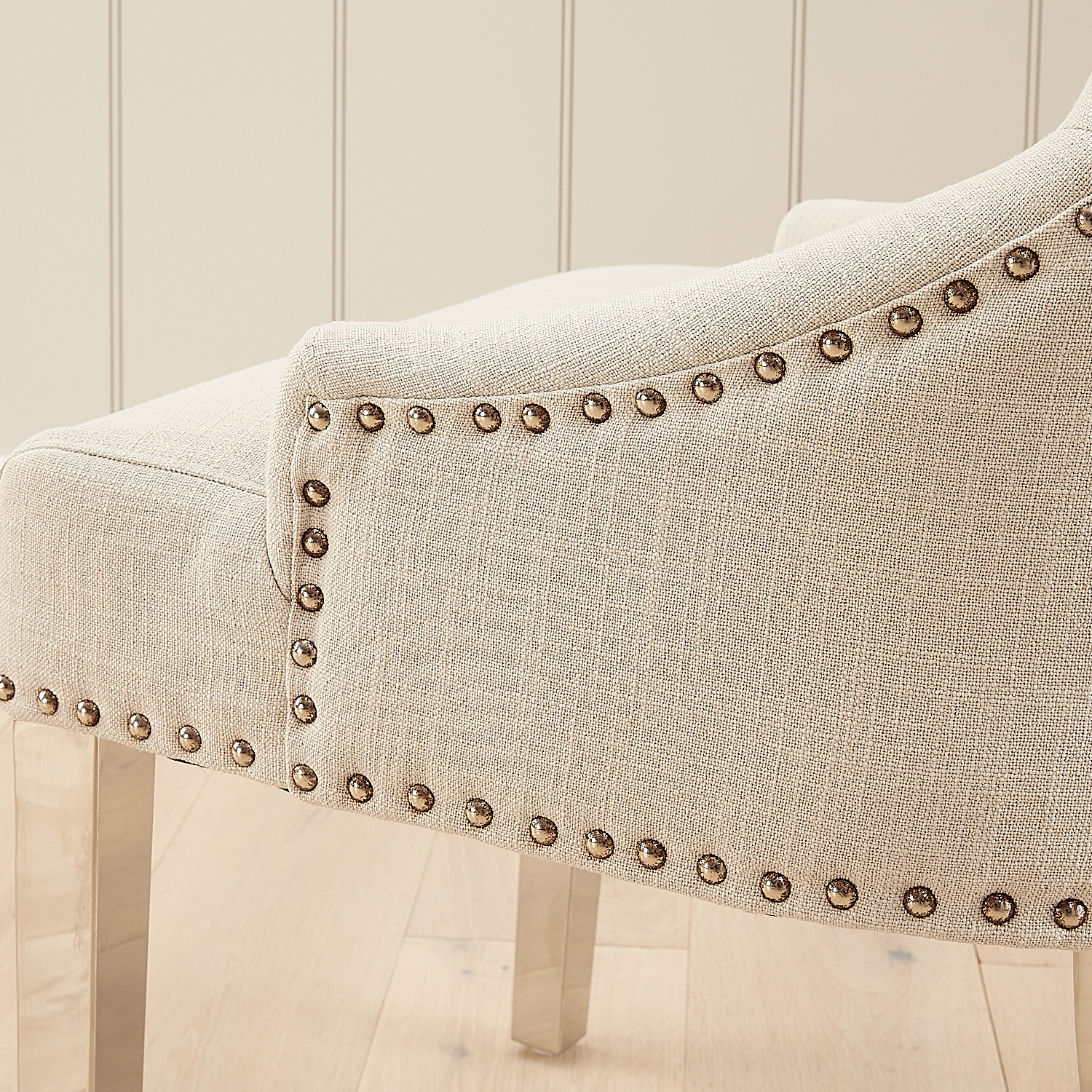 “Elegant Chelsea dining chair in natural linen. Sold as a second due to rusted studs, heavily discounted to just £69.”