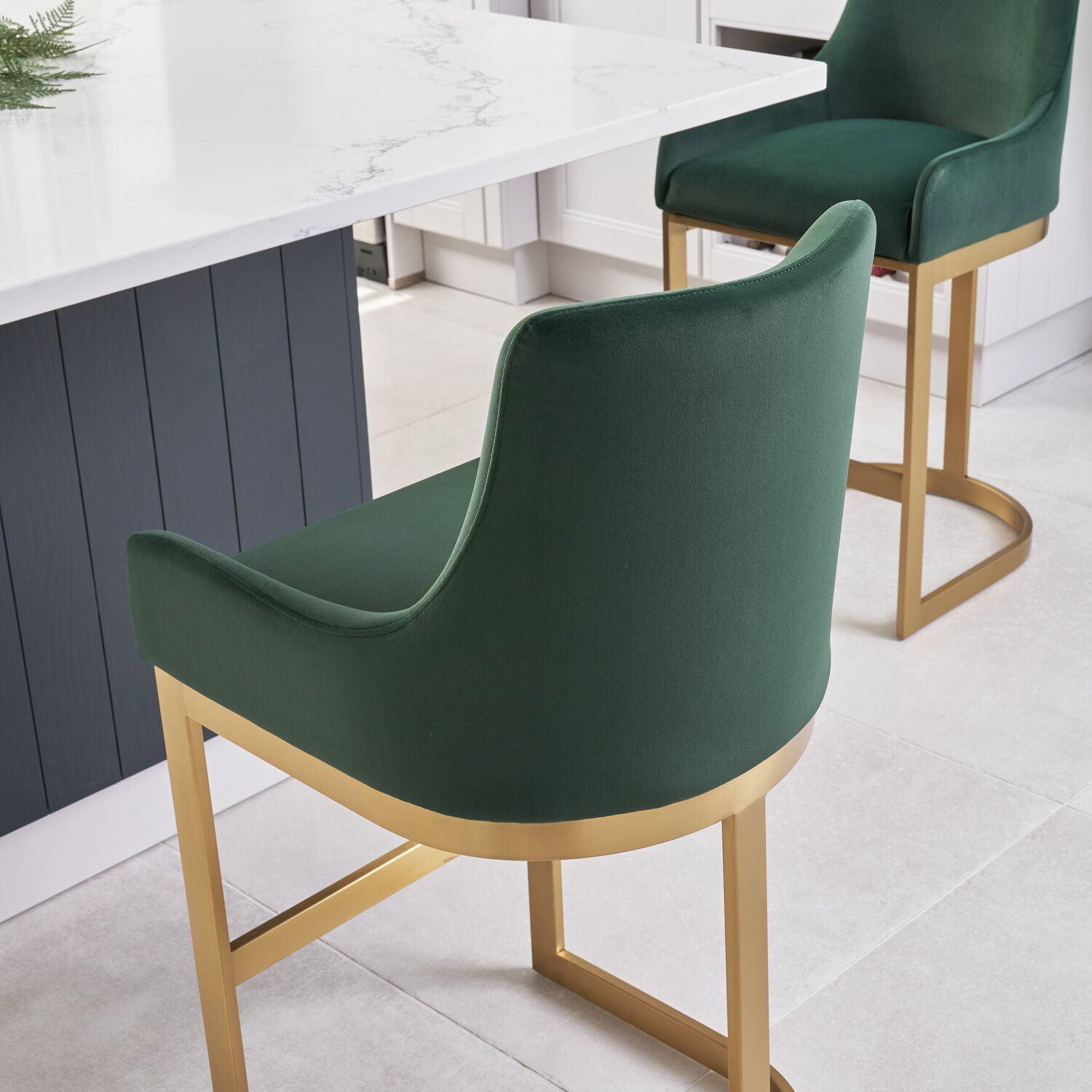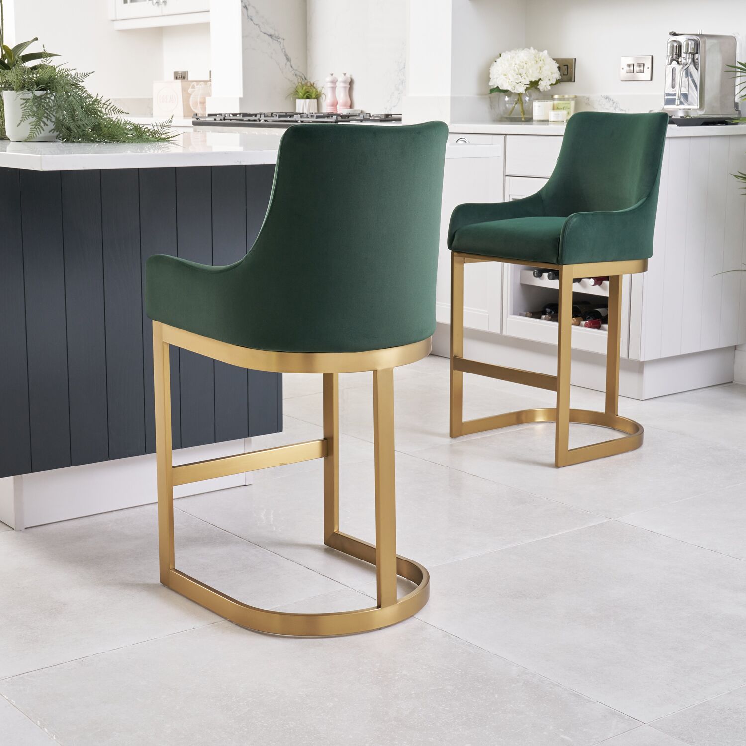 If you enjoy entertaining guests or just want a comfy place to sit in your kitchen island, then look no further than these Clara counter bar stools which are upholstered in a smooth dark Green velvet upholstery. The soft padding runs all the way up the curved backrest which has been designed to offer you plenty of support. Featuring a elegant matt Gold steel frame with footrest.