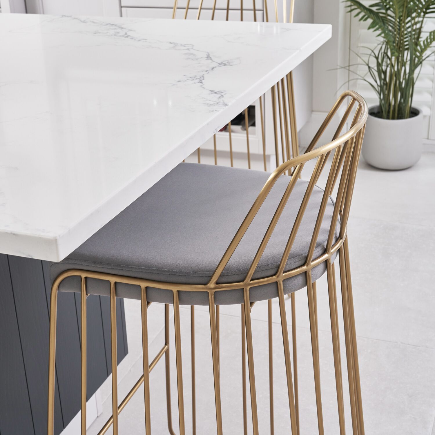 This Claudia bar stool is made of a golden matt finish, optimum comfort with a tubular backrest design. Exquisite craftsmanship, the tubular poles are specially treated, seamlessly welded and the formation of the legs are integrally formed. The grey velvet cushion for this bar stool has a deep padded seat. This may take longer to craft, but is the only way of ensuring that levels of quality that Grosvenor Furniture demand as standard as it helps to ensure a surface which is both easy to clean and resistant to abrasion.