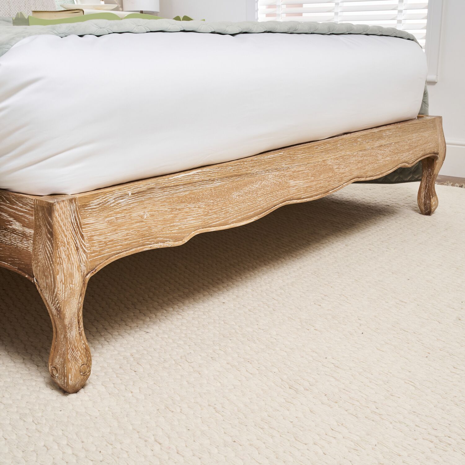 Beautifully handcrafted from solid oak and finished in a soft white-wash limed oak, this bed exudes a warm, natural charm. The frame features delicately hand-carved detailing, a testament to the artistry behind its creation. The cabriole-style legs add graceful curvature, enhancing both structural support and visual appeal.
