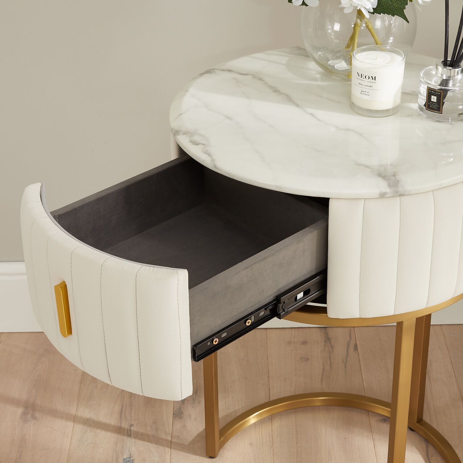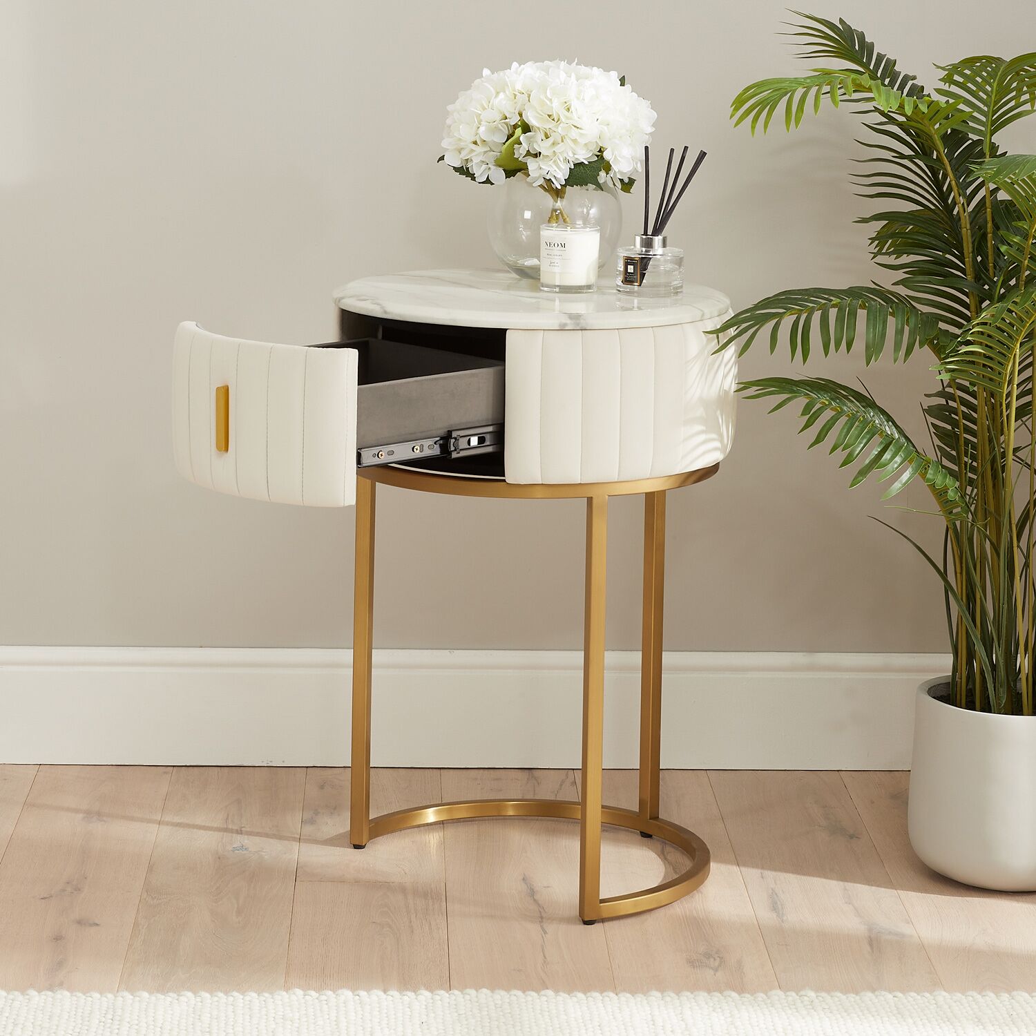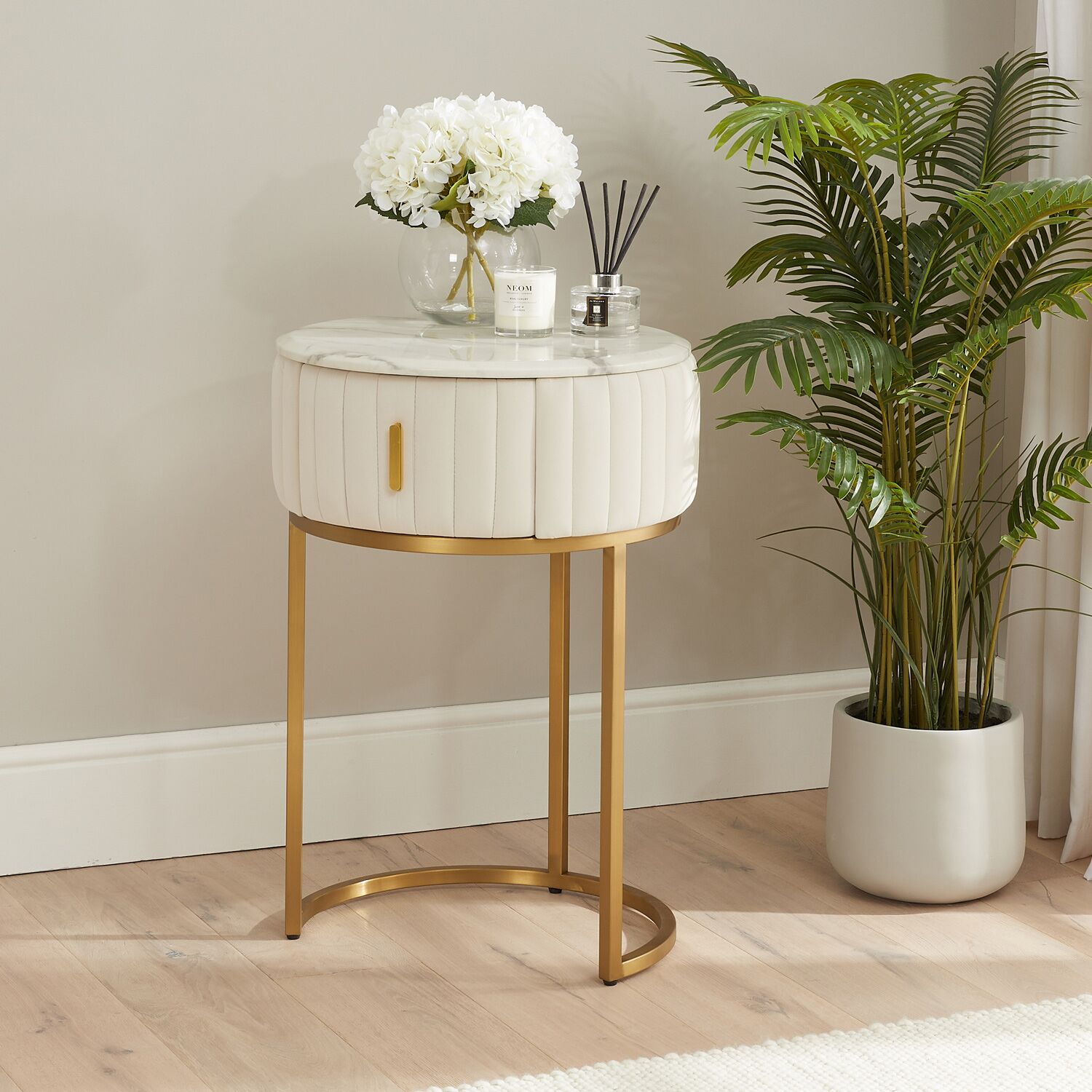 A masterpiece of contemporary Italian design, this exquisite night stand set exudes sophistication. Featuring a quilted ivory cream velvet frame on a sleek burnished gold base, it is topped with a striking white and grey faux marble oval surface. A fabric-lined drawer with a gold handle ensures effortless functionality. Complete with a matching upholstered pleated stool, this handcrafted set brings elegance and versatility to any modern interior.