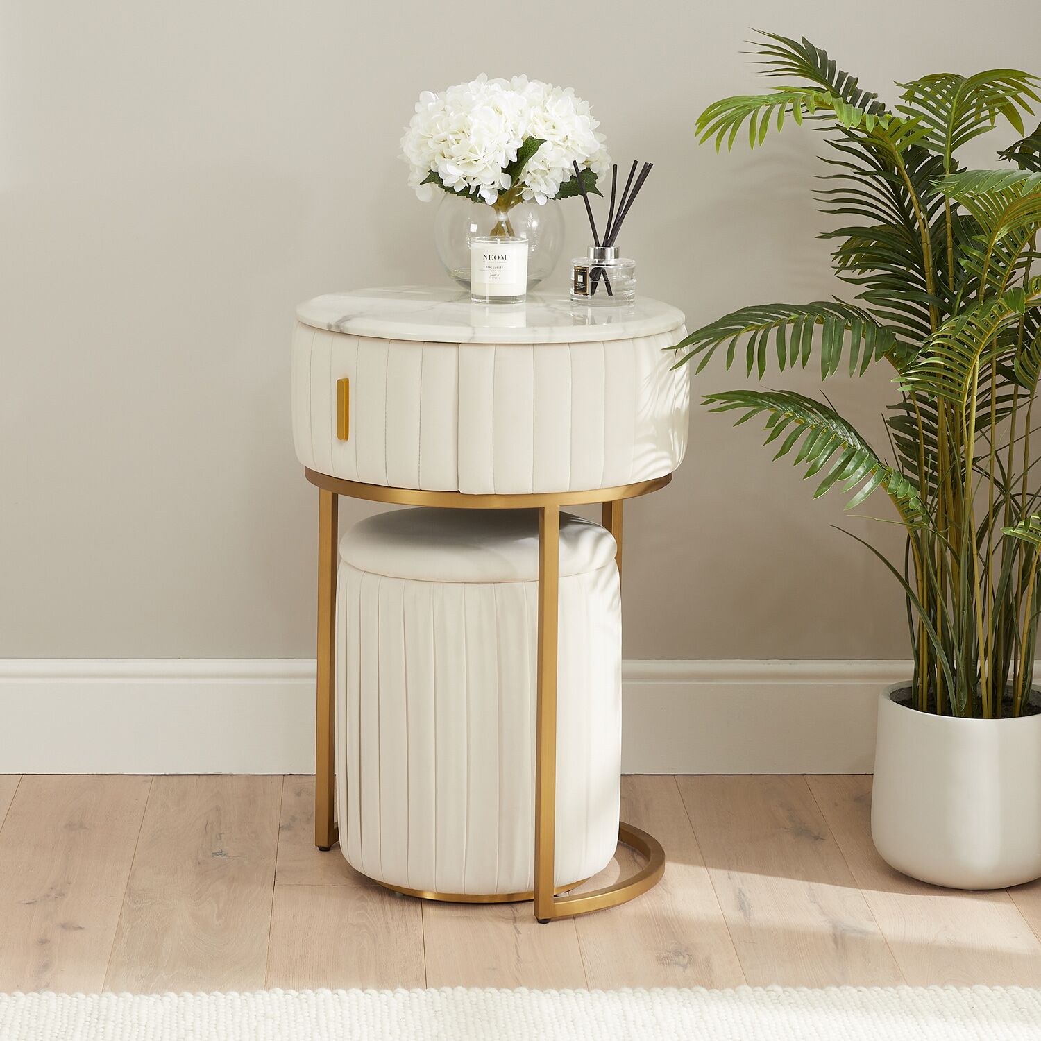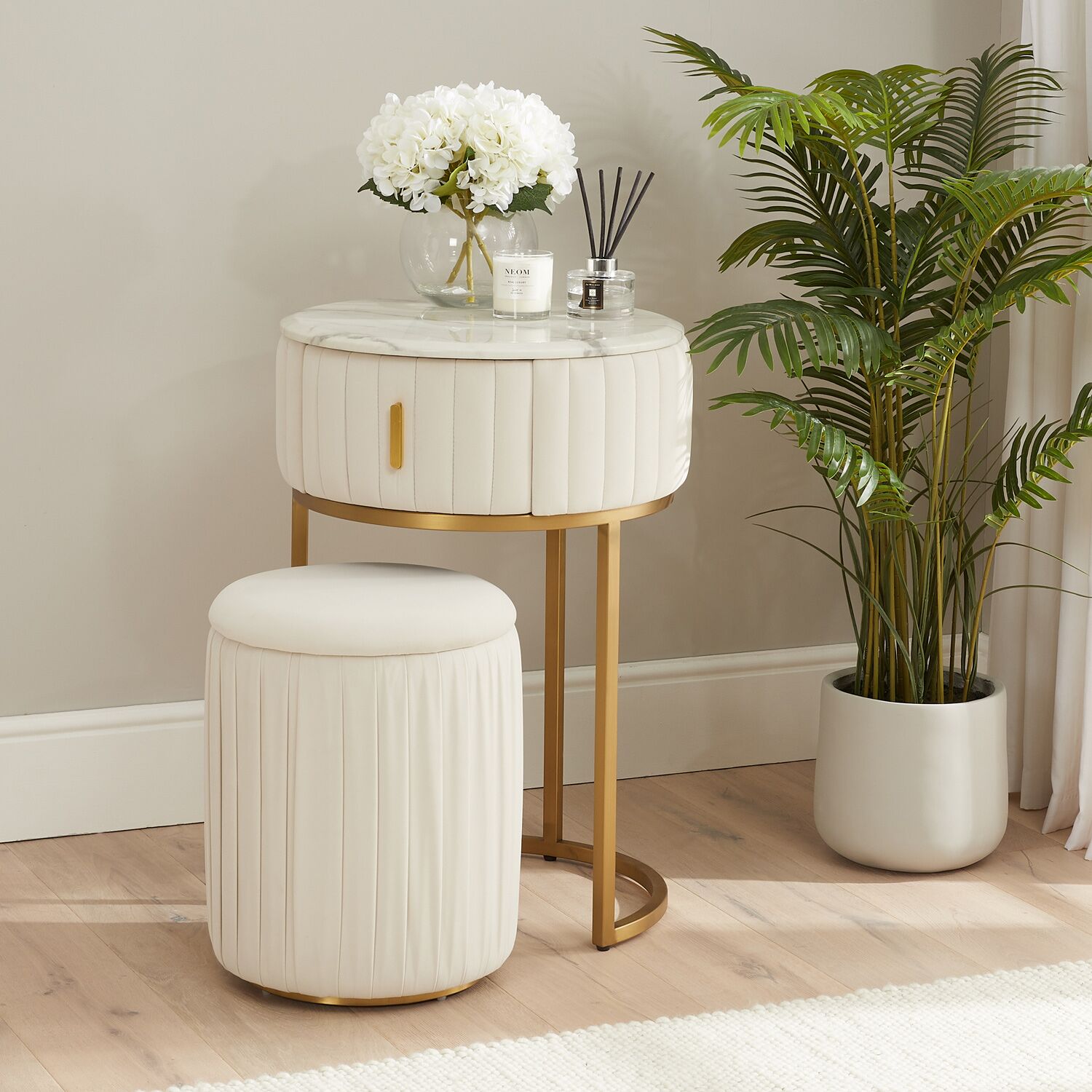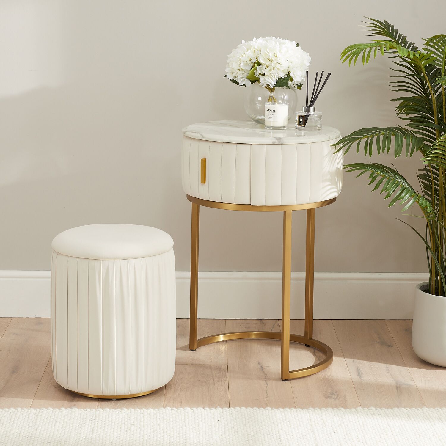 A masterpiece of contemporary Italian design, this exquisite night stand set exudes sophistication. Featuring a quilted ivory cream velvet frame on a sleek burnished gold base, it is topped with a striking white and grey faux marble oval surface. A fabric-lined drawer with a gold handle ensures effortless functionality. Complete with a matching upholstered pleated stool, this handcrafted set brings elegance and versatility to any modern interior.