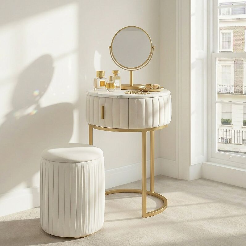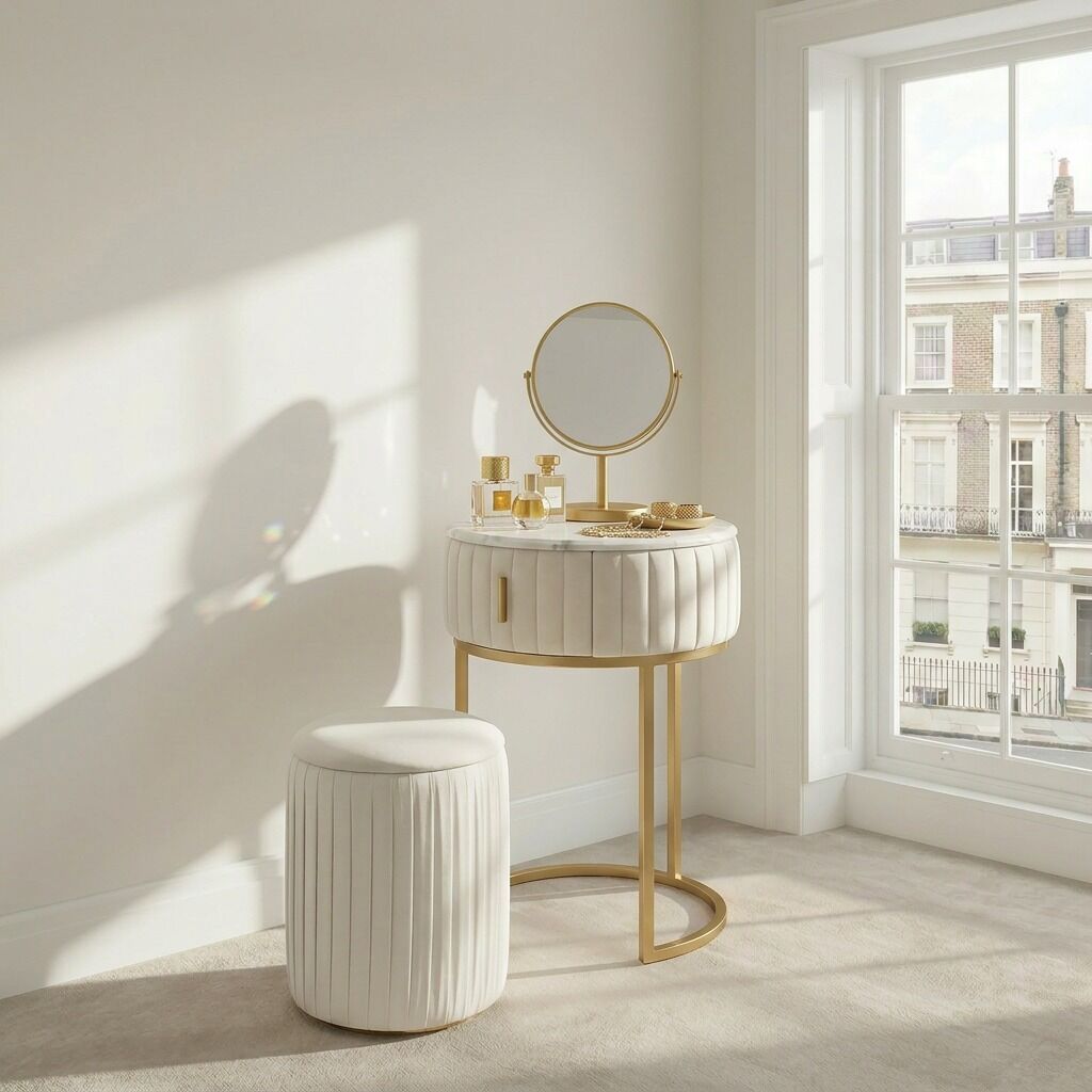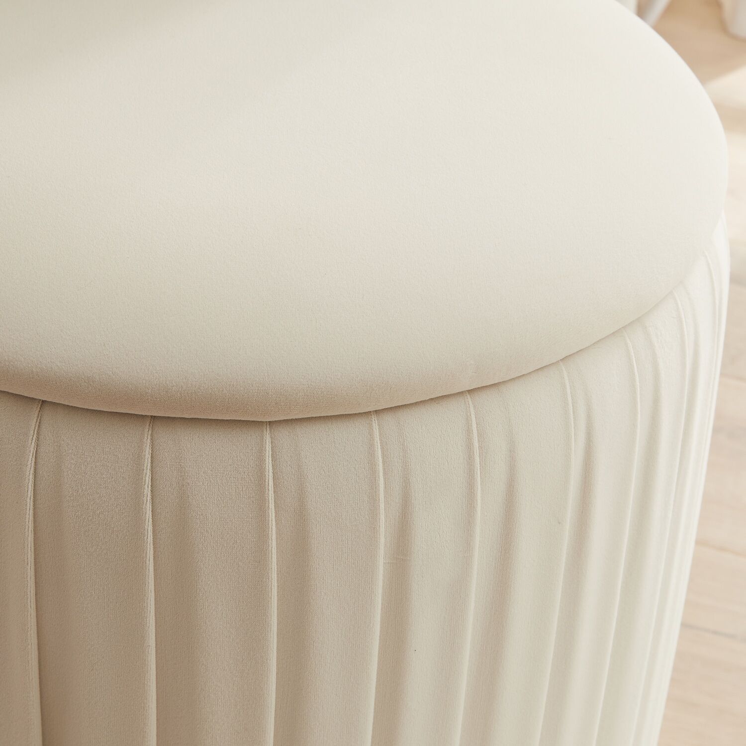 Accompanying the table is a matching upholstered pleated stool, offering supreme comfort and cohesion in design and adding depth and elegance to your space with its artistic detailing.