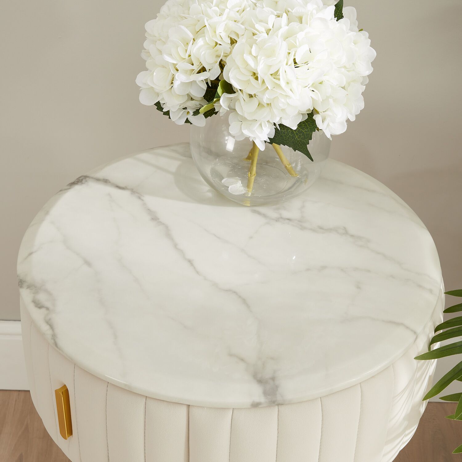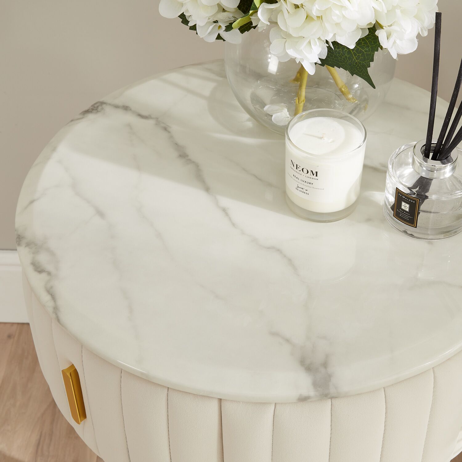 Crafted with a sturdy wooden structure, it rests on a burnished gold base, exuding understated opulence. The frame is beautifully upholstered in sumptuous ivory cream velvet, featuring exquisite quilted detailing and precision stitching for a touch of timeless elegance. A striking circular top in fresh white and grey faux marble adds a bold yet refined contrast, ensuring a stunning focal point in any room.