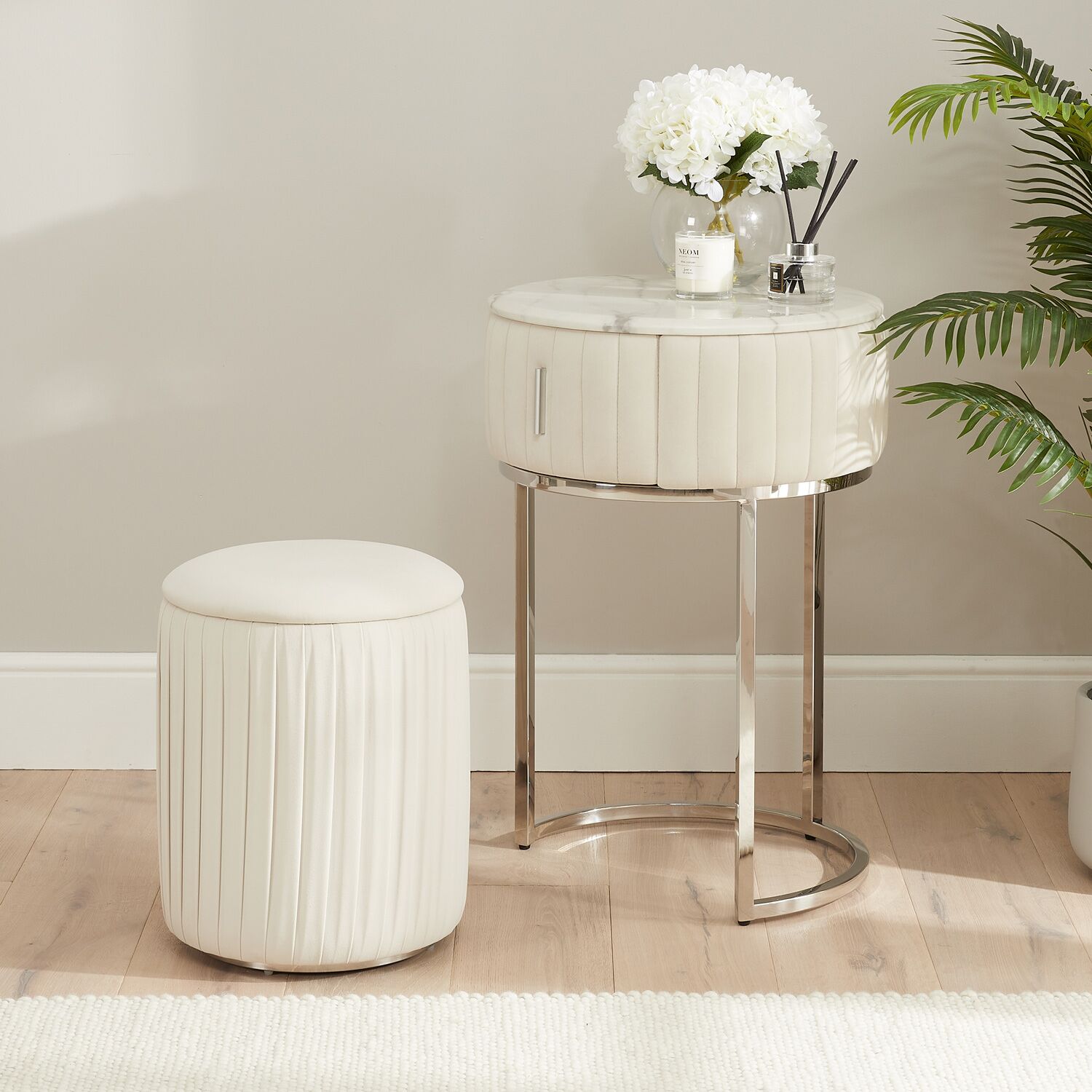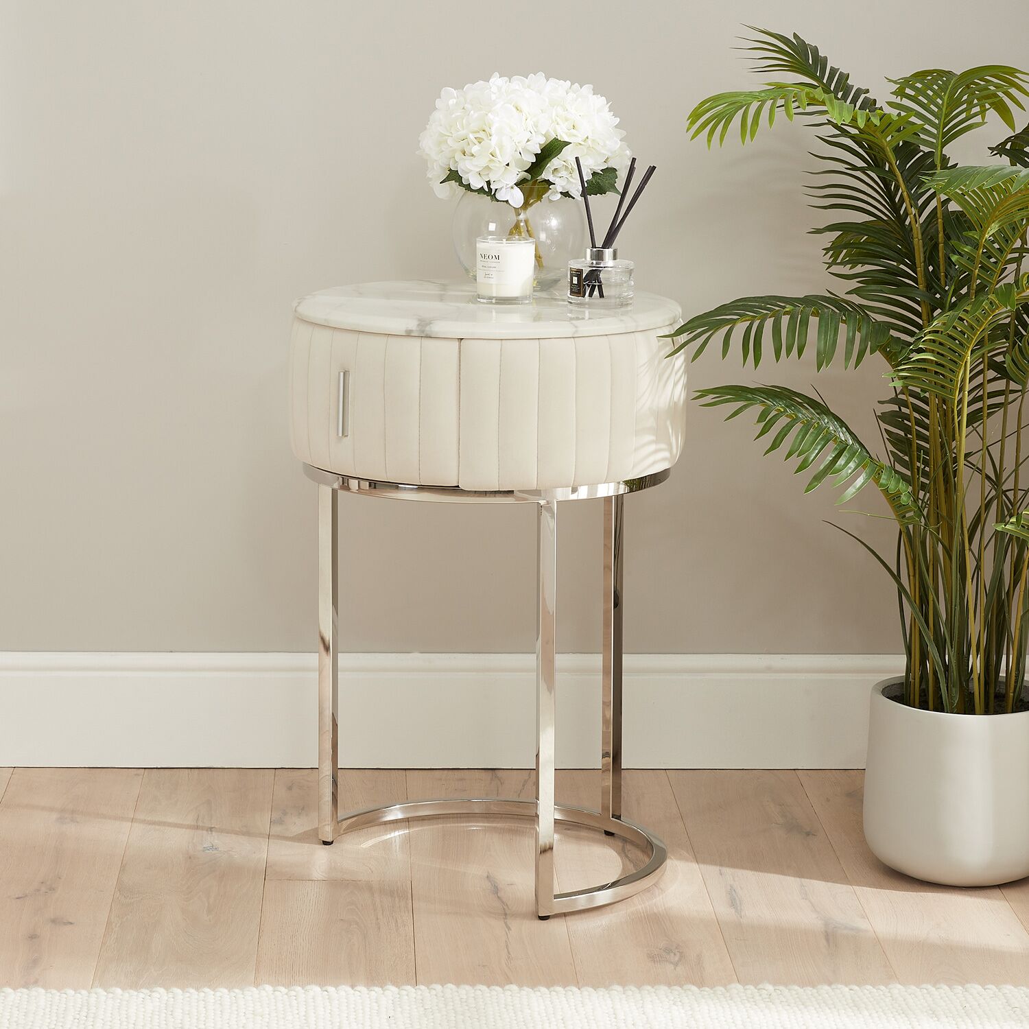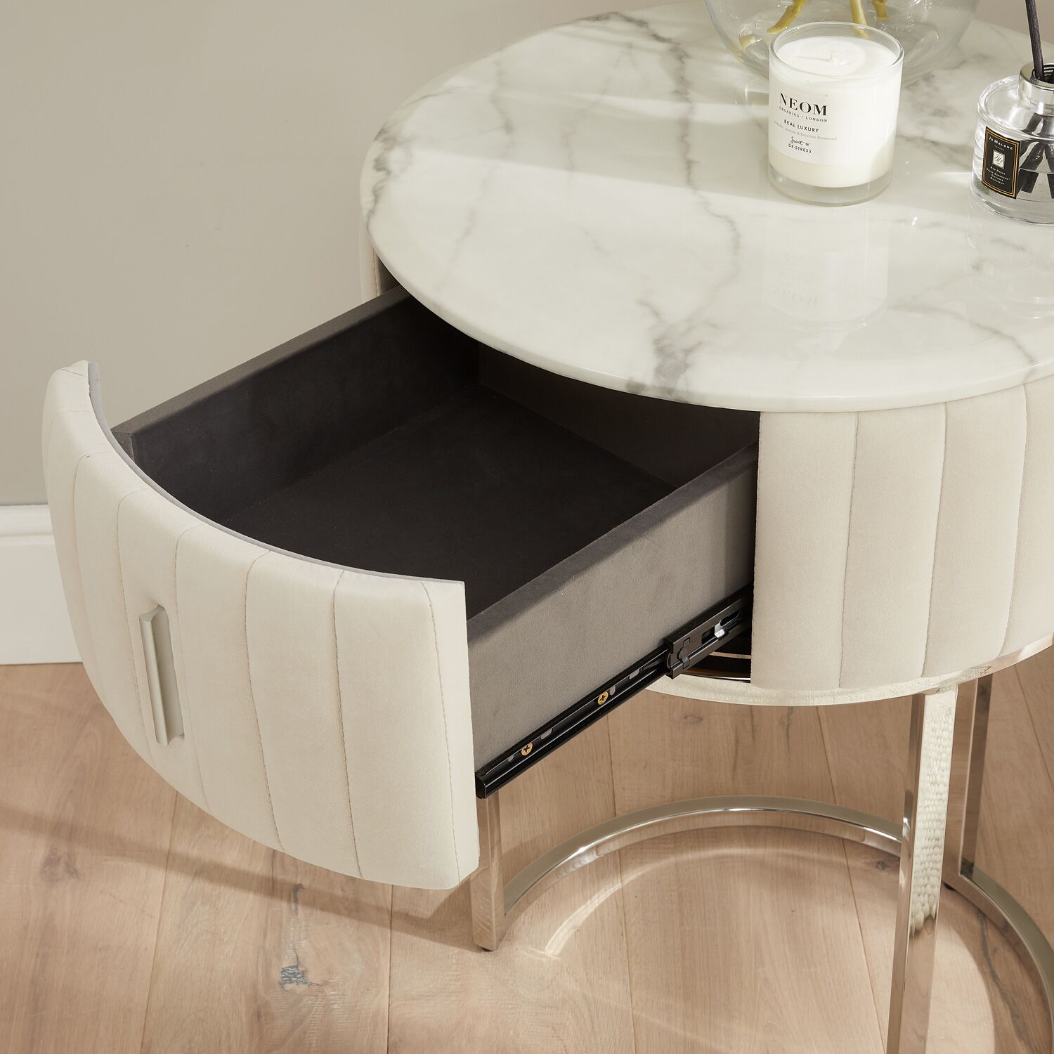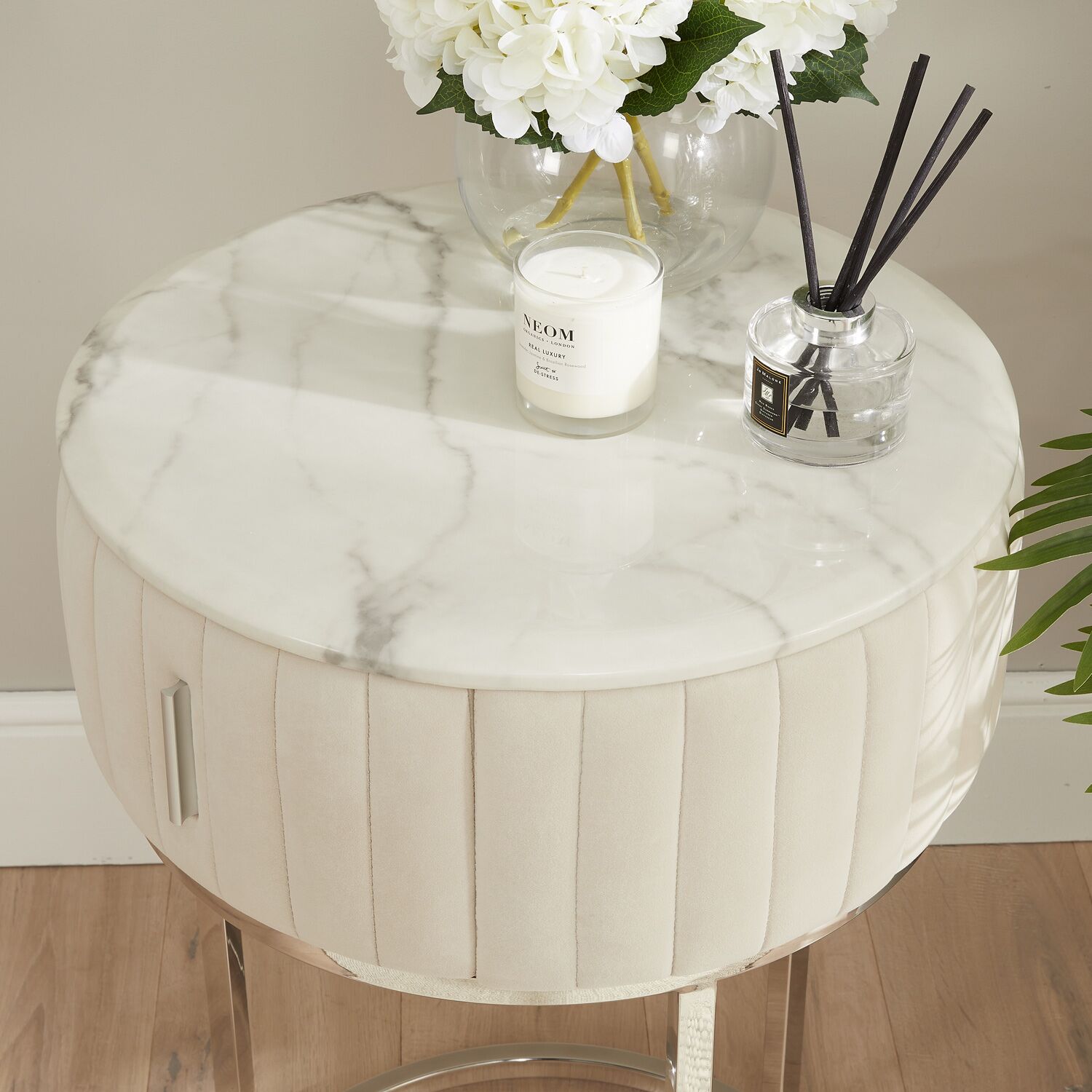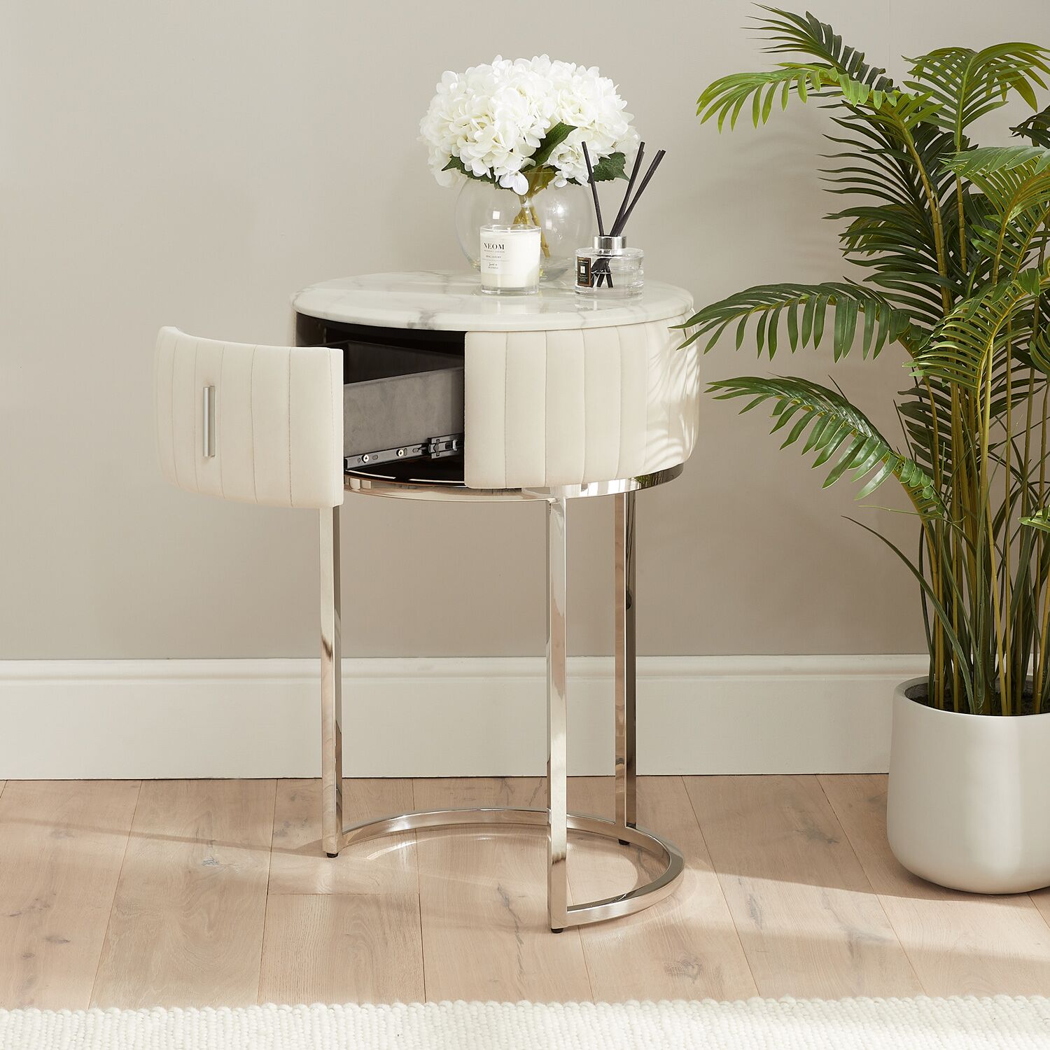 A masterpiece of contemporary Italian design, this exquisite night stand set exudes sophistication. Featuring a quilted ivory cream velvet frame on a sleek polished steel base, it is topped with a striking white and grey faux marble oval surface. A fabric-lined drawer with a silver handle ensures effortless functionality. Complete with a matching upholstered pleated stool, this handcrafted set brings elegance and versatility to any modern interior.