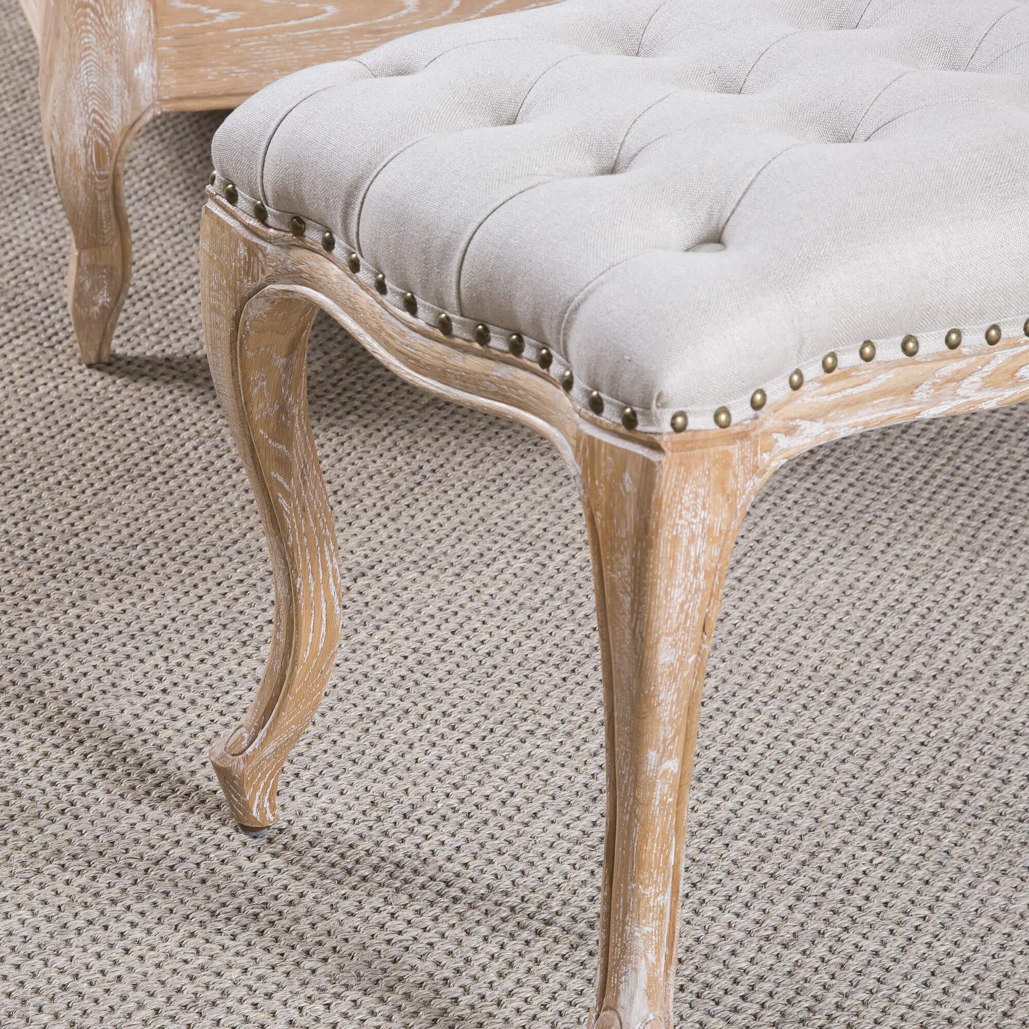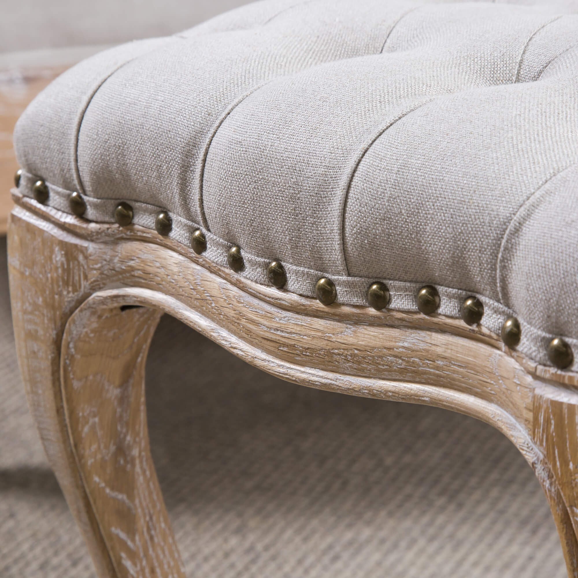 This luxurious piece of furniture is made from solid North American Oak and finished in a weathered white wash finish. The deep button upholstered seat pad sits above four cabriole carved legs.