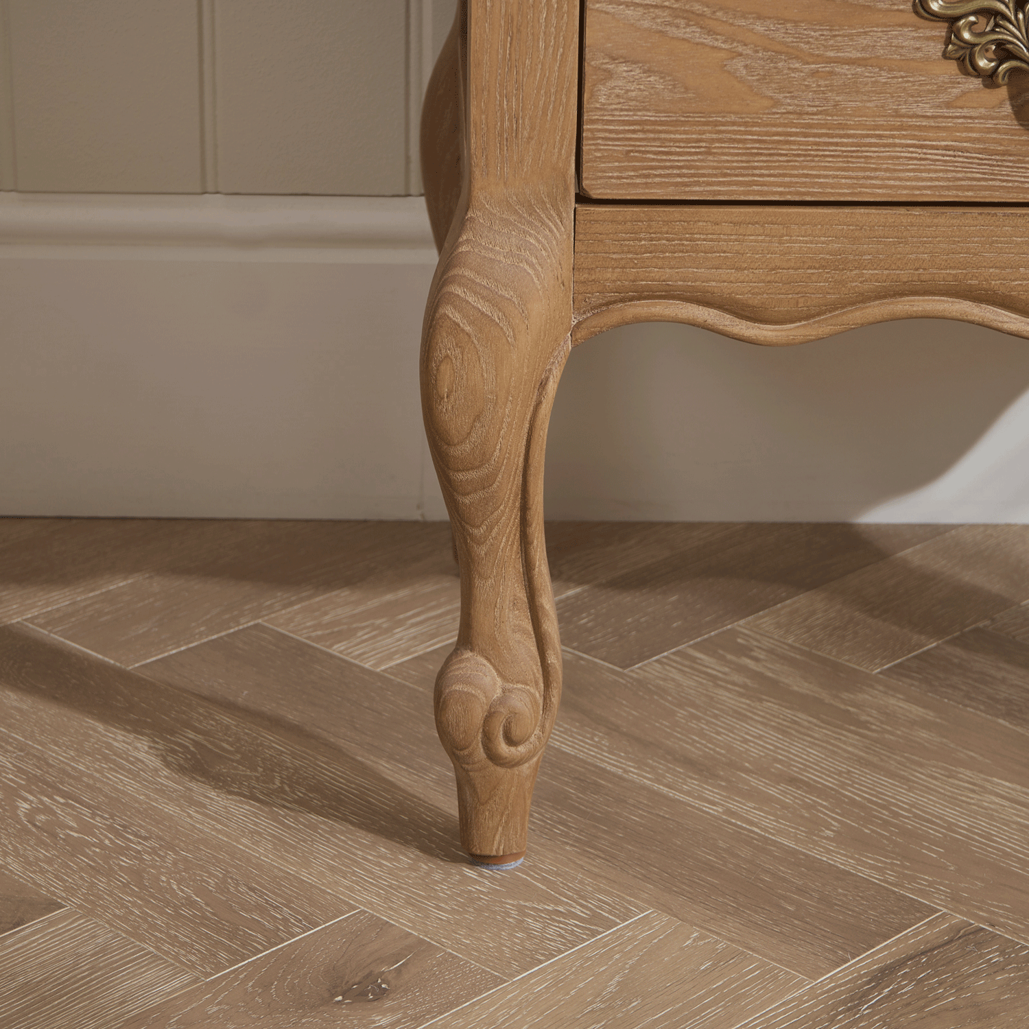 As with our French style beds, you will find that this limed Ash bedside table features captivating lines and curves which are exemplified by the four supporting cabriole legs. This is in addition to antique solid brass French style handles which really add to the period dating that the piece harks back to.