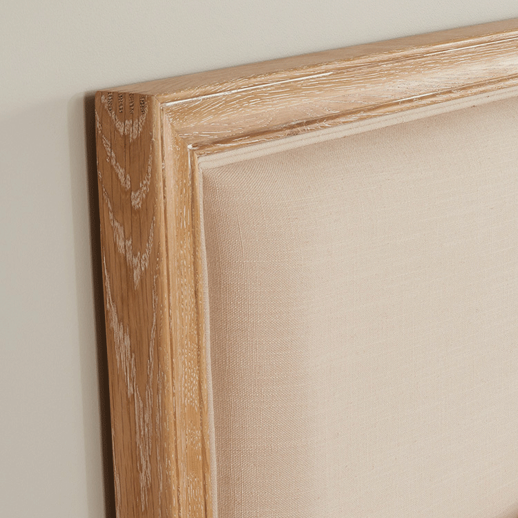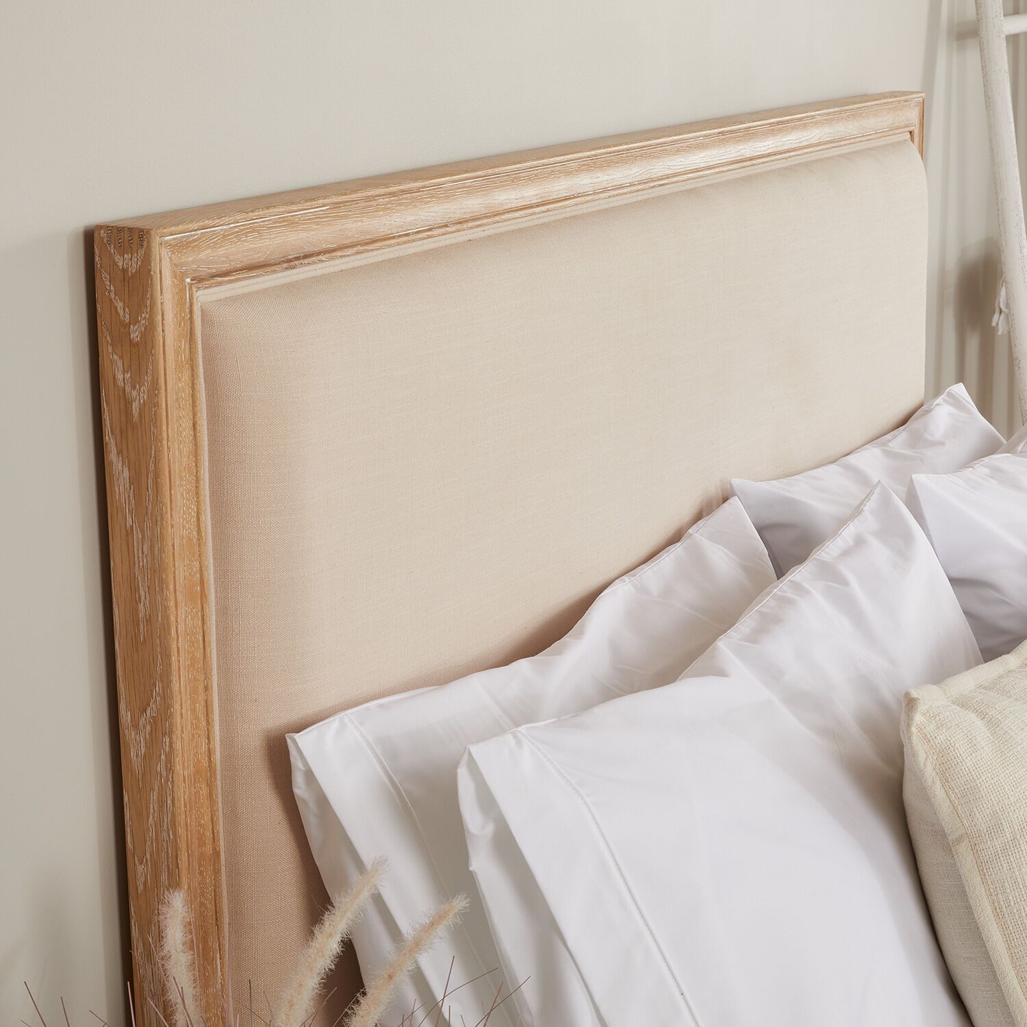 Upholstered in a luxurious Belgian linen, the headboard is wrapped in a fabric that carries a gentle cream undertones—an inviting, sophisticated tone that complements the neutral wood finish and adds a touch of softness to the overall design.