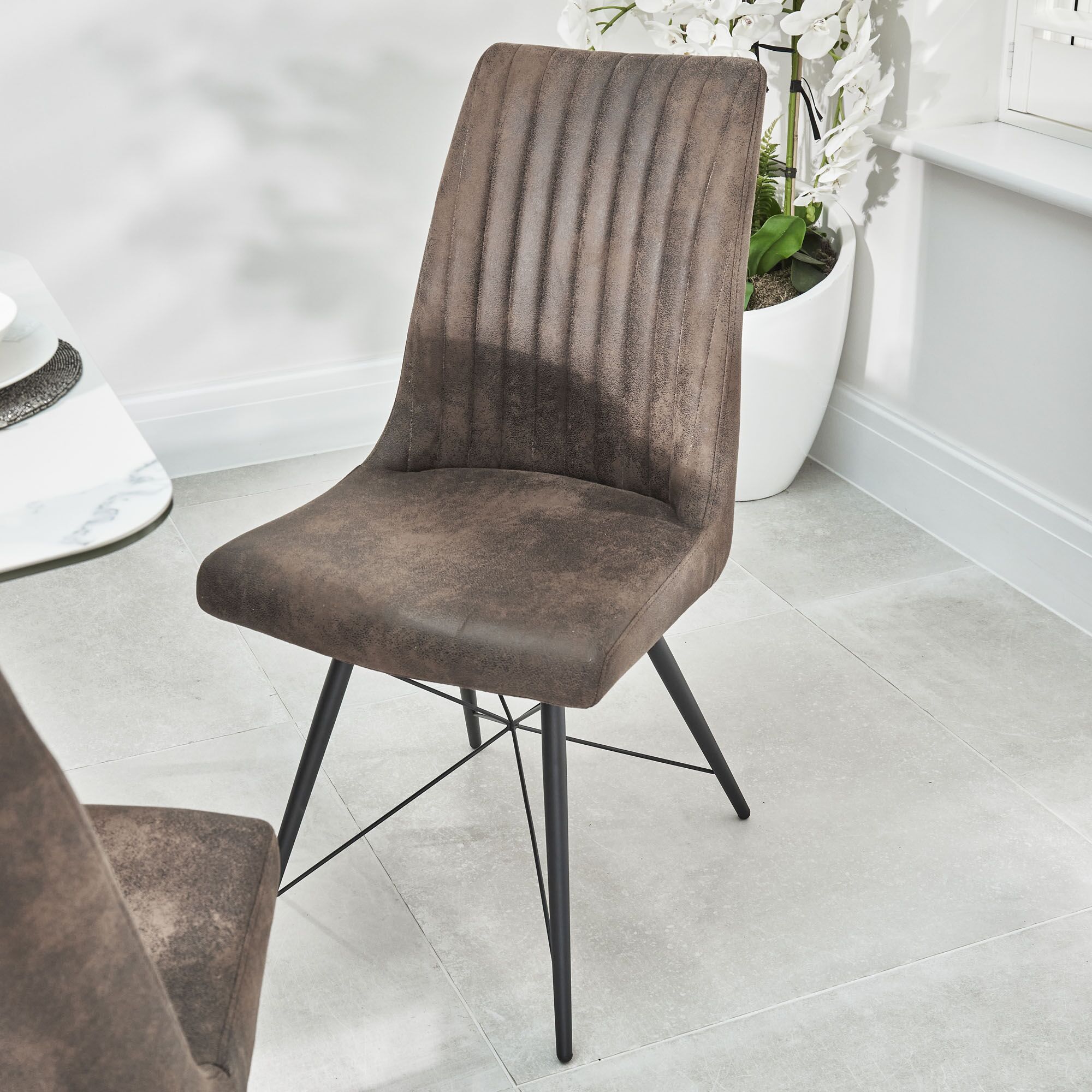Our Hudson Faux Leather dining chair offers a rustic yet modern design.