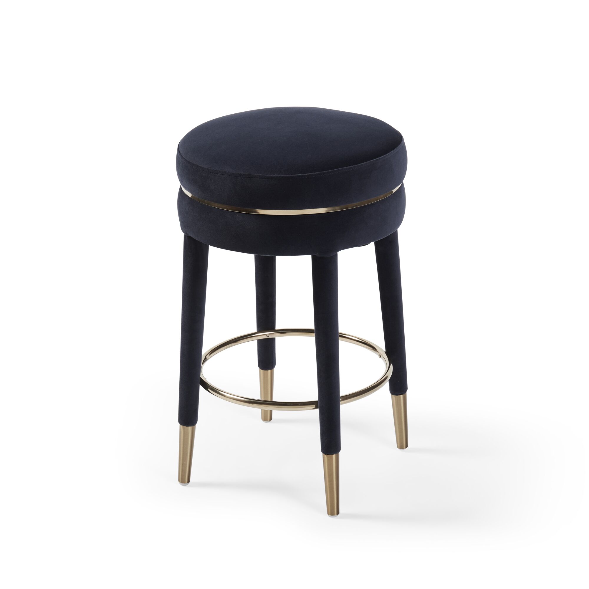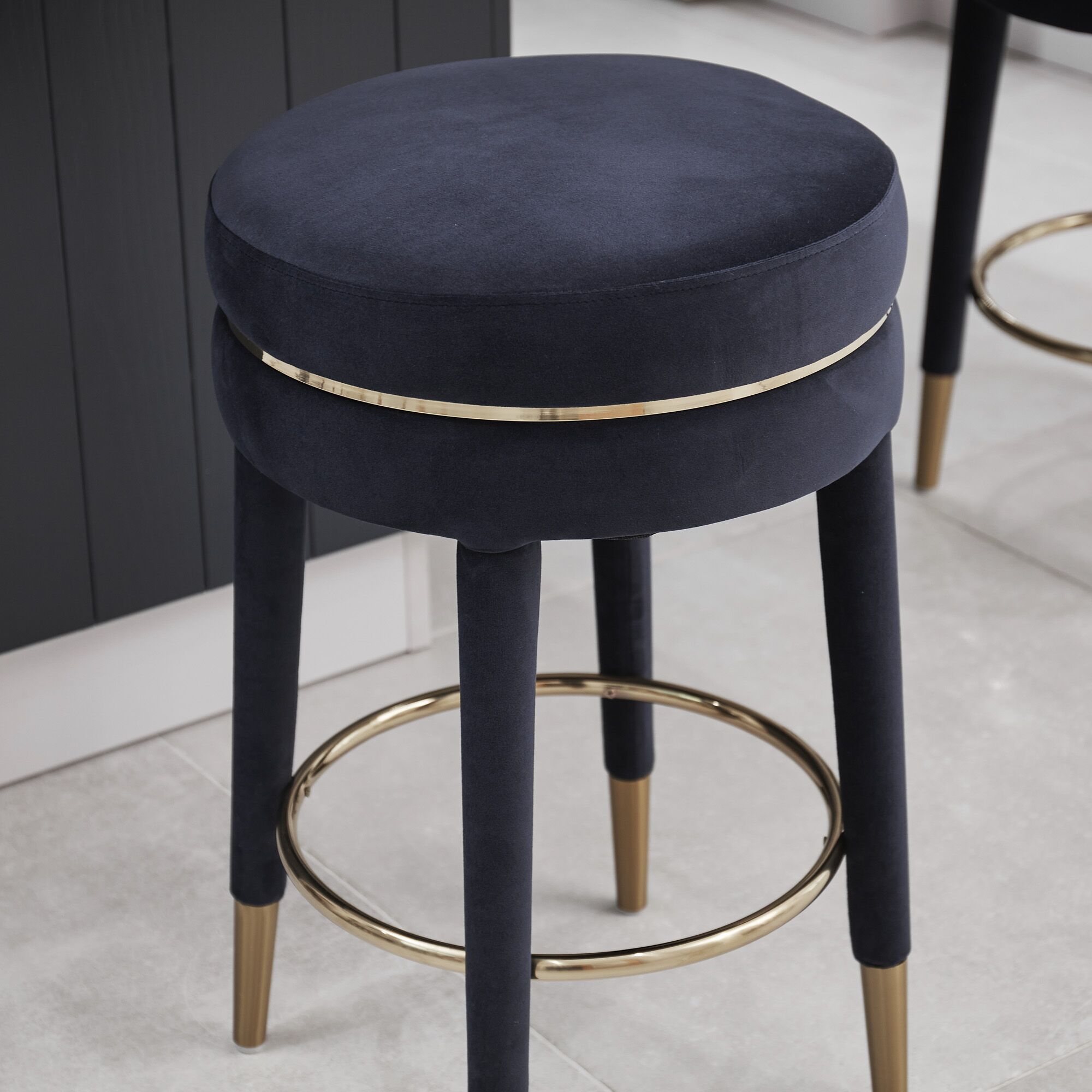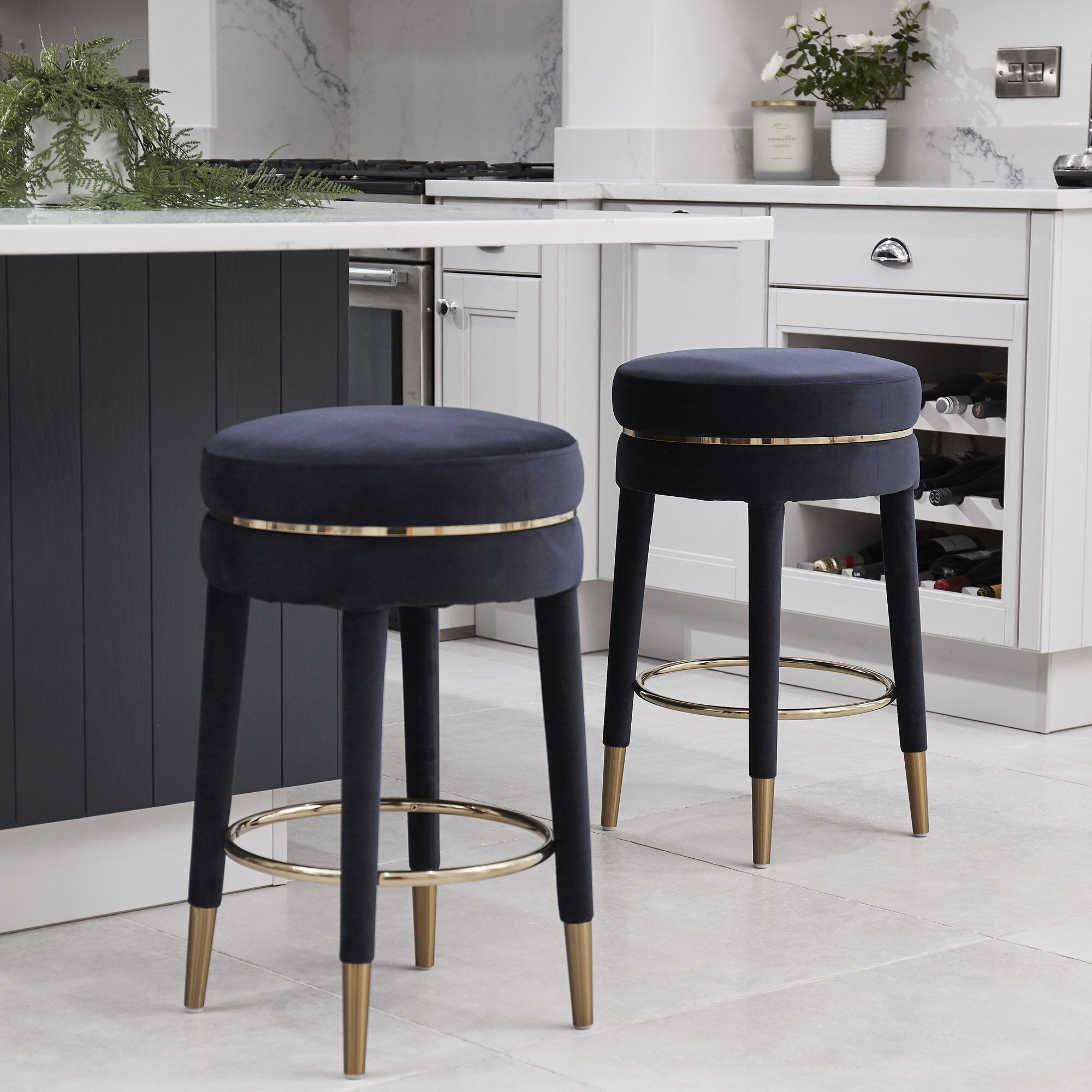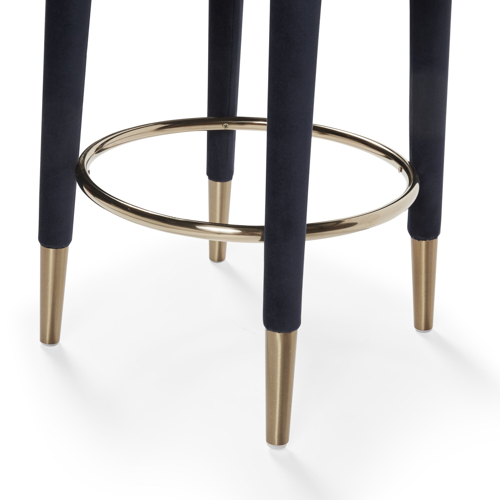 Isabel Dark Blue Velvet Counter Bar Stool with Gold Trim Footrest