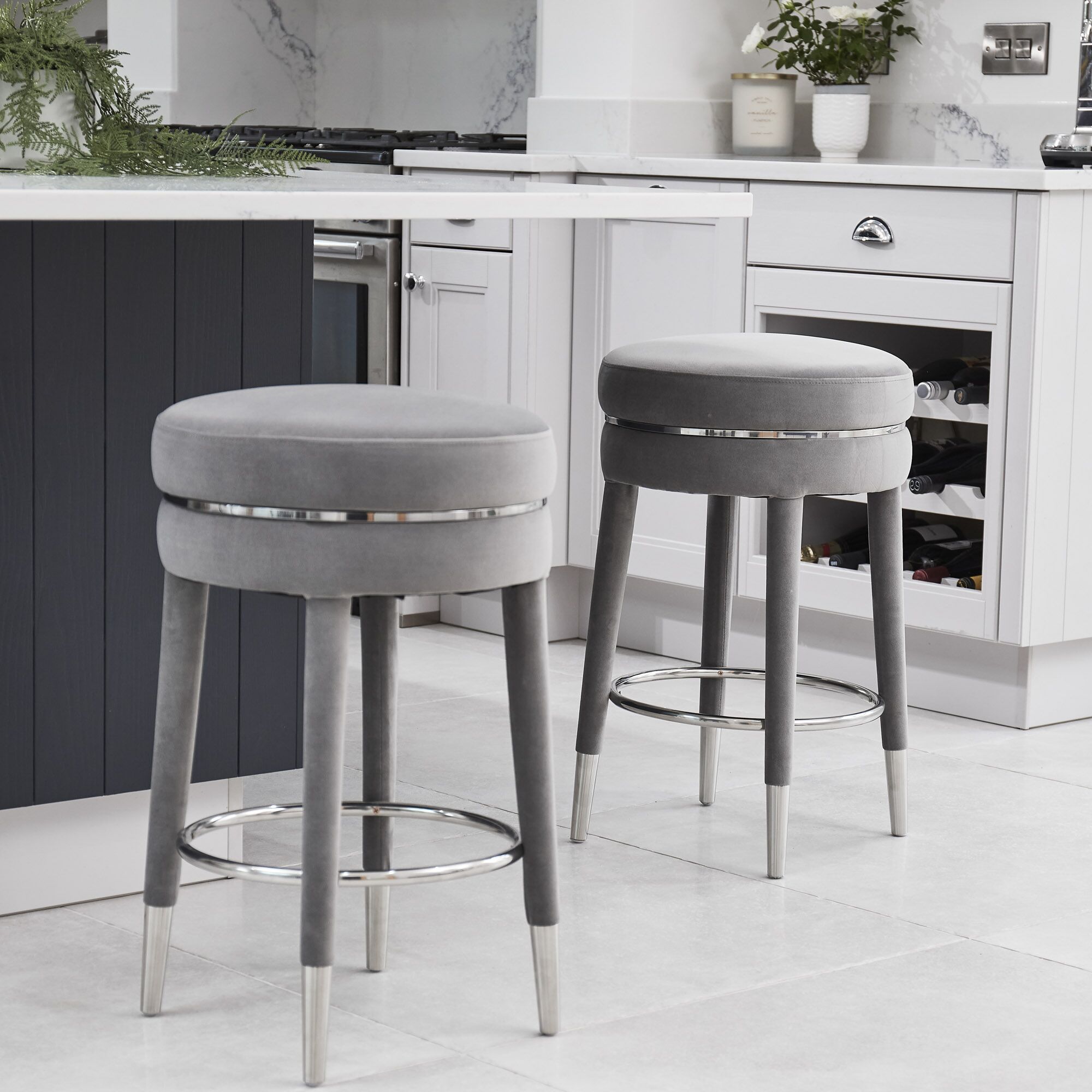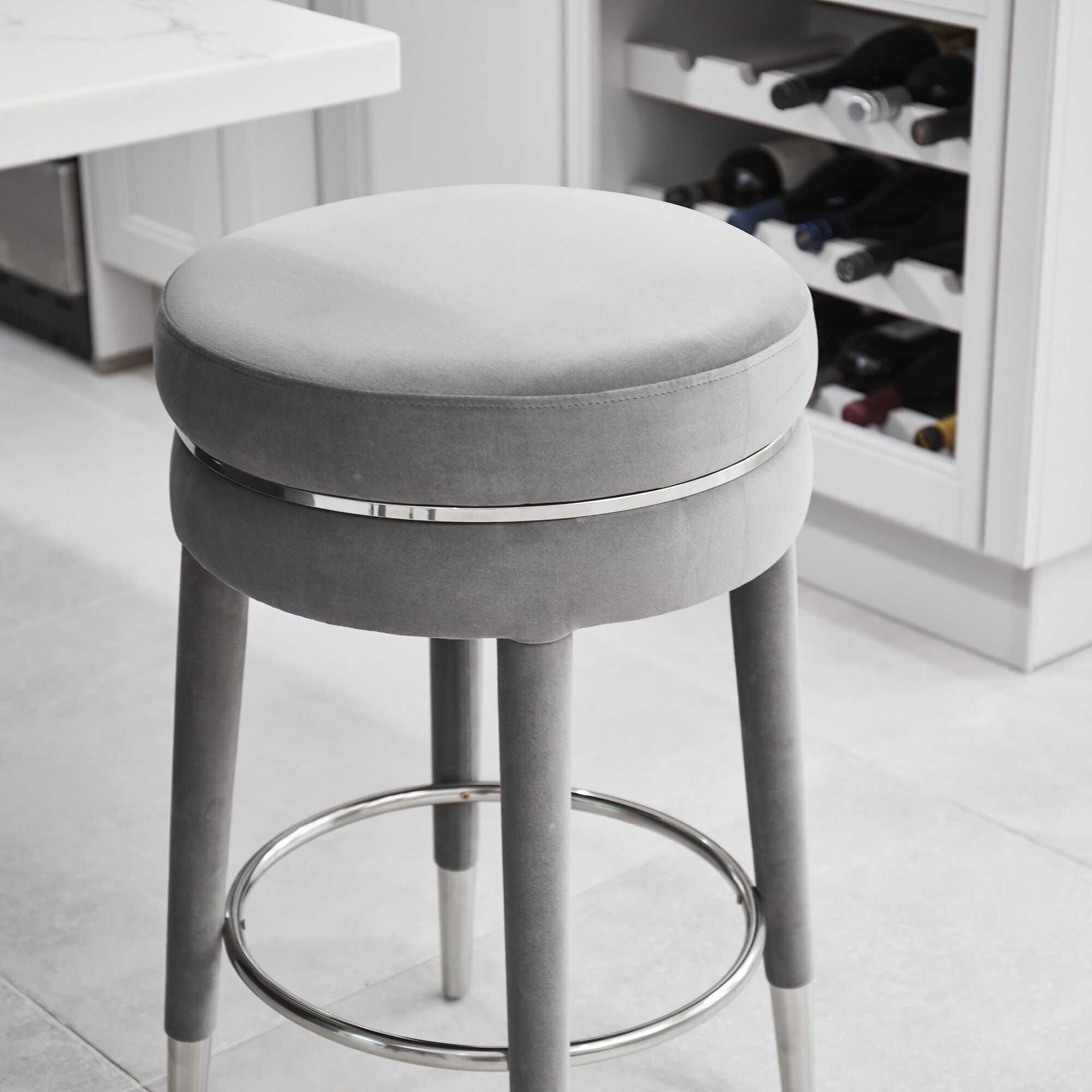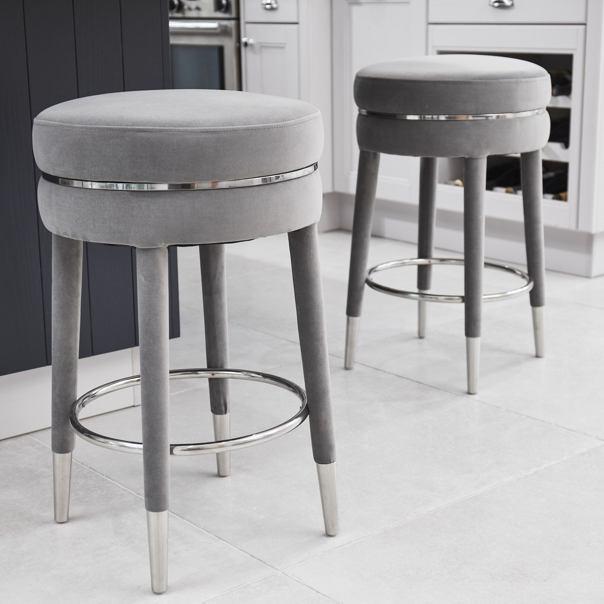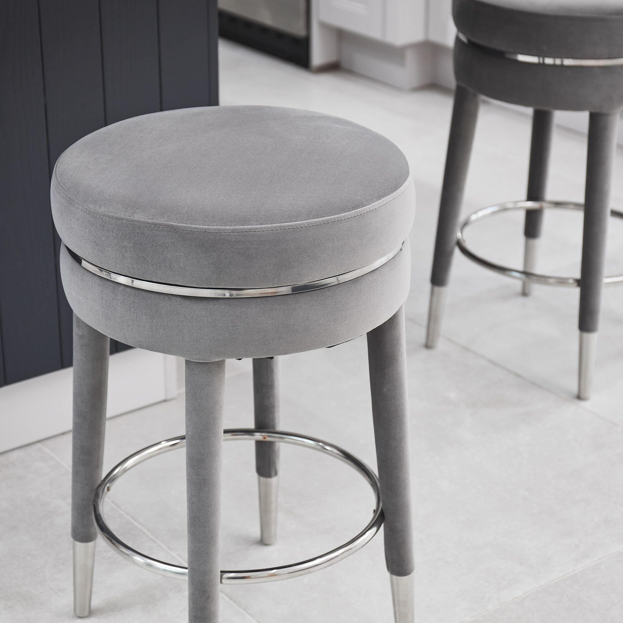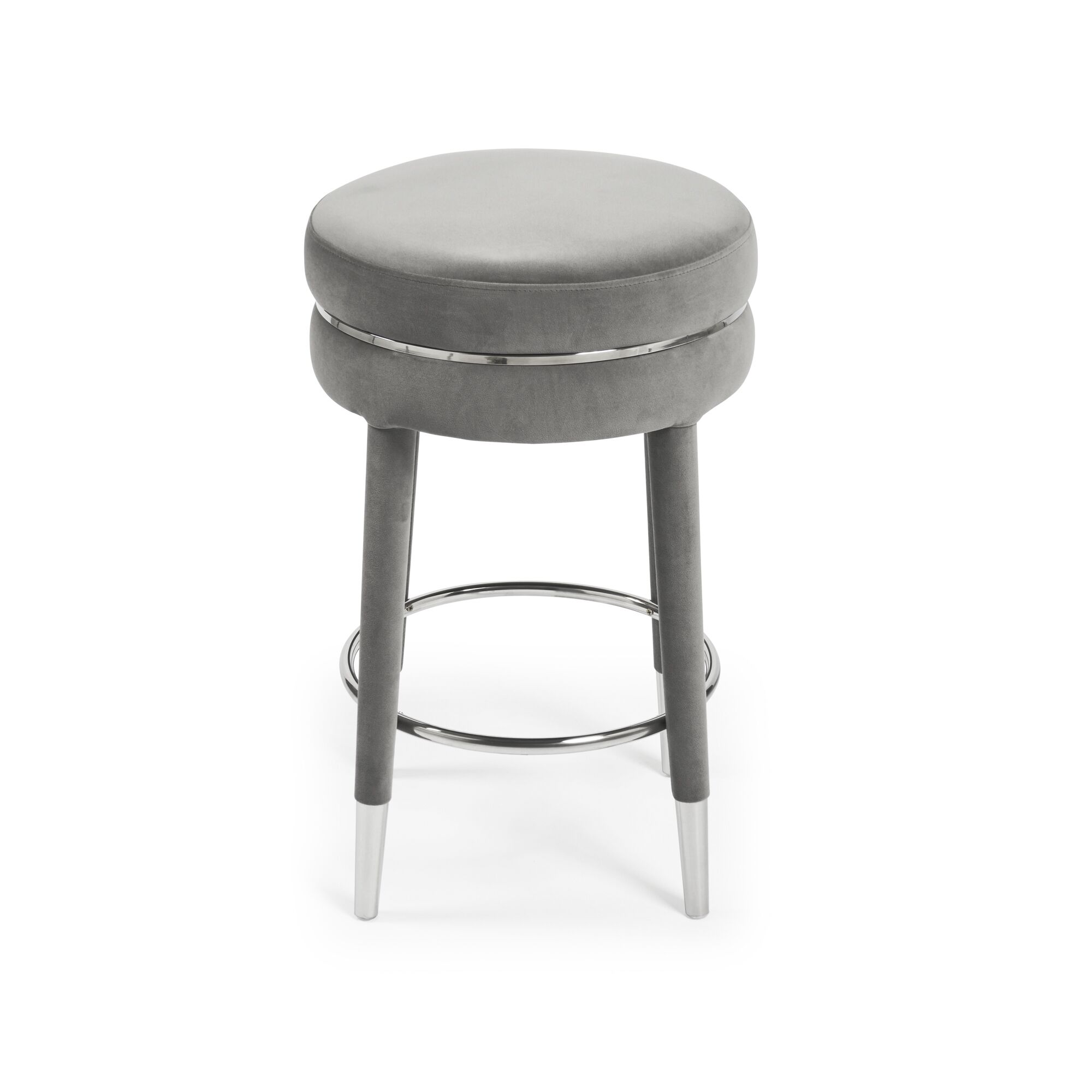 Our Isabel velvet stool, is simply elegant and is designed for comfort and shaped to entertain. Upholstered in a soft grey luxurious velvet, having stainless steel inlayed seat pad. The useful stainless steel foot rest is a circular design and the stool is finished with four stainless steel tipped feet at the base of the velvet elegant tapered legs. This stool is certainly and eye catcher.