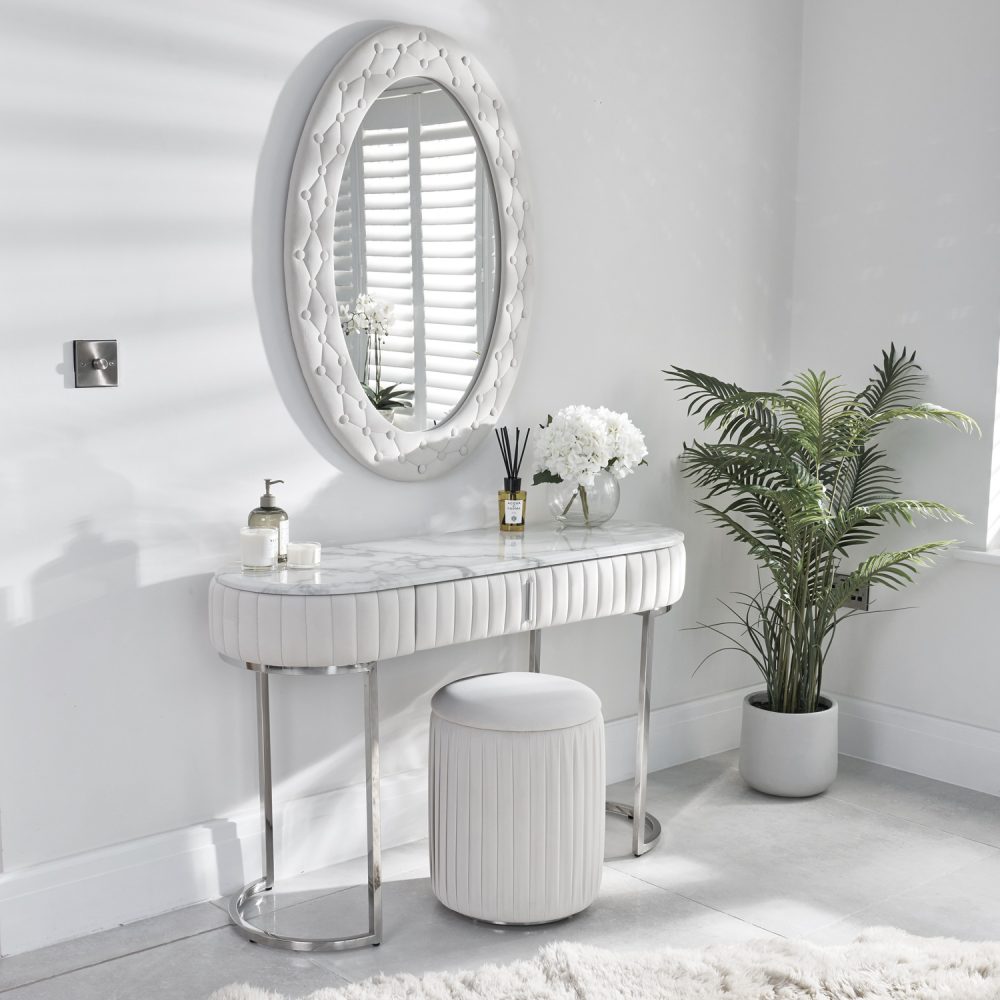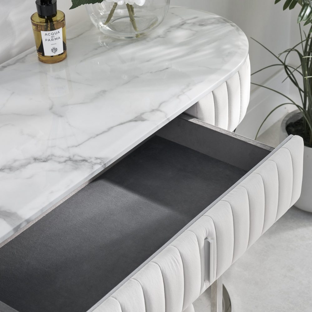 A masterpiece of contemporary Italian design, this exquisite dressing and console table set exudes sophistication. Featuring a quilted ivory cream velvet frame on a sleek polished steel base, it is topped with a striking white and grey faux marble oval surface. A fabric-lined drawer with a silver handle ensures effortless functionality. Complete with a matching upholstered stool and an intricately carved mirror, this handcrafted set brings elegance and versatility to any modern interior.