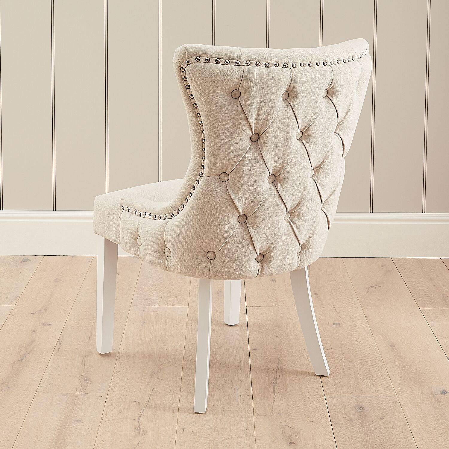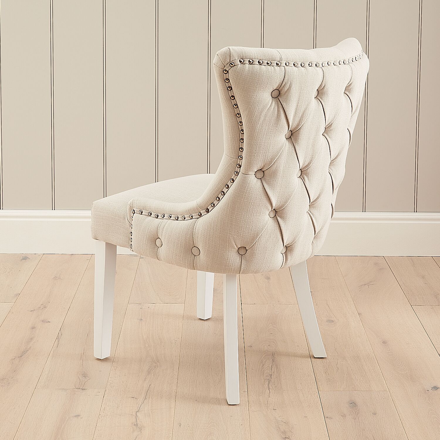 This lovely wing back dining chair boasts a supportive backrest with quilted button detailing. It is finished with four white painted solid wooden legs and upholstered in a soft yet durable natural linen fabric, which is easy to clean thanks to our class-leading manufacturing techniques.