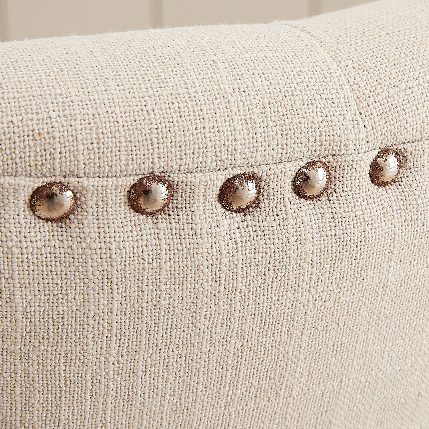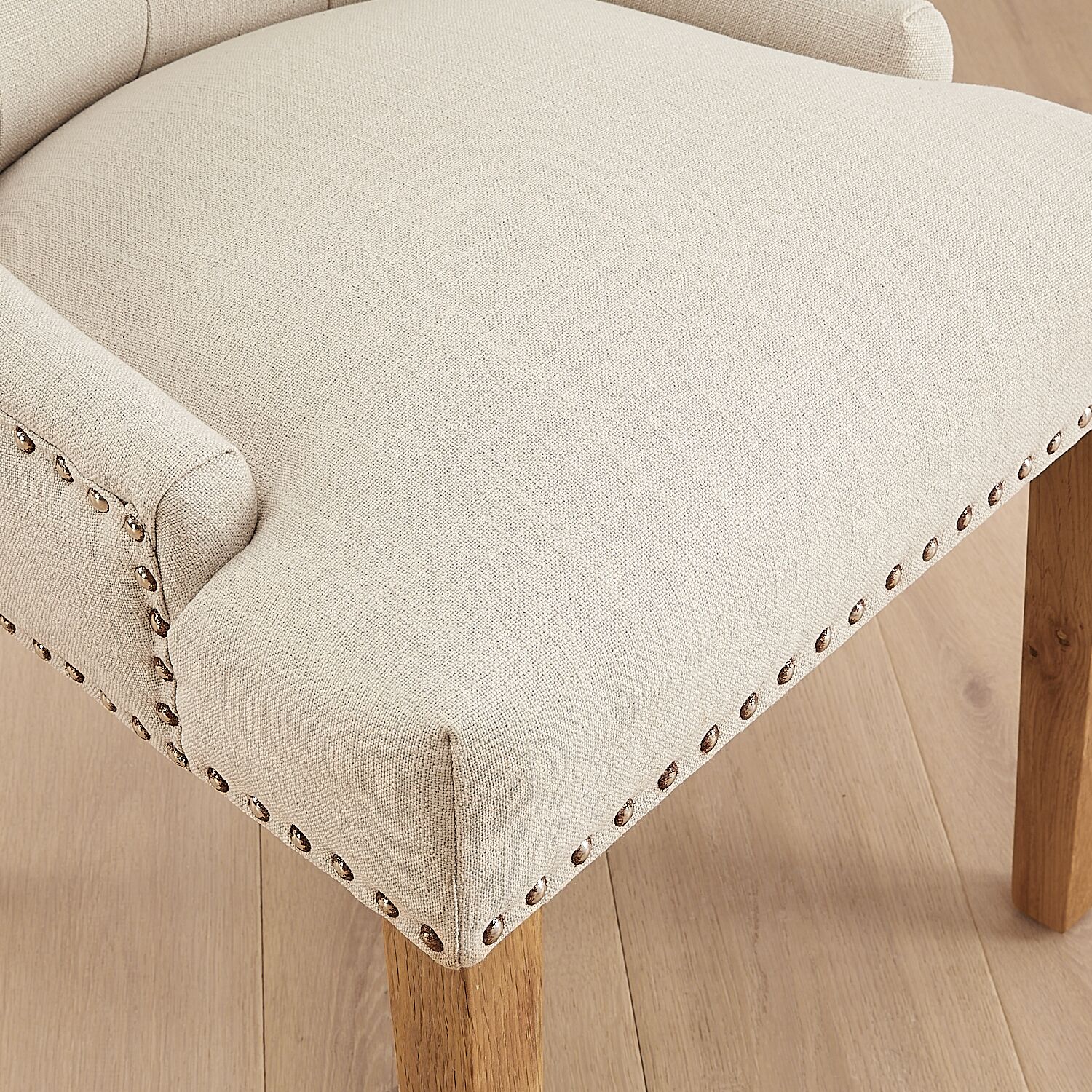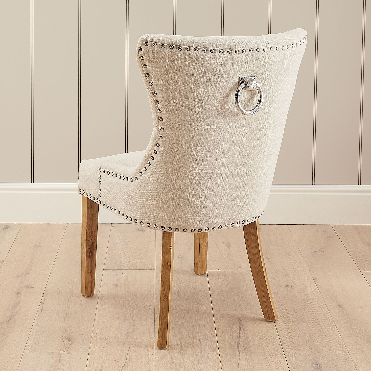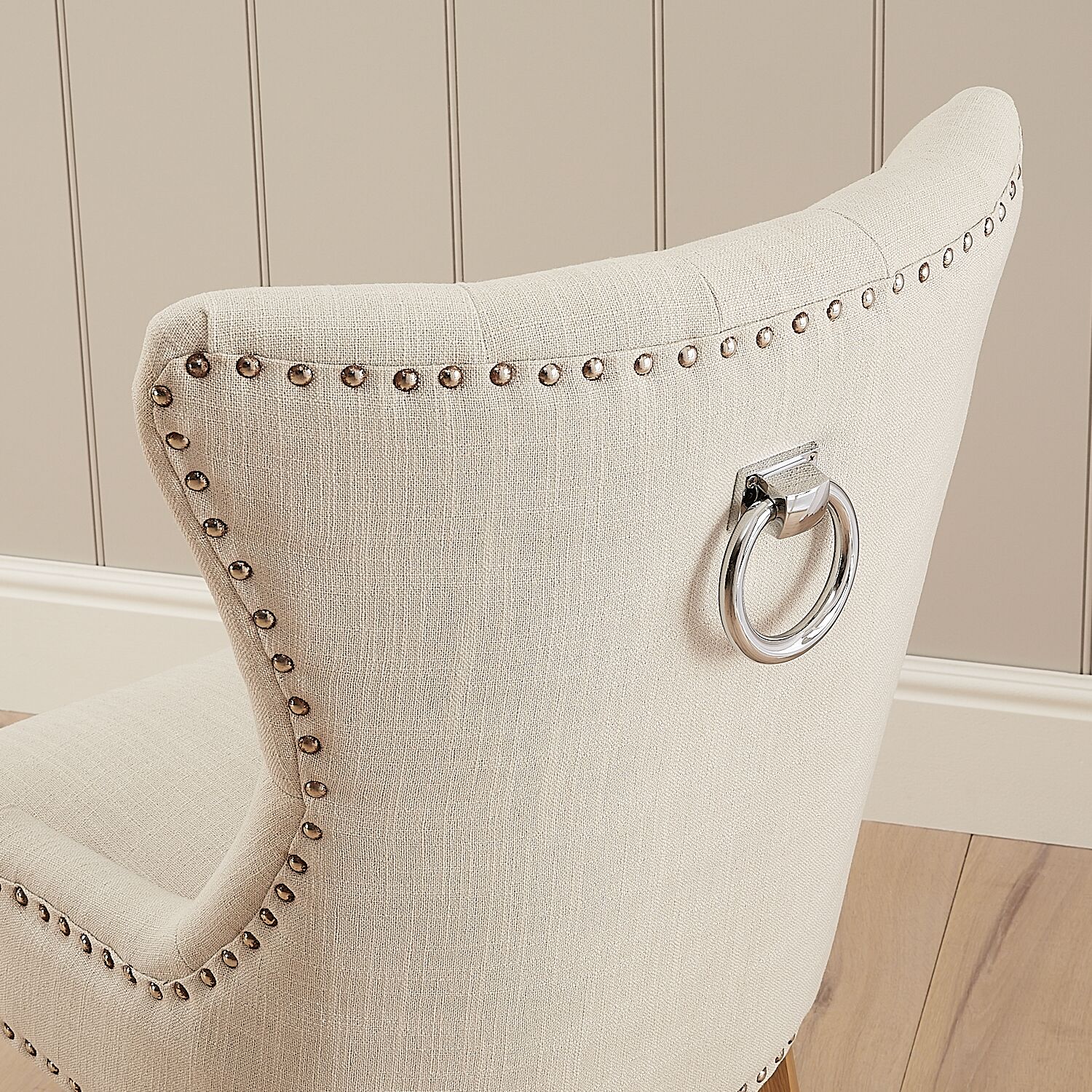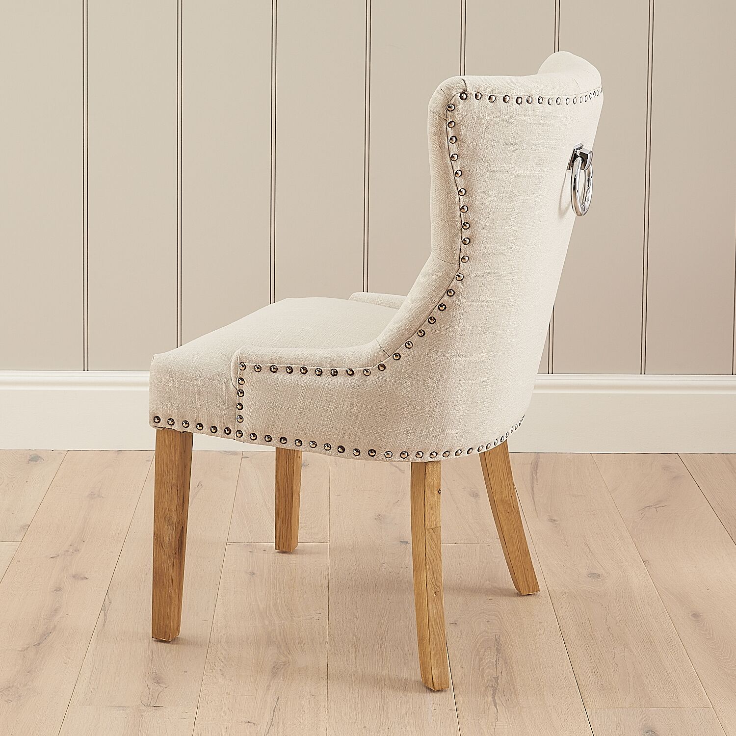 “Elegant Knightsbridge wing back dining chair in natural linen. Sold as a second due to rusted studs, heavily discounted to just £69.”