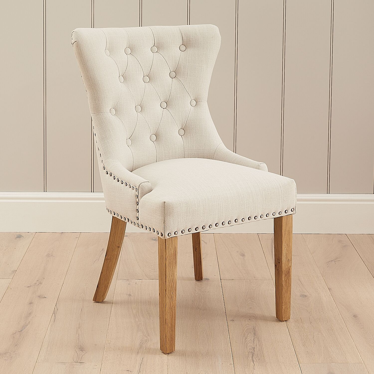 This lovely wing back dining chair boasts a supportive backrest with quilted button detailing. It is finished with four solid Oak legs and upholstered in a soft yet durable natural linen fabric, which is easy to clean thanks to our class-leading manufacturing techniques.