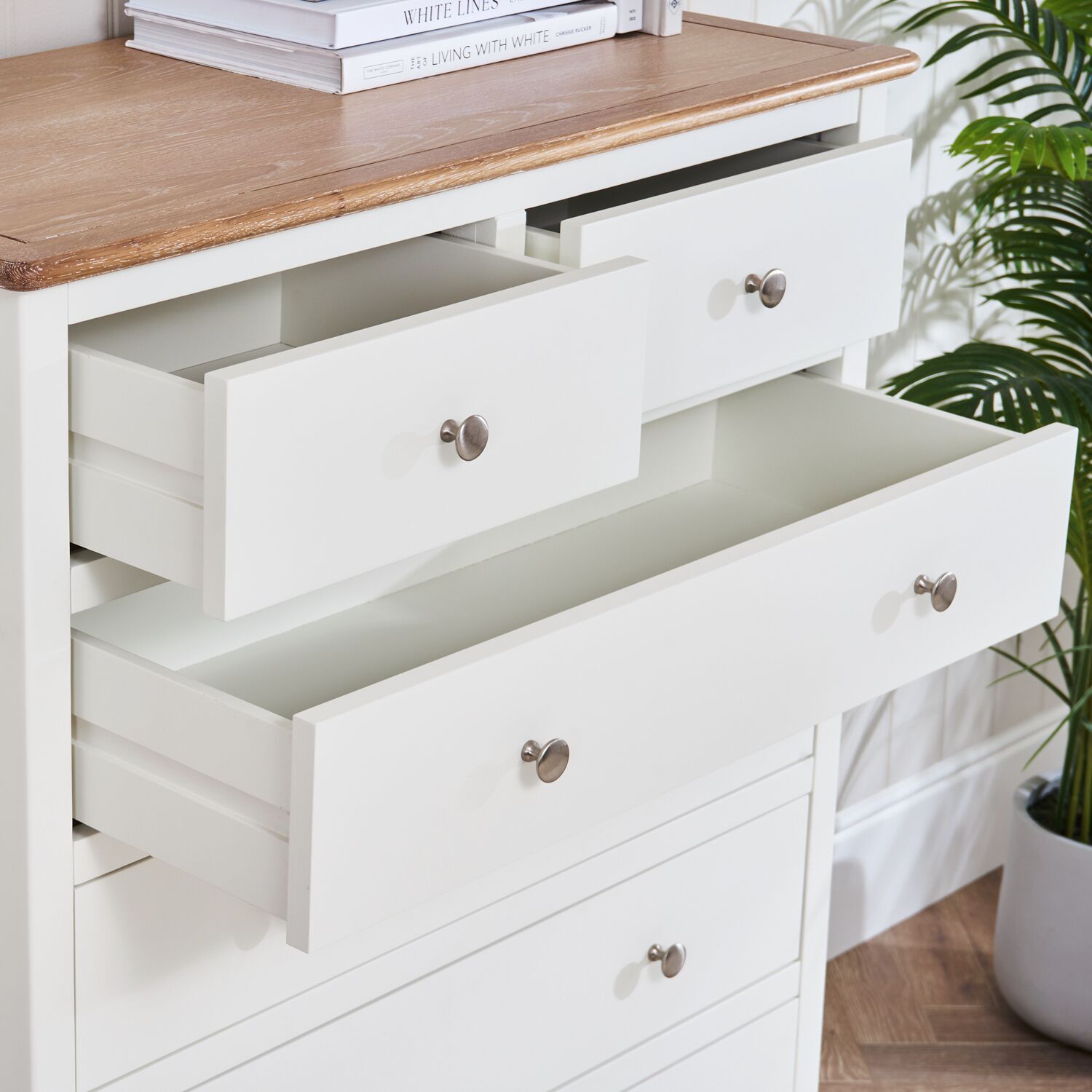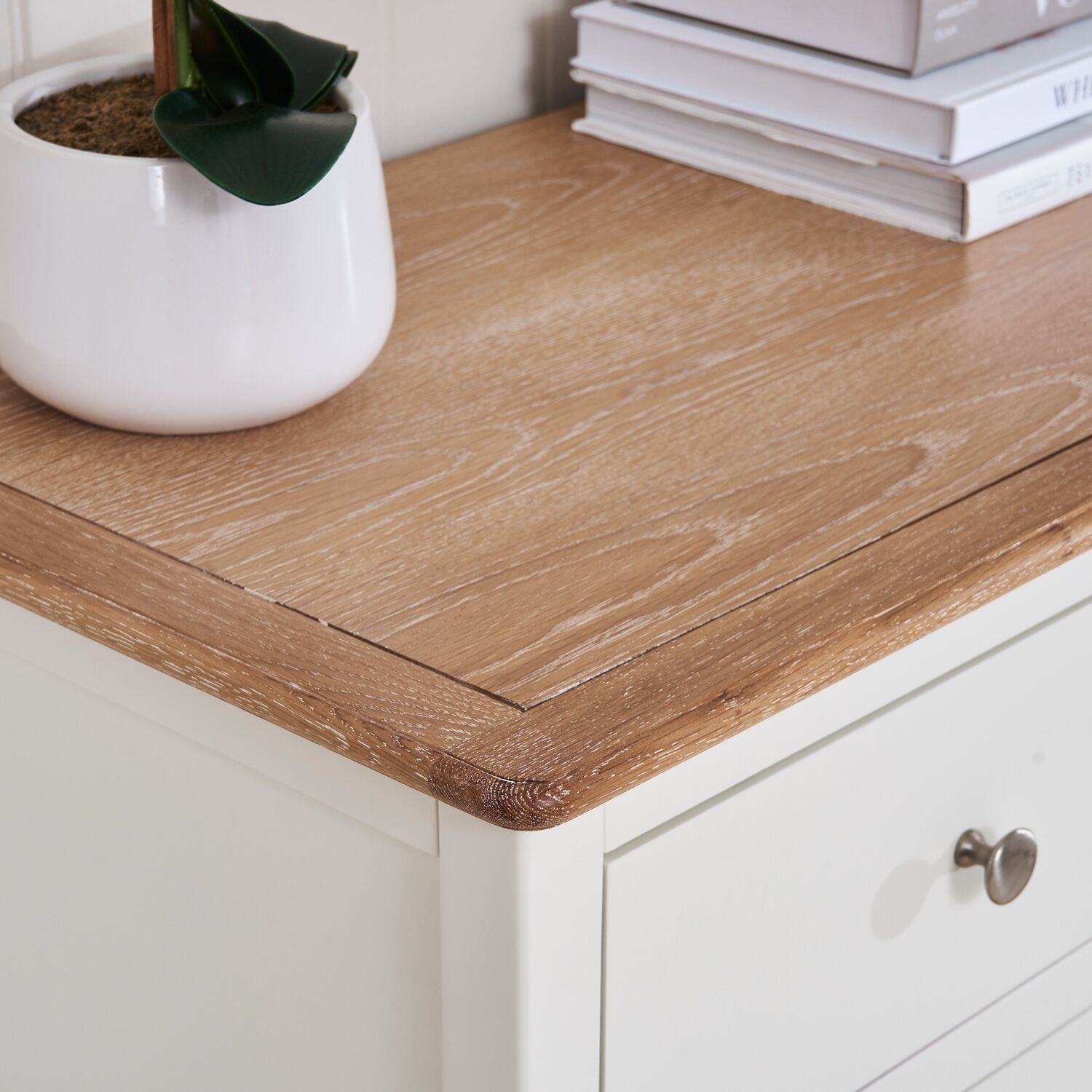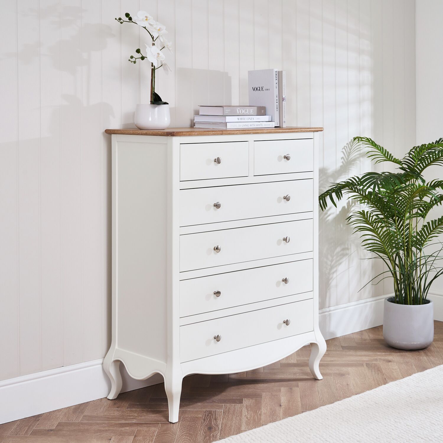 This exquisite French-style chest of drawers seamlessly blends timeless elegance with modern functionality. The soft white-washed oak top contrasts beautifully with the painted base, creating a refined yet versatile look that complements both classic and contemporary interiors.