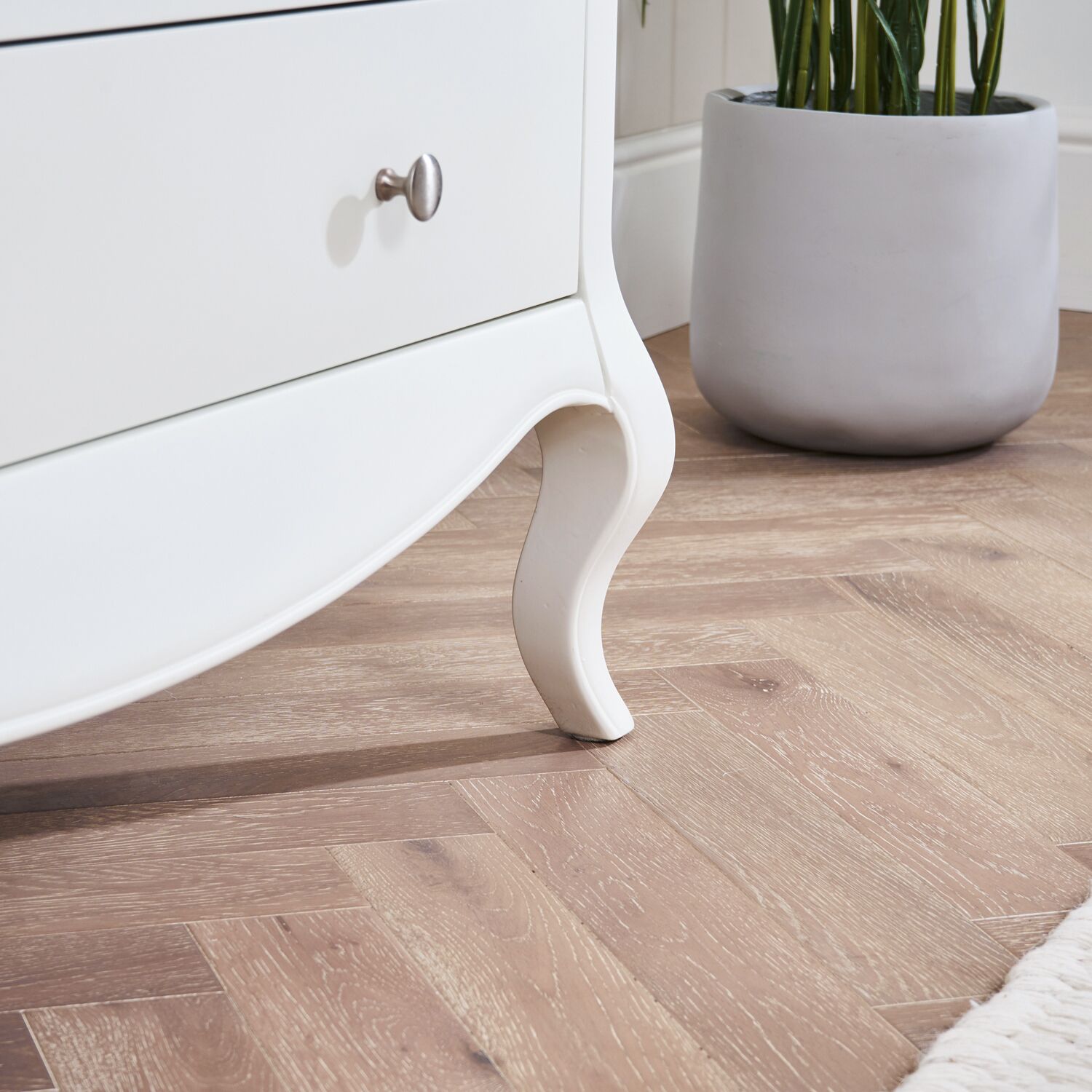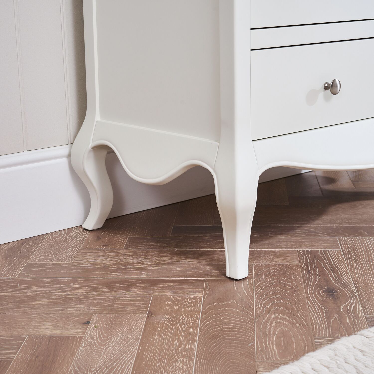 This French-style painted chest of drawers is a stunning addition to our new Lille collection. It features a two over four drawer design, each drawer a solid brushed steel handles. The chest is elegantly supported by four cabriole carved legs, offering both beauty and functionality.