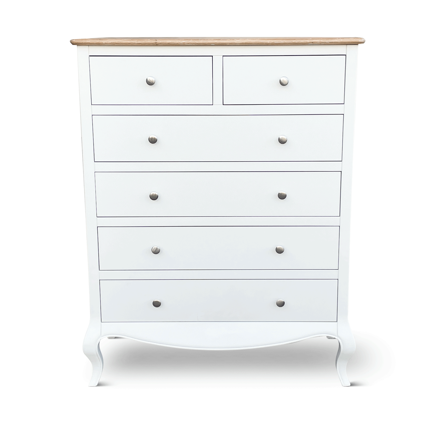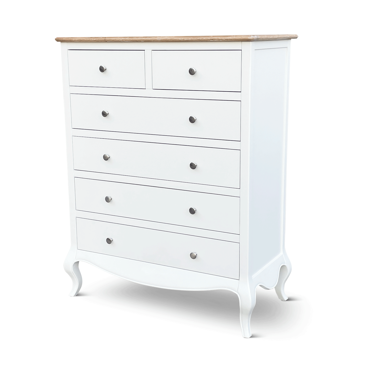 With a thoughtfully designed two-over-four drawer layout, this piece offers ample storage while maintaining an air of sophistication. The solid brushed steel handles enhance its vintage appeal, while the gracefully curved cabriole legs add a touch of French-inspired charm.