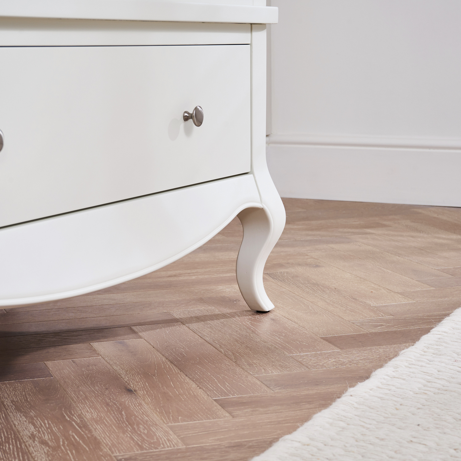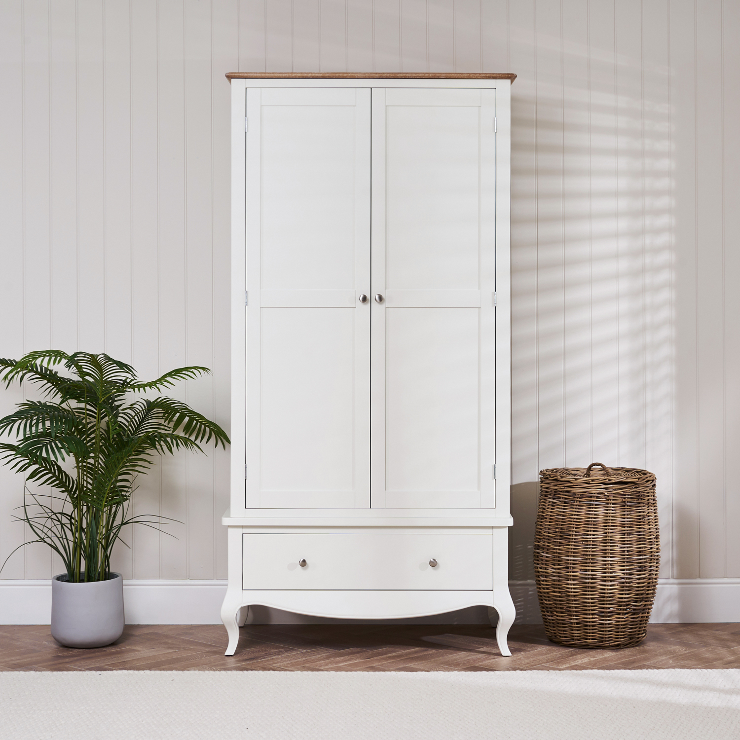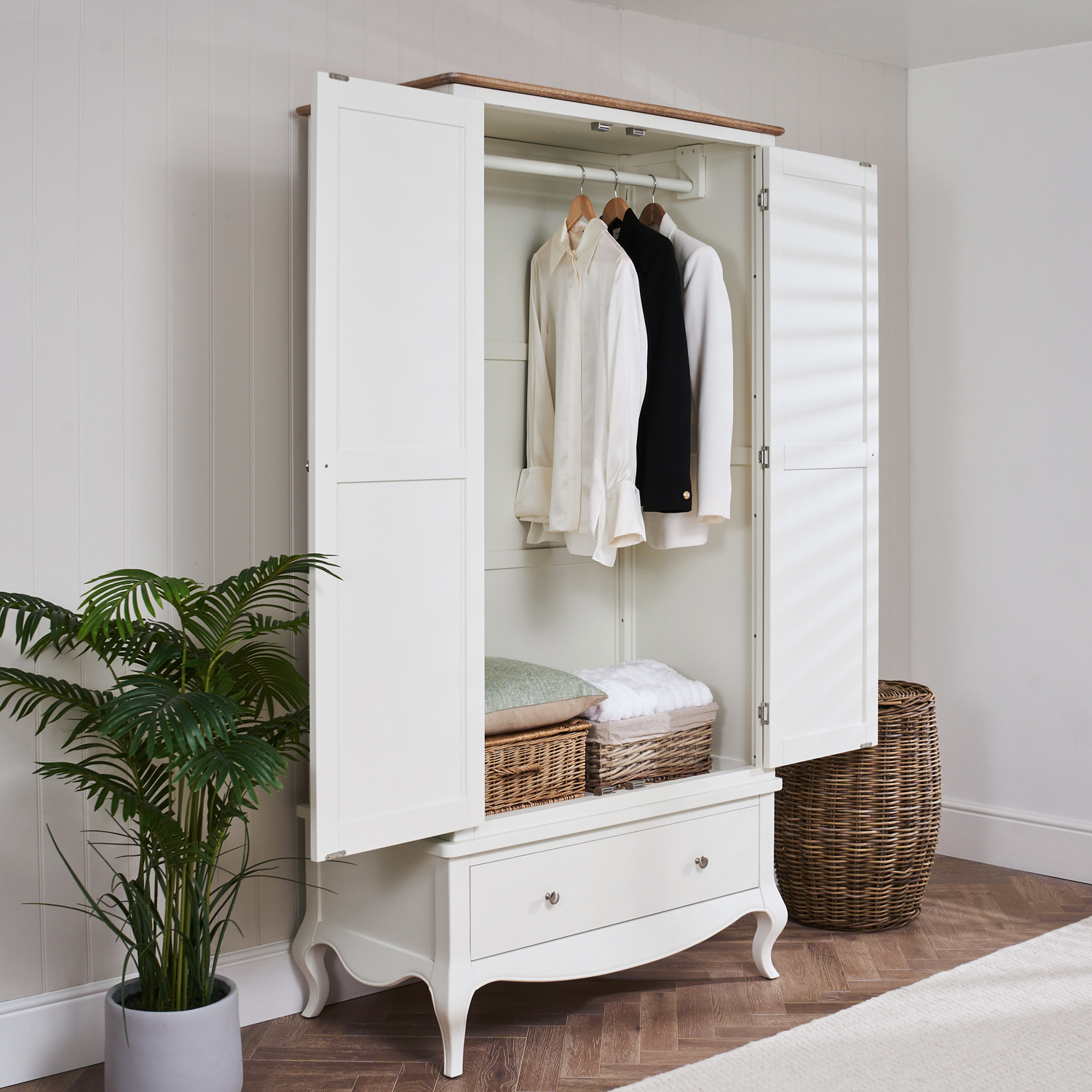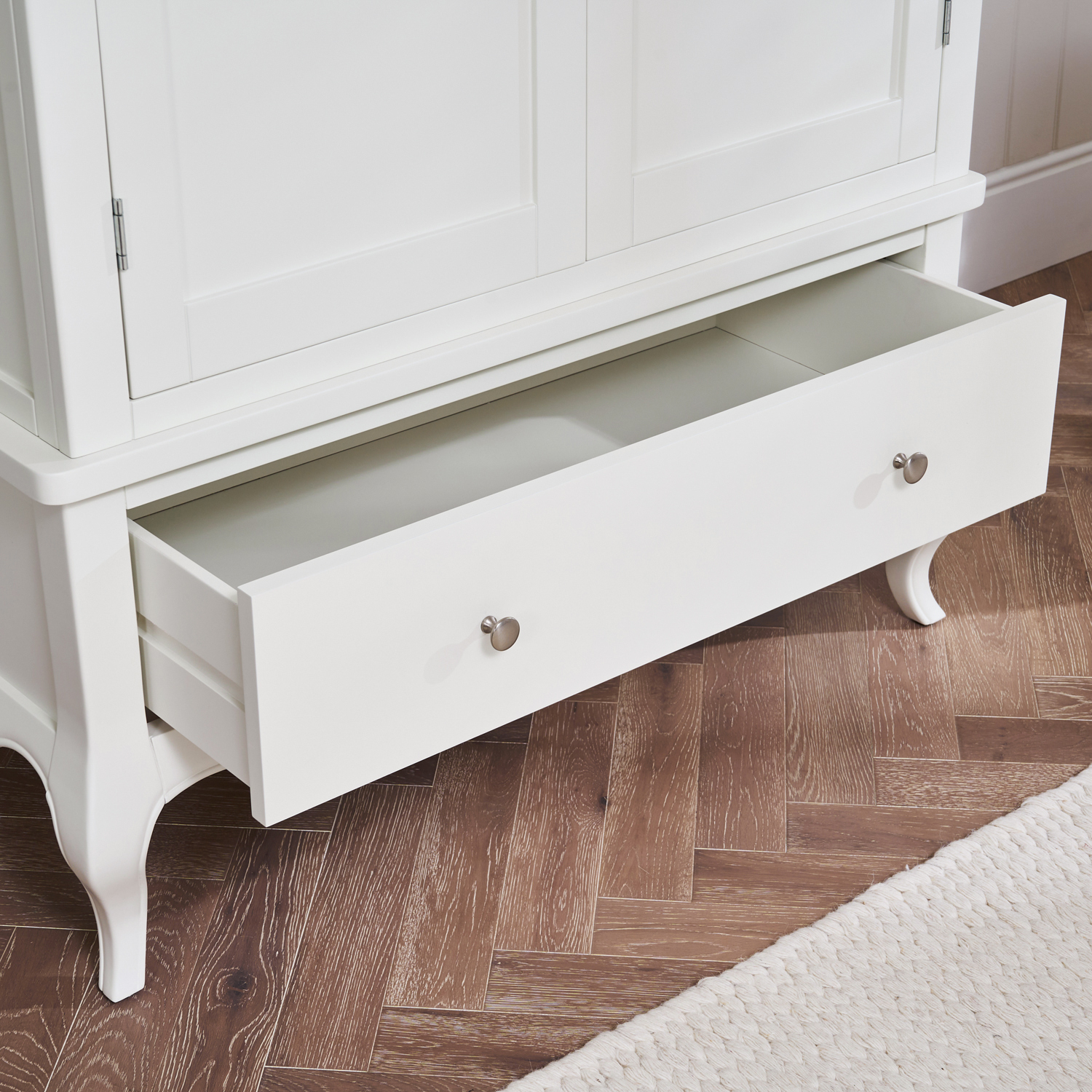 “A timeless addition to our new Lille Bedroom Collection, this French-style painted wardrobe exudes classic charm and practicality. Featuring two spacious doors and a generously sized drawer below, it offers ample storage for your clothing and essentials. Satin-brushed steel handles add a refined touch, while the gracefully carved cabriole legs enhance its elegant silhouette—bringing a touch of French sophistication to any bedroom.”