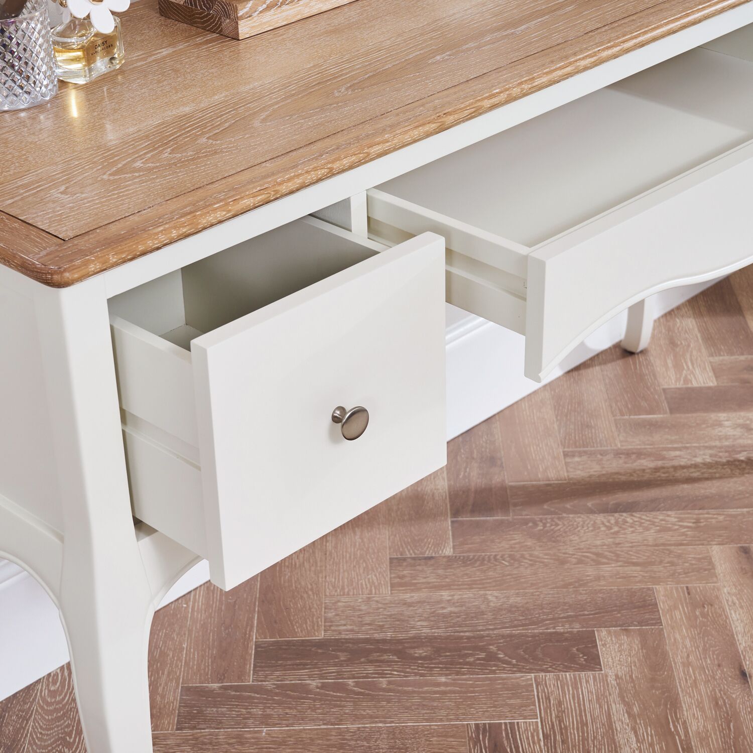 Designed with both beauty and function in mind, the table includes two spacious side drawers and a hidden central drawer—perfect for storing your everyday essentials. The chalk white finish adds a refined, vintage-inspired touch, making this set a true statement piece in any bedroom.
