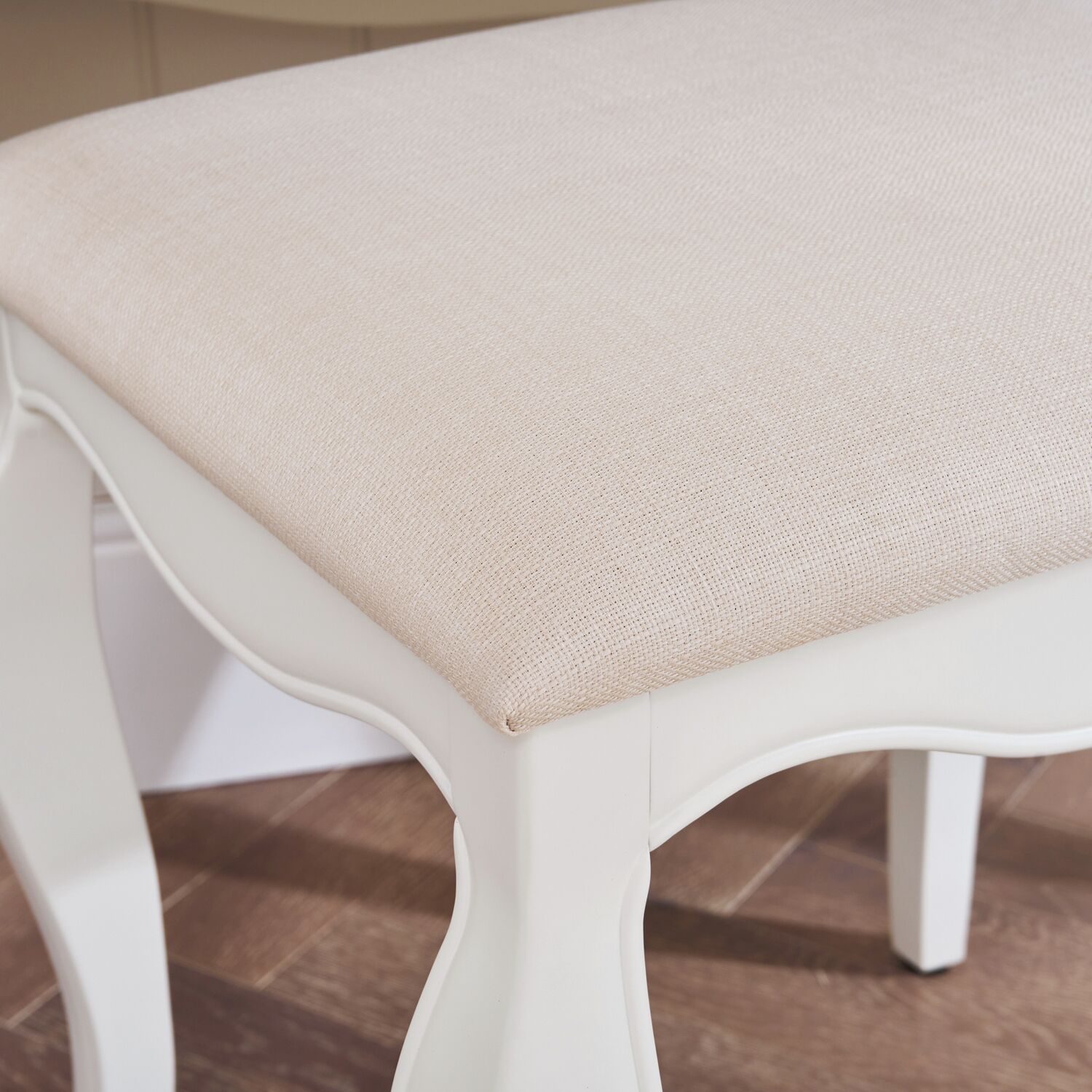 Completing the set is a matching stool with a cream linen fabric seat pad, offering both comfort and support. Its gracefully carved legs echo the table’s timeless design. Please note: mirror not included.