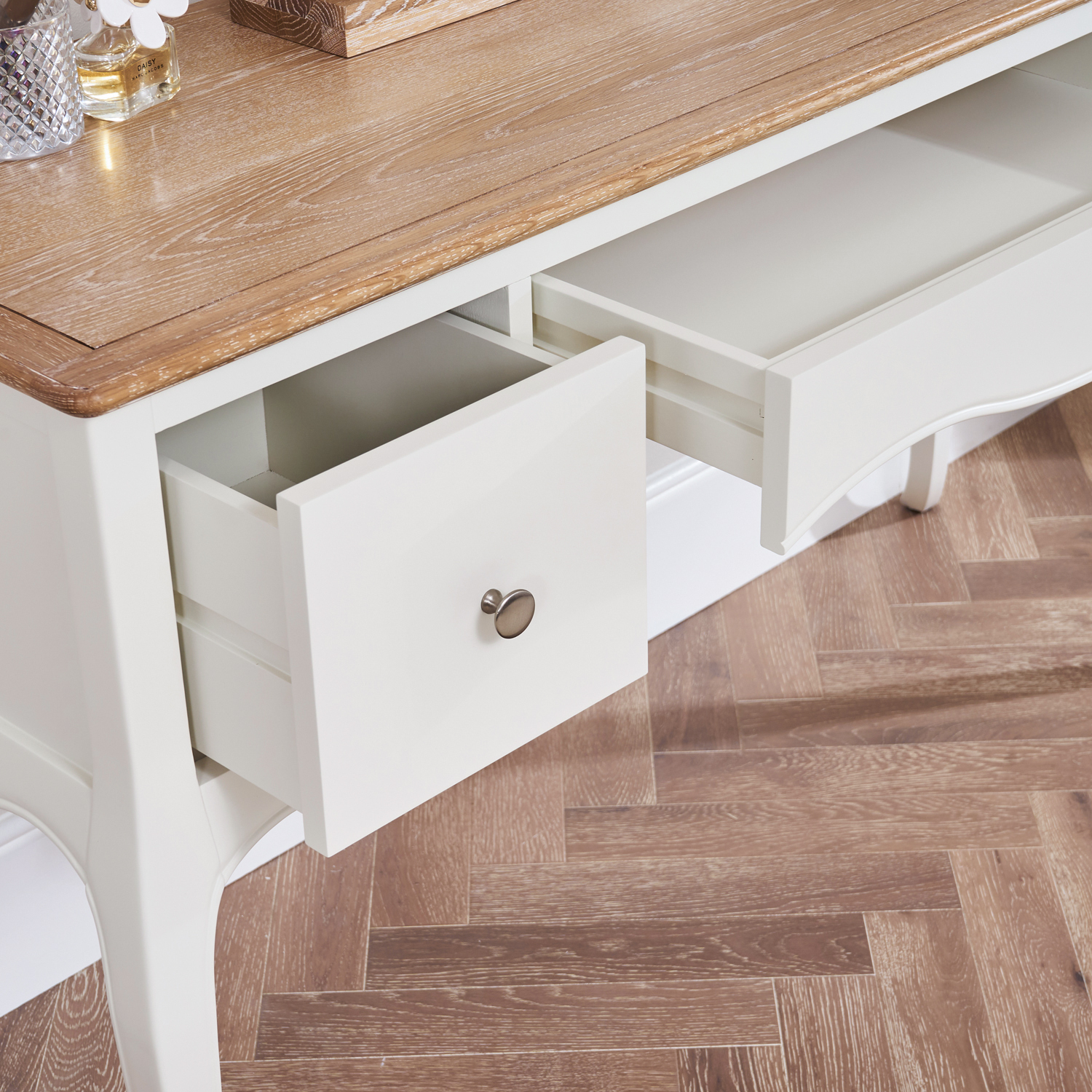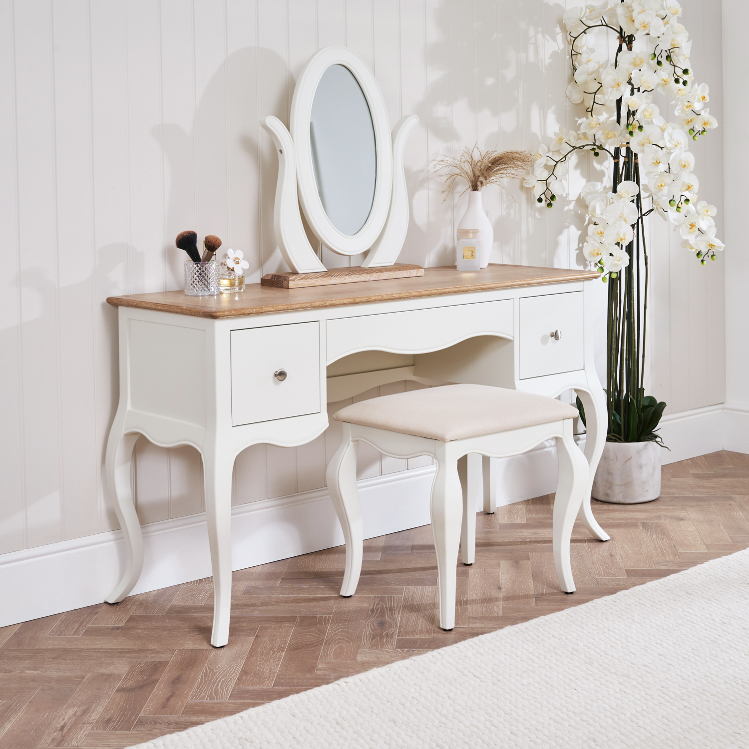 Elevate your bedroom with the timeless elegance of our French Painted Chalk White Dressing Table & Stool Set, part of the exclusive French Lille Collection. Expertly crafted and finished in a soft chalk white, this beautifully detailed piece features classic cabriole carved legs and satin black-painted French-style handles, blending traditional craftsmanship with contemporary charm.