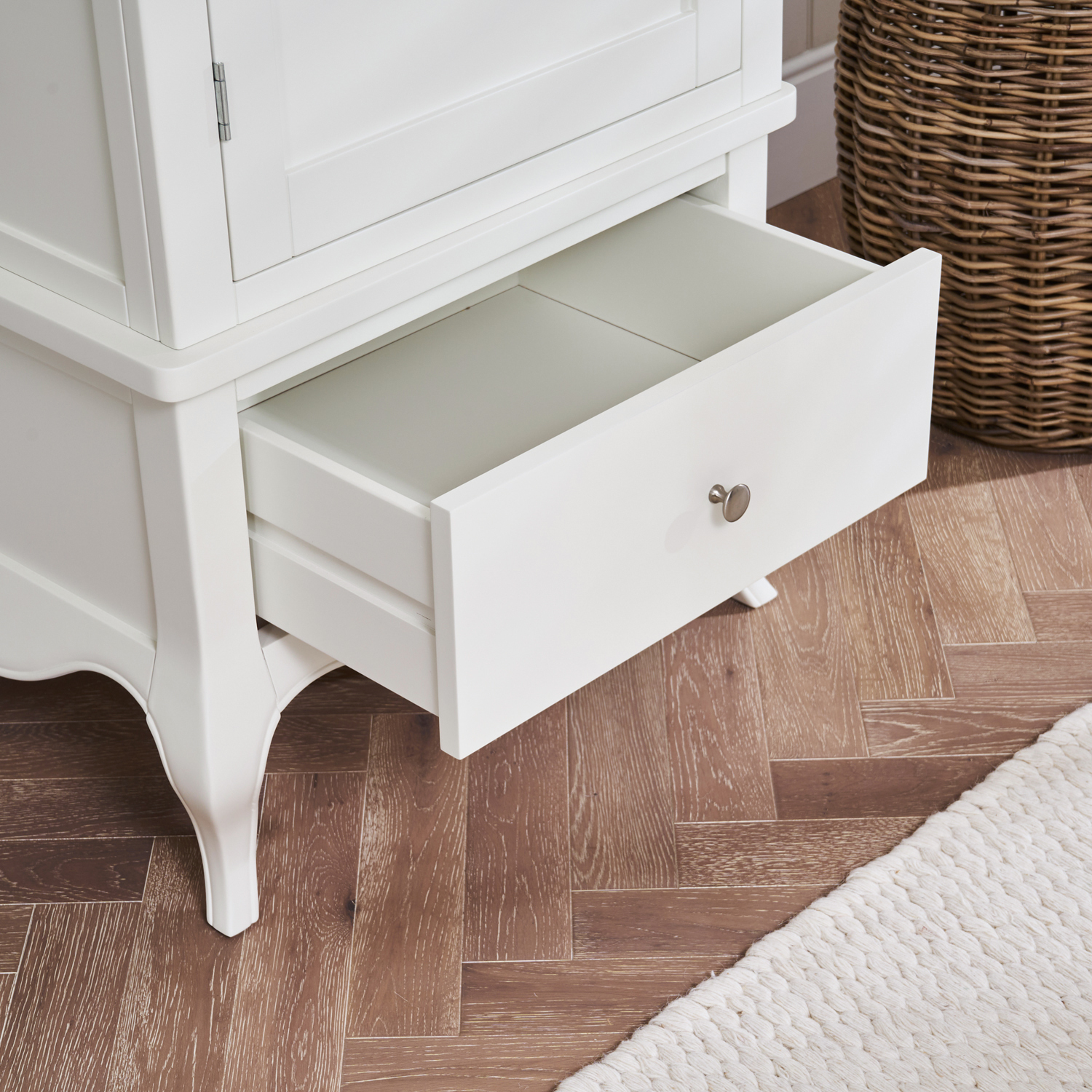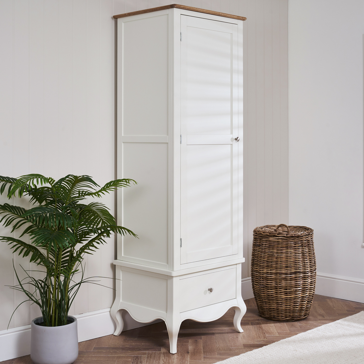 “A fantastic addition to our new Lille Painted Bedroom Collection, this French-style single wardrobe offers a perfect blend of style and functionality. Featuring one spacious door and a generously sized drawer below, it provides ample storage while maintaining a refined aesthetic. Resting on four intricately carved cabriole legs, this wardrobe brings timeless French charm to your bedroom.”