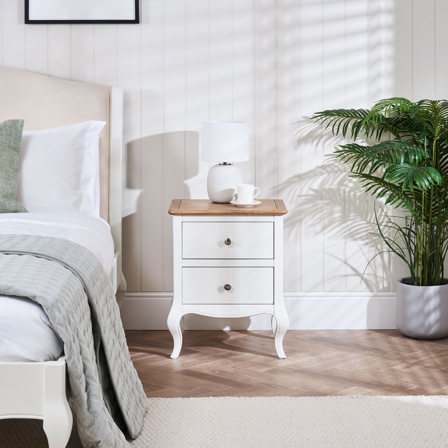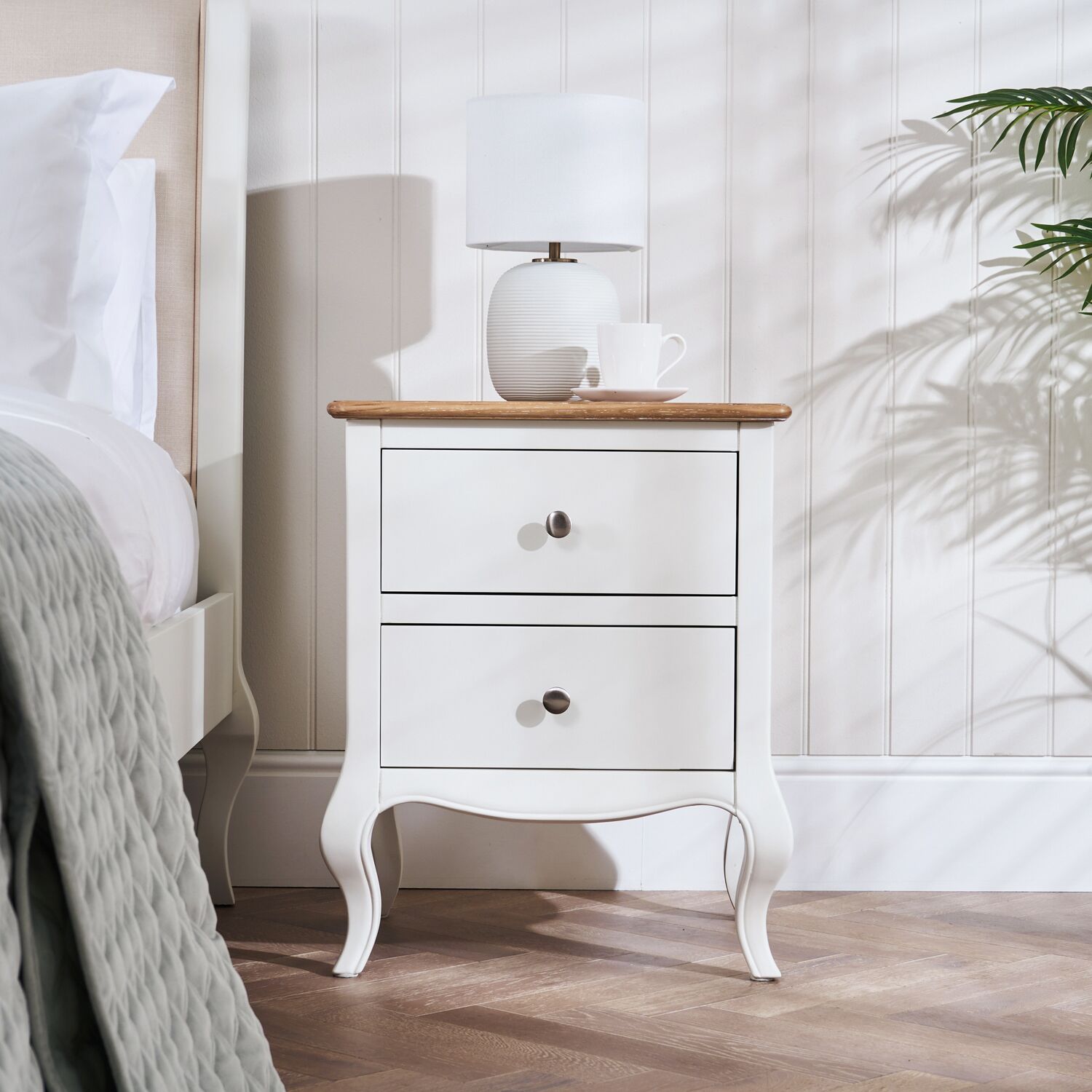 This French-style chalk white bedside table is a beautiful addition to our brand new Lille painted Bedroom Collection. It features two deep drawers, having a satin handle for a touch of elegance. The bedside table is gracefully supported by four cabriole carved legs, adding timeless charm to your bedroom.