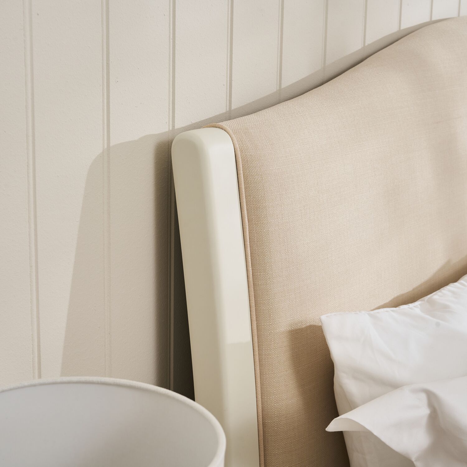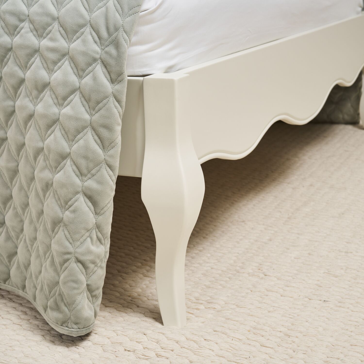 This handcrafted bed frame features a painted chalk white finish paired with a rich cream linen-upholstered headboard, offering a sophisticated yet fresh design that has made our Neoclassical French-style beds a standout in our collection. The low footboard enhances the frame’s subtle elegance, making it perfect for smaller bedrooms without feeling intrusive.