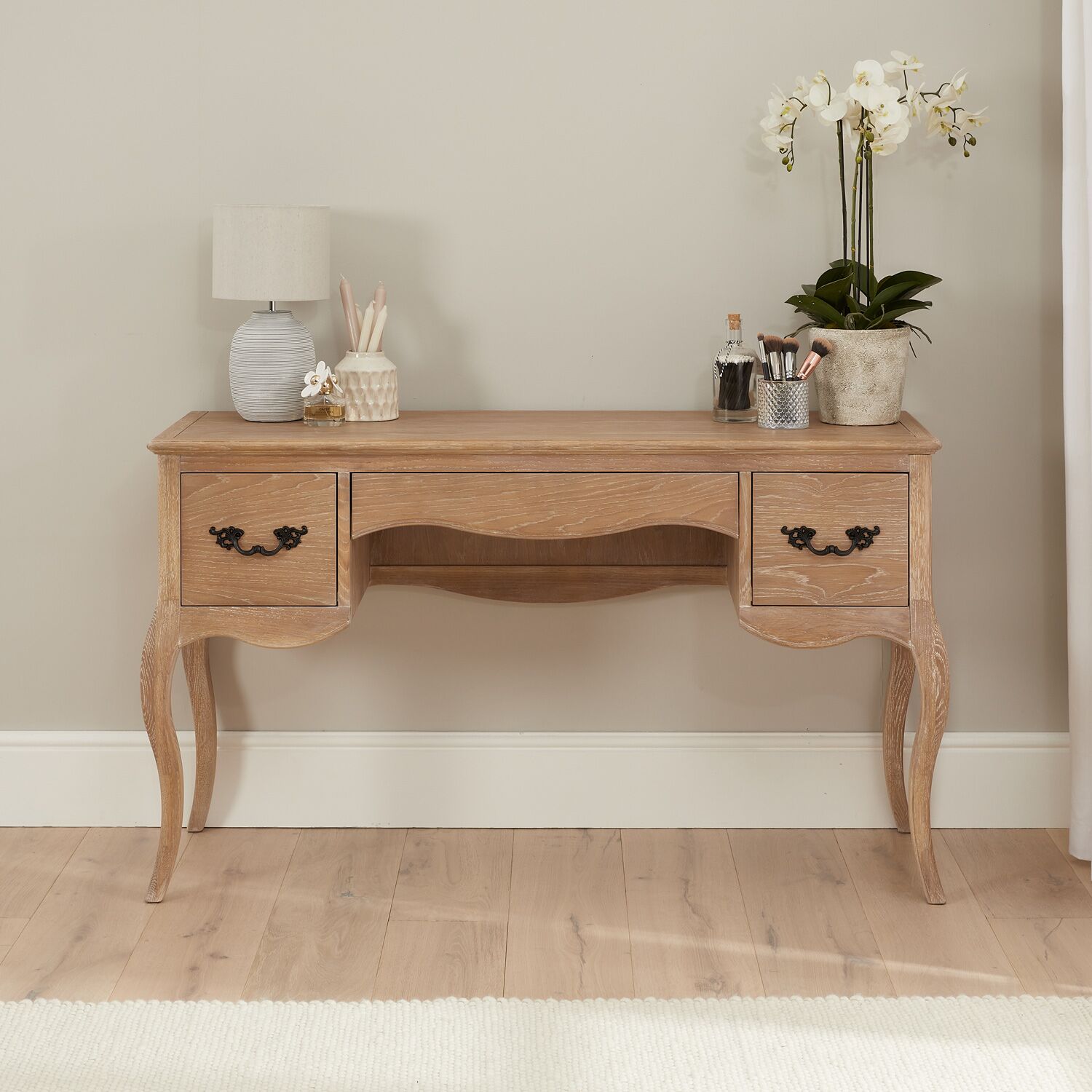 This French-style limed Oak dressing table is a stunning addition to our Lille Oak Bedroom Collection. Designed with elegance in mind, it features two spacious drawers on either side, each adorned with satin black-painted French-style carved handles. A hidden drawer in the center adds a touch of discreet storage, perfect for your valuables.