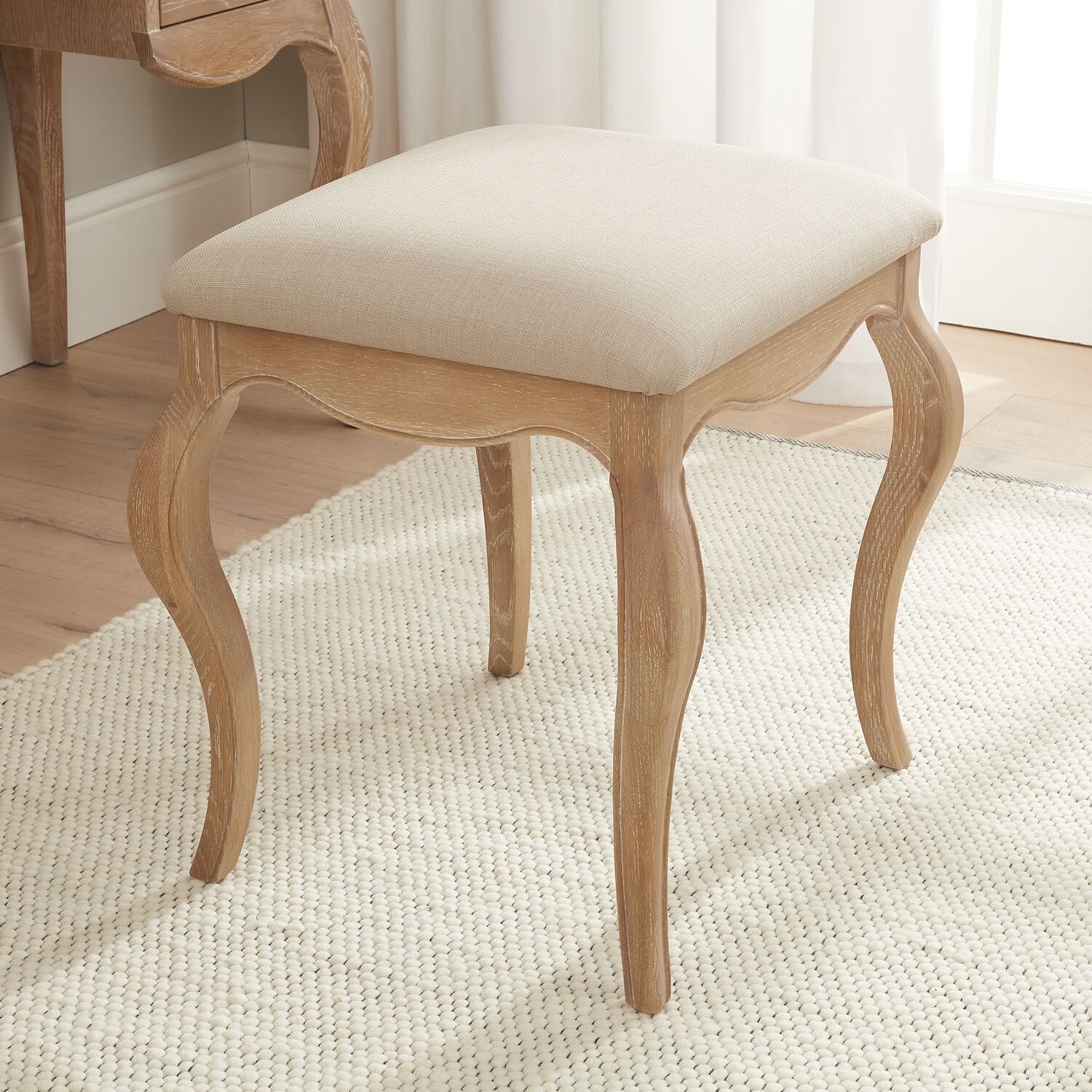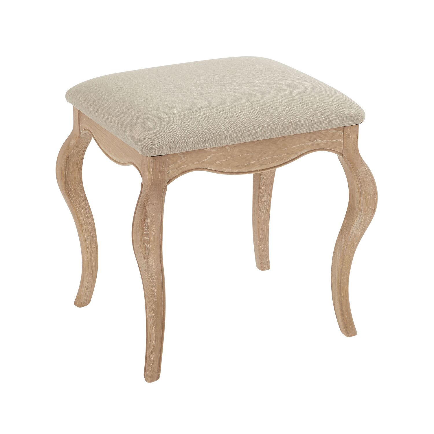 Included in the set is a coordinating limed Oak stool, featuring an Oatmeal linen fabric seat pad for comfort and support, resting on four gracefully carved legs.