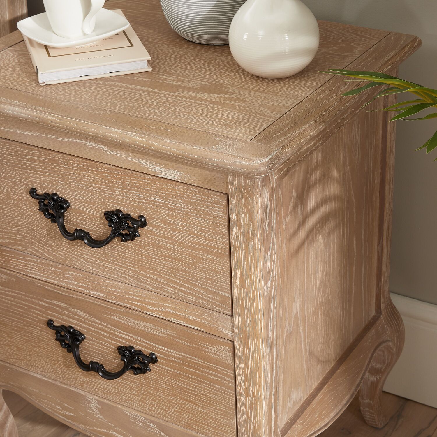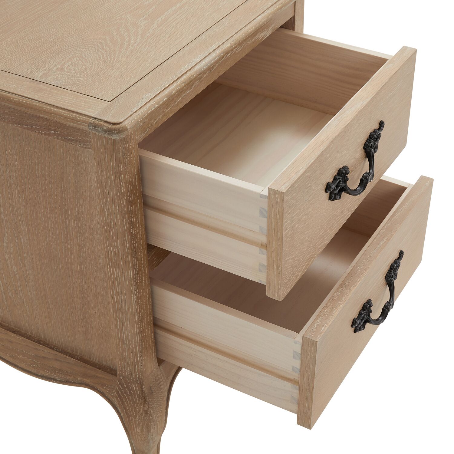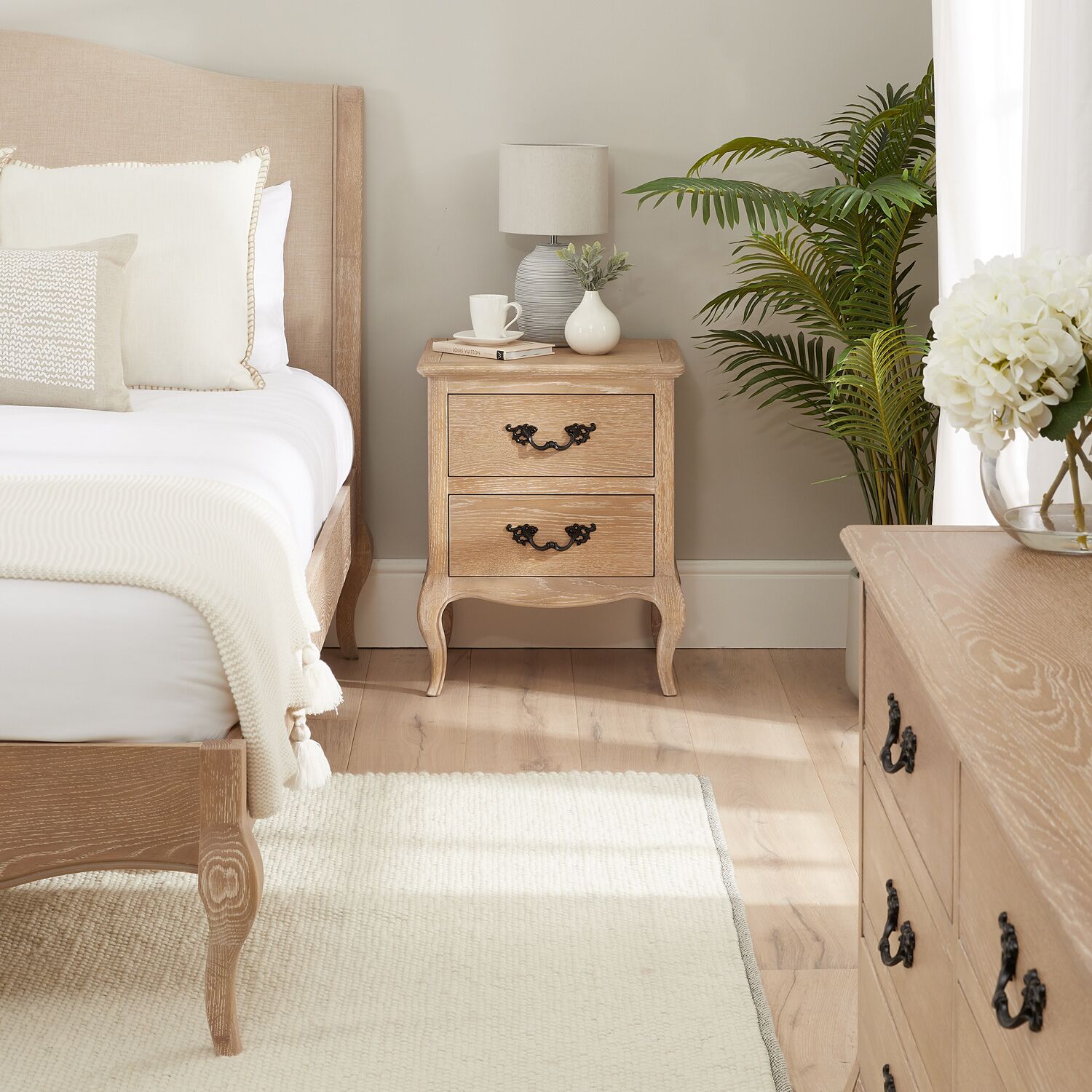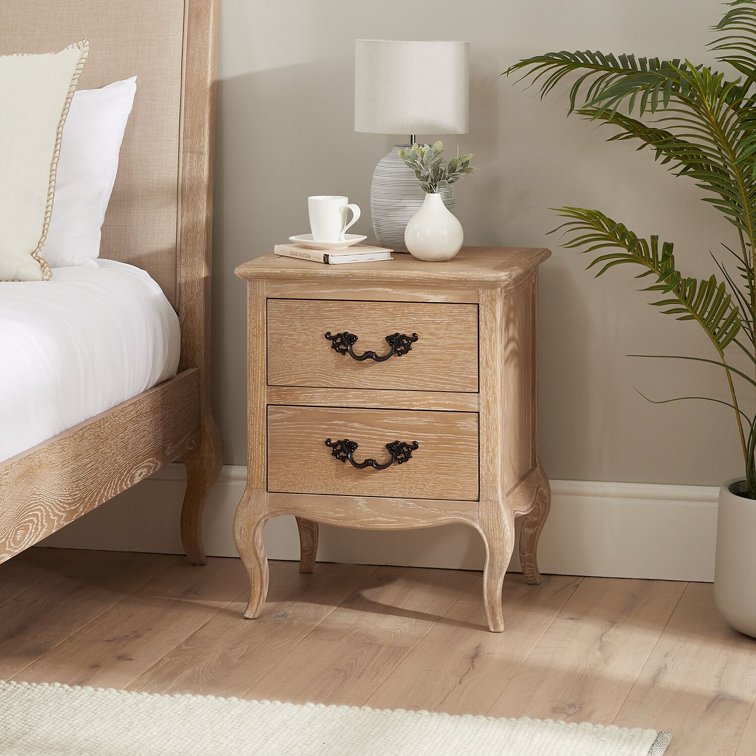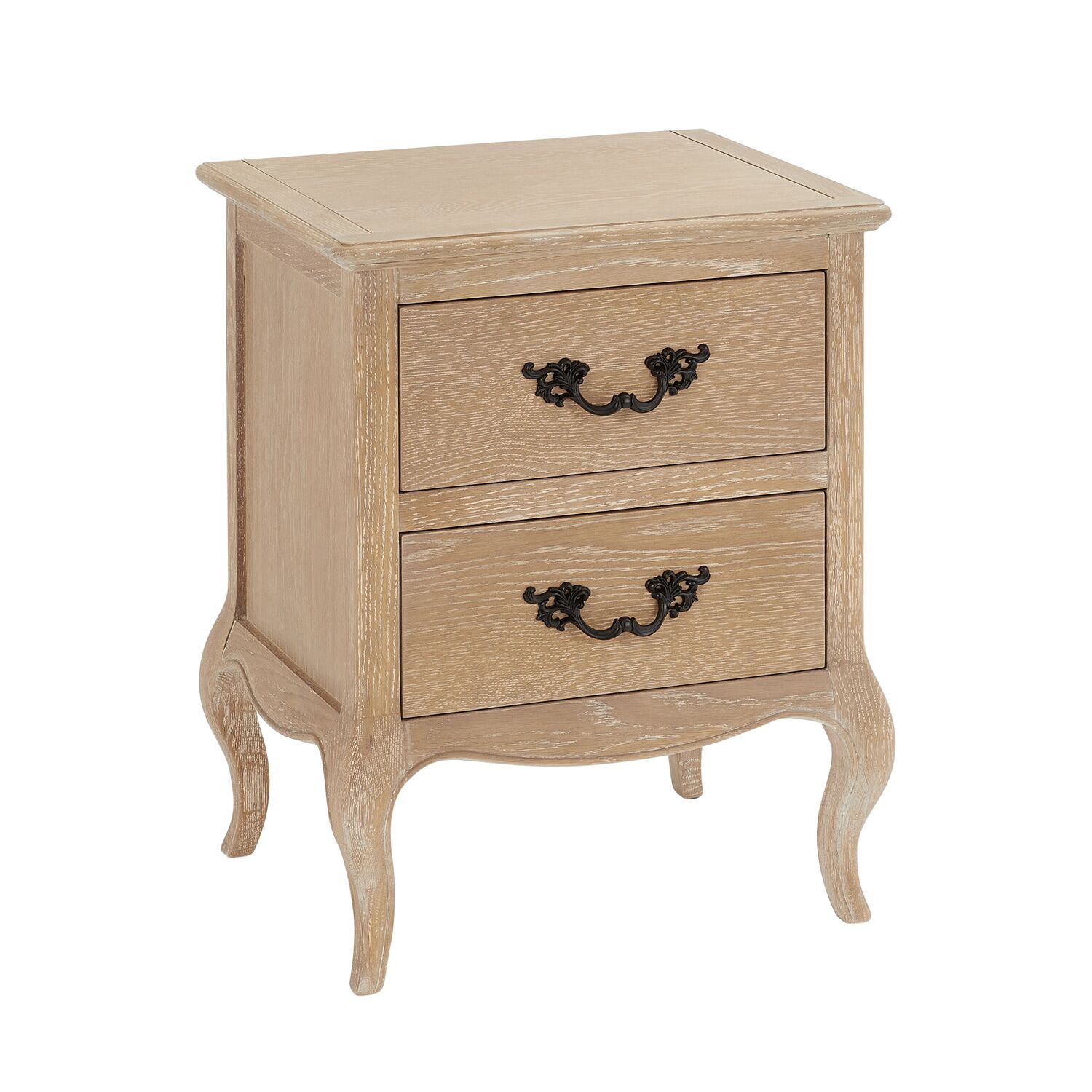 This French-style limed Oak bedside table is a beautiful addition to our Lille Bedroom Collection. It features two deep drawers, each with solid black satin-painted French-style carved handles for a touch of elegance. The bedside table is gracefully supported by four cabriole carved legs, adding timeless charm to your bedroom.