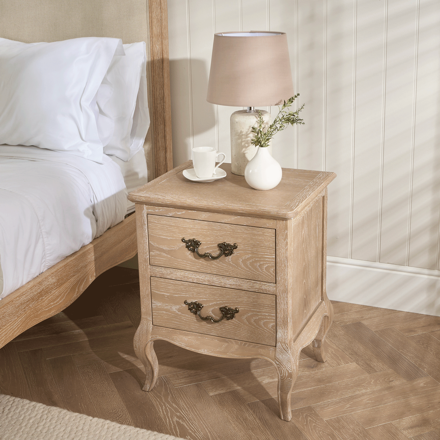 This French-style limed Oak bedside table is a beautiful addition to our Lille Bedroom Collection. It features two deep drawers, each with solid antique brass carved handles for a touch of elegance. The bedside table is gracefully supported by four cabriole carved legs, adding timeless charm to your bedroom.