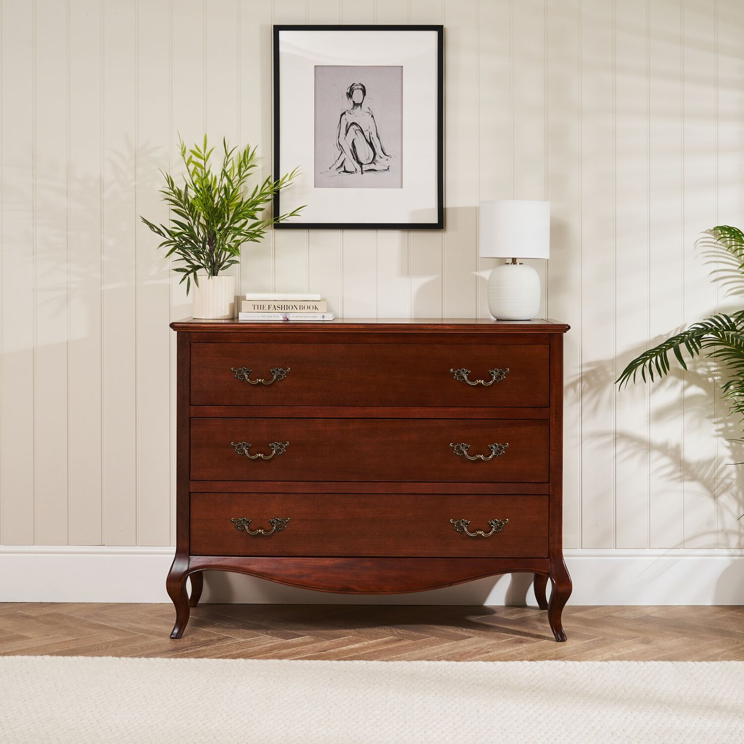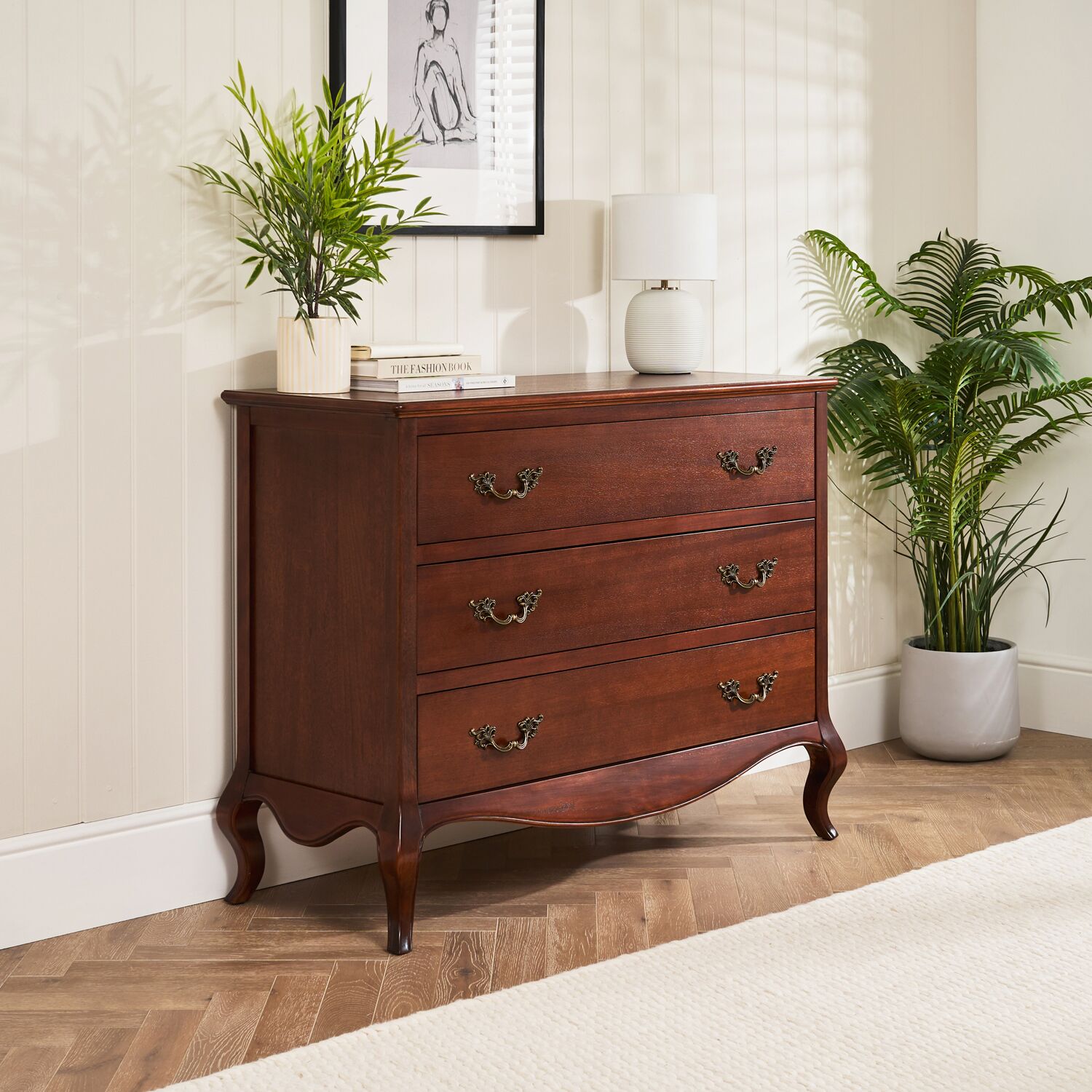 Introducing the beautifully designed French Mahogany Chest of Drawers, a stunning addition to our brand-new Lille Bedroom Collection. This chest features three spacious drawers, each fitted with solid brass French-style carved handles. Resting above four intricately carved cabriole legs, it adds timeless elegance to any bedroom.