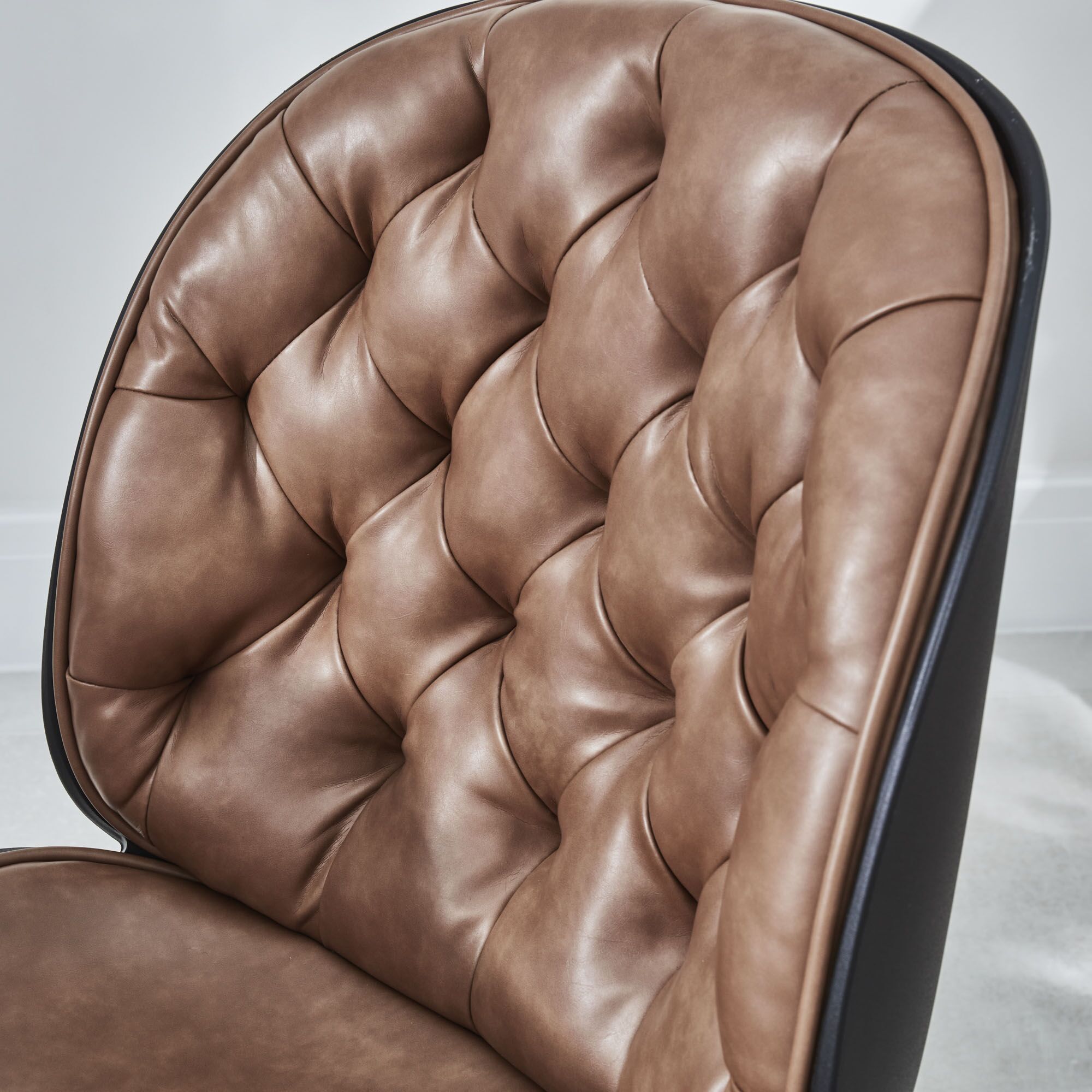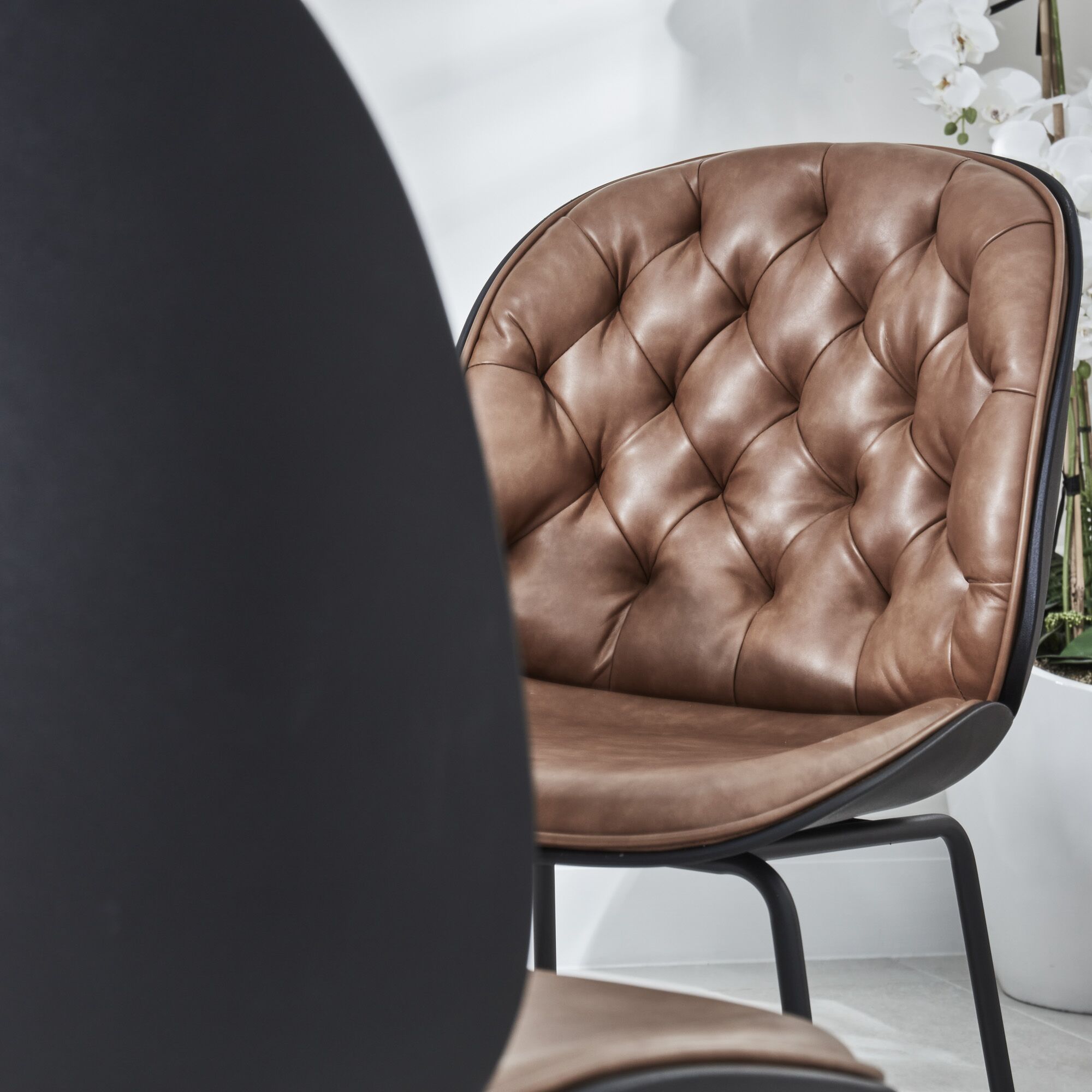 Show casing a Chesterfield style of upholstery around the external rear of the seat backrest, the highest of quality Tan PU with a fixed black Satin powder coated base.